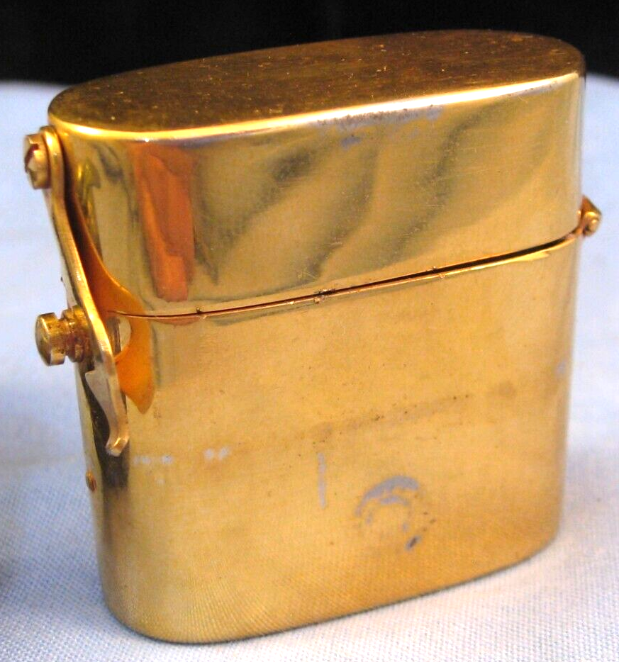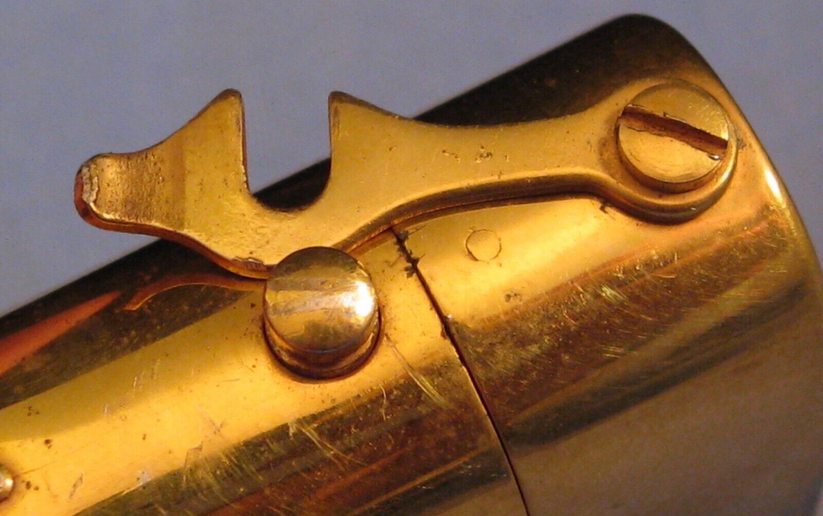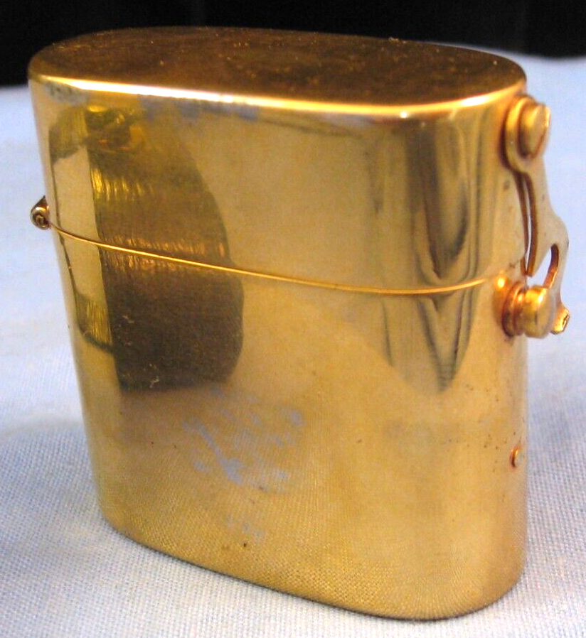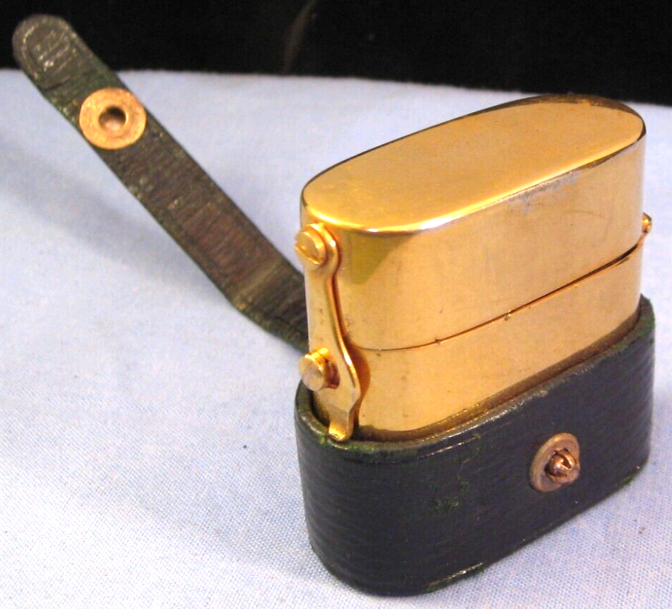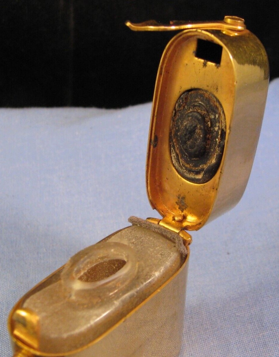 This traveling inkwell in gilded gold metal is almost always found made of white metal. It comes with its original green leather case and the inkwell has a button at the front and a bar catch to keep the lid closed. There is a stopper on the underside of the lid which seals the removable glass ink bottle inside when in transit.