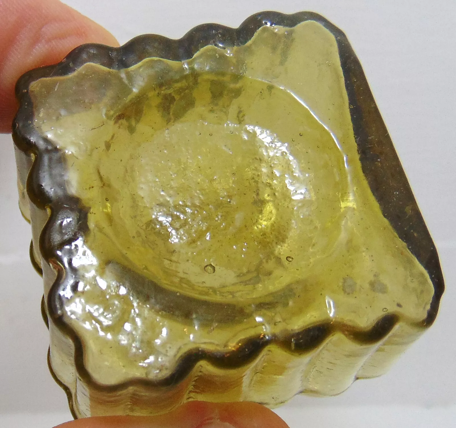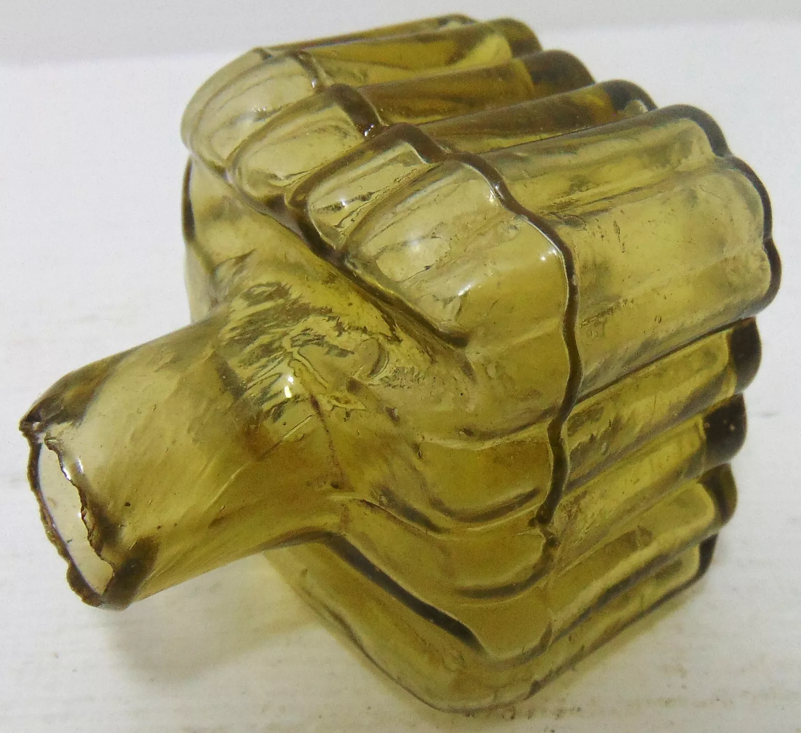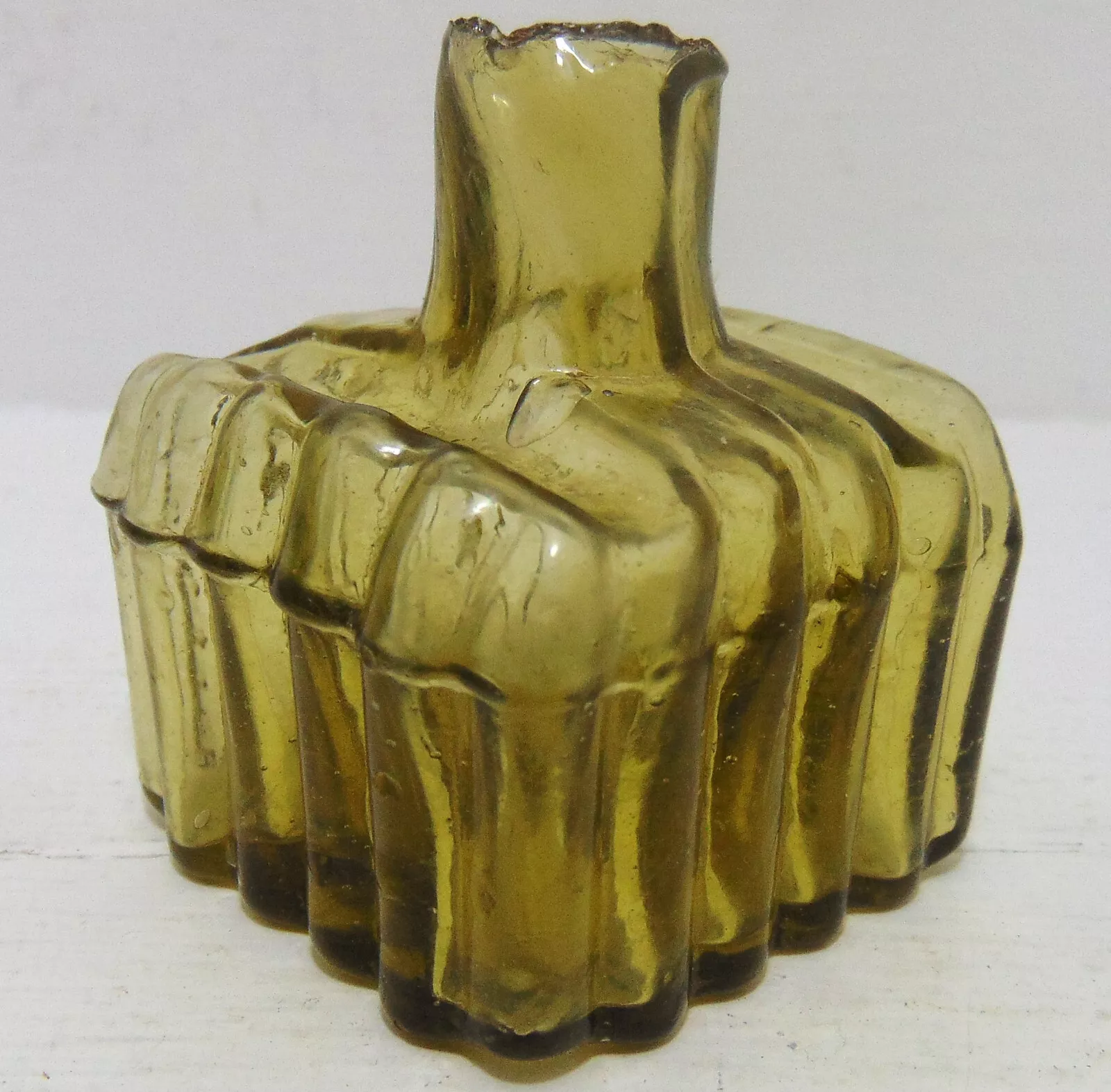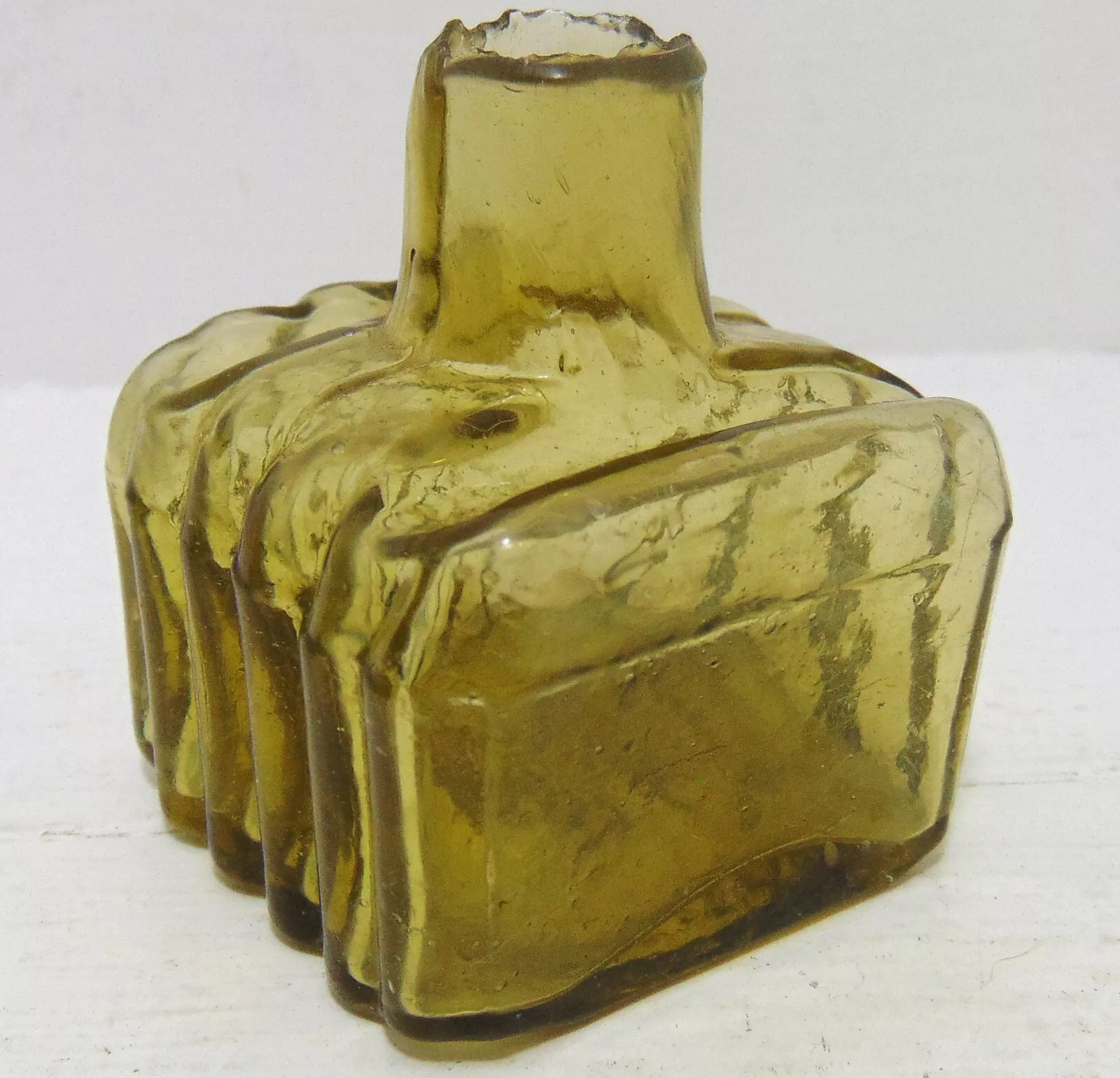 This golden-amber ribbed ink bottle with shear lip stands 2 ⅛” high and dates to around 1890.