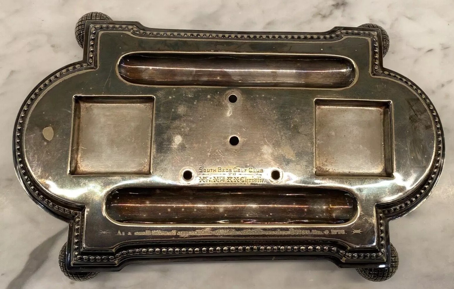 This silverplate inkstand with a strong golf theme was presented as a token of appreciation.