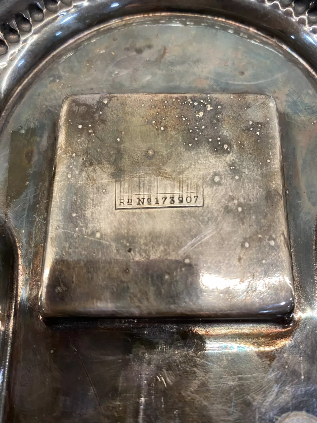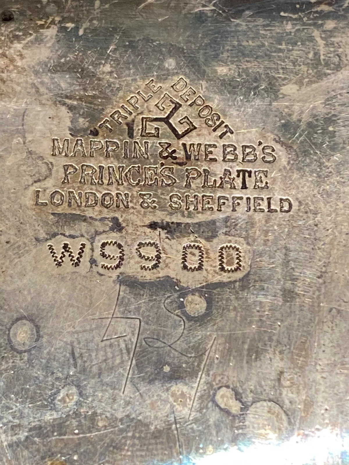 • Triple Deposit MAPPIN & WEBB’S / PRINCE’S PLATE / LONDON & SHEFFIELD / W9900: This indicates that the inkstand is made of silverplate by Mappin & Webb, a renowned British silversmithing company, and is part of their “Prince’s Plate” line. “Triple Deposit” refers to a thicker layer of silver plating for increased durability.