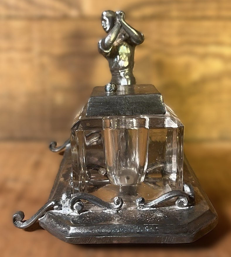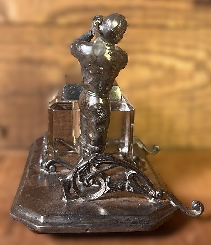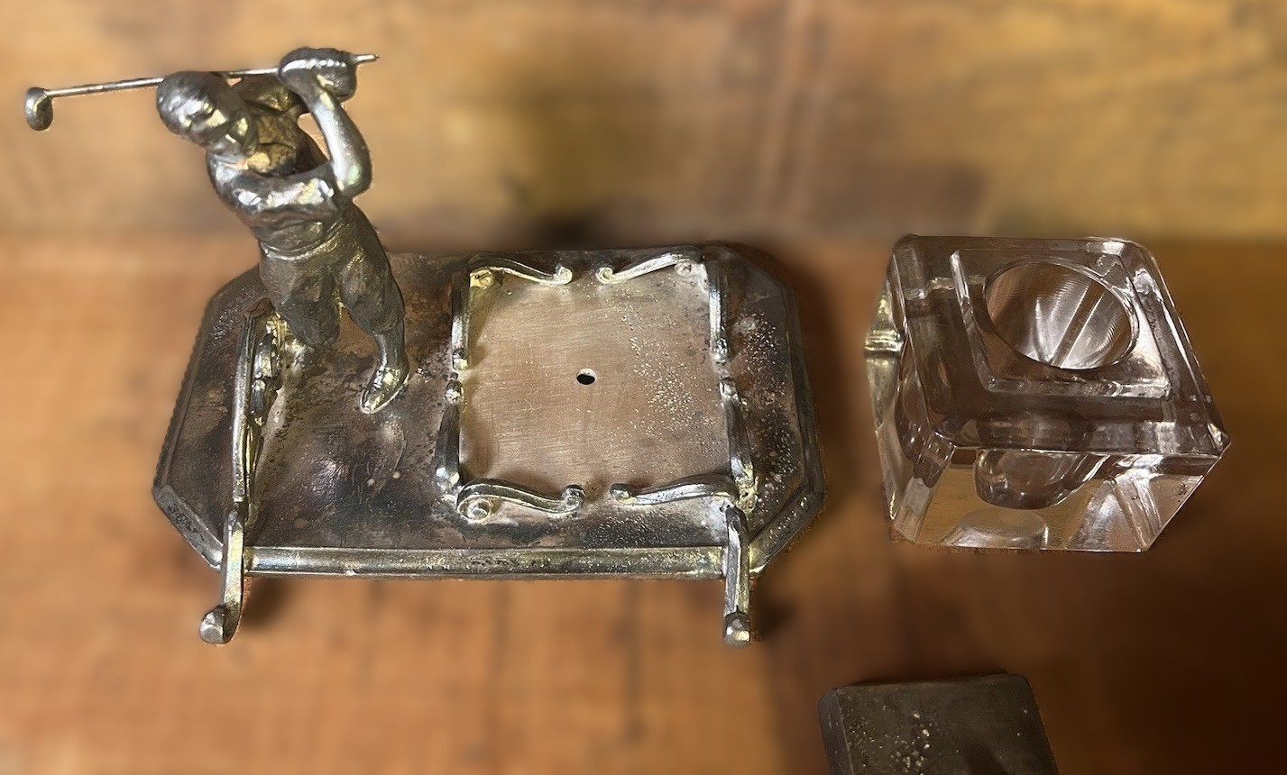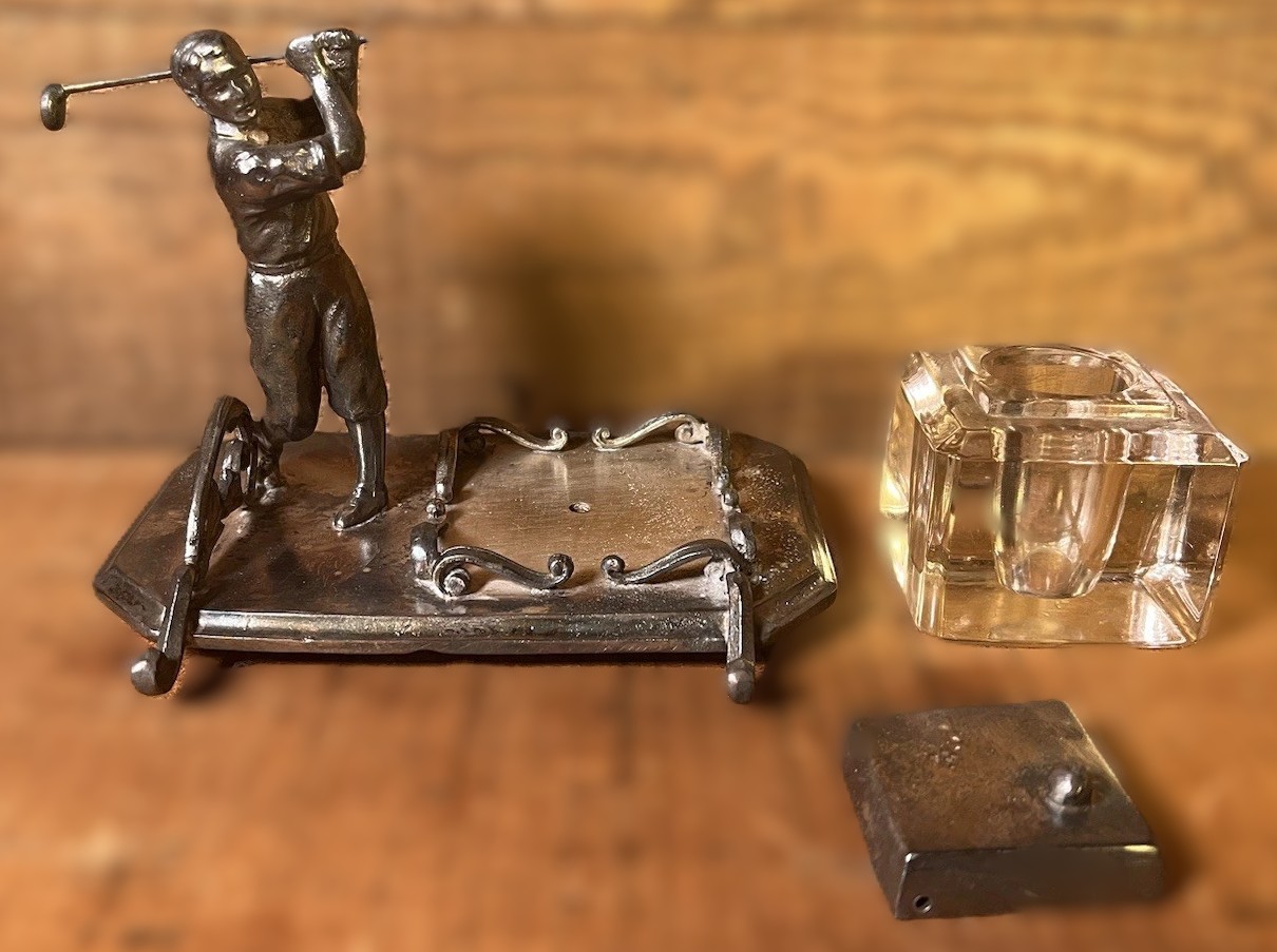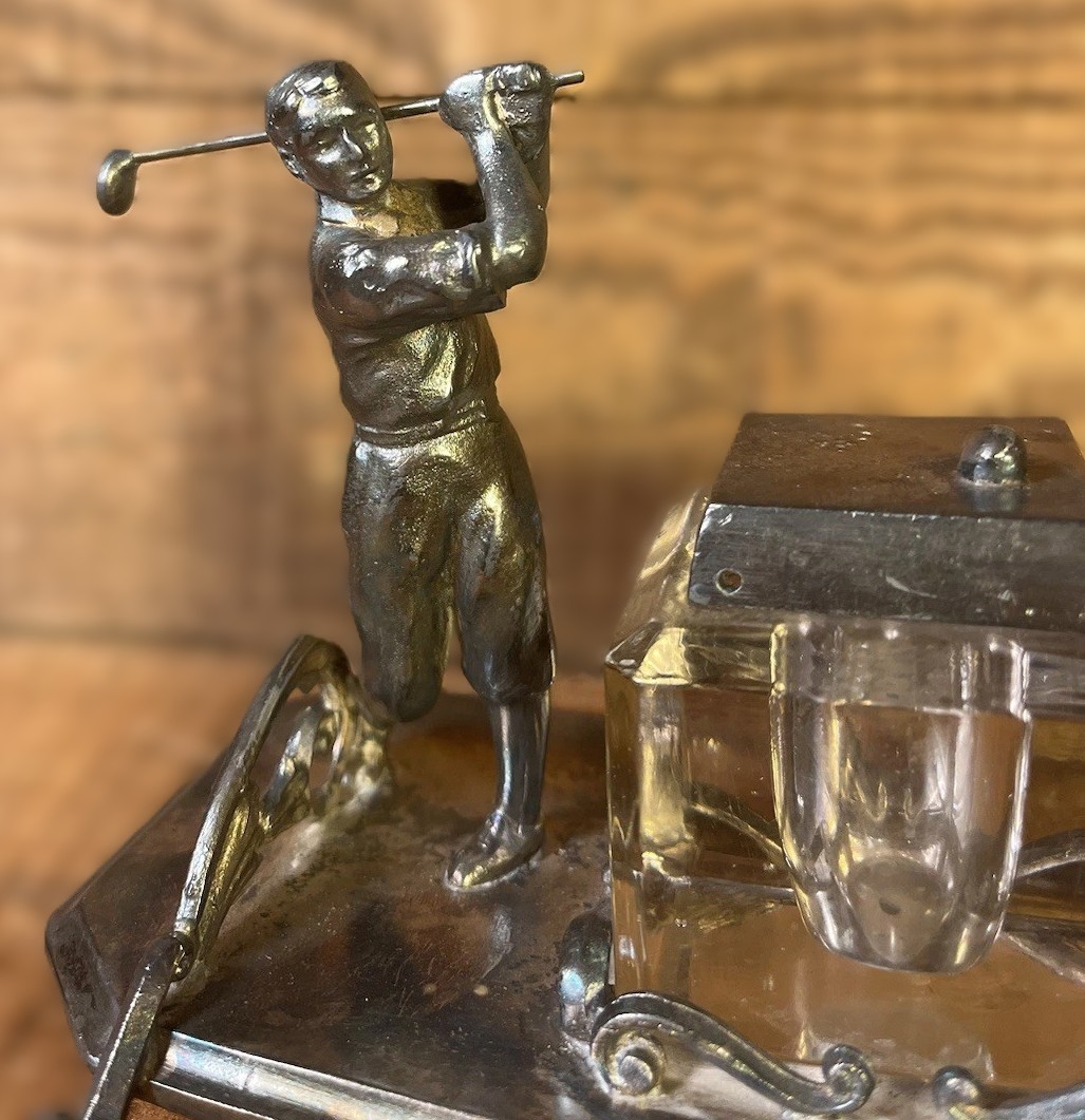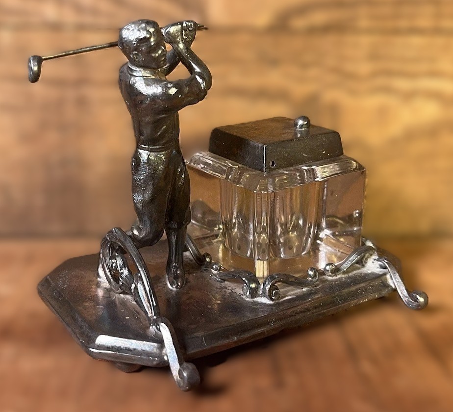 This silver-plated inkstand features a figural golfer in mid-swing. This specific style was a popular luxury item during the “golfing boom” of the late 19th and early 20th centuries.