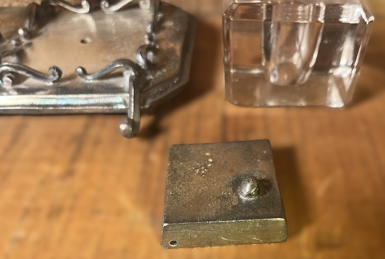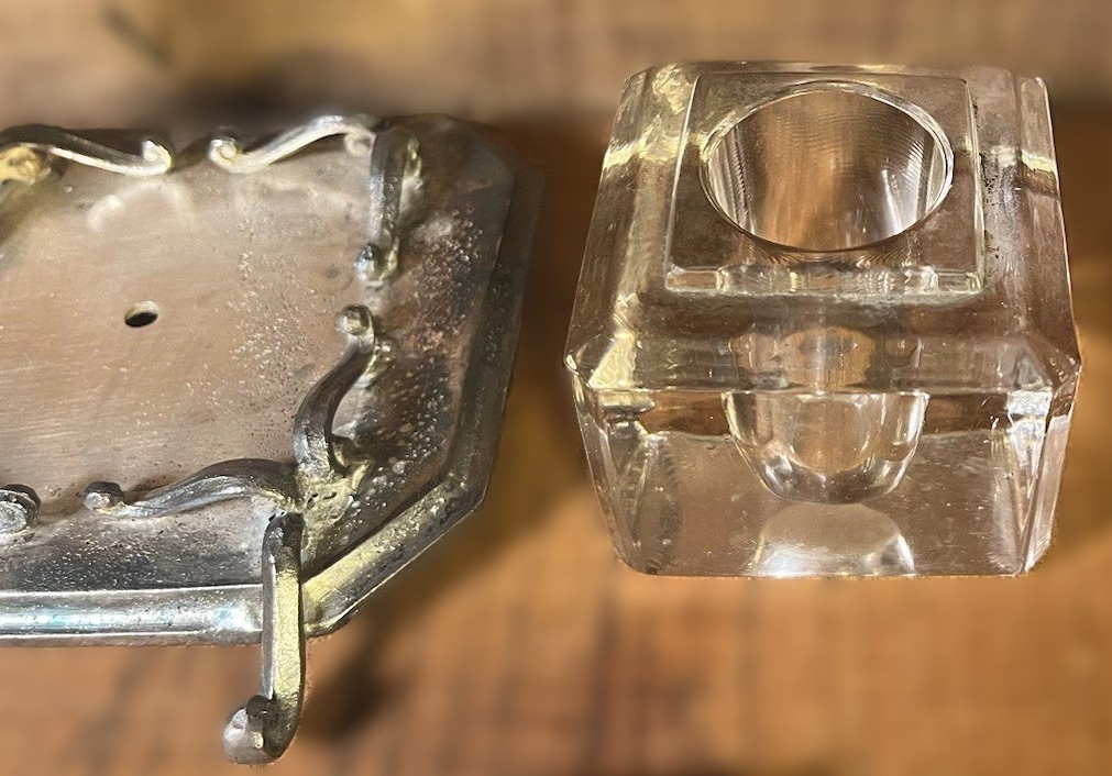 - The Inkwell: A heavy, square cut-glass reservoir with a central well. It sits securely within a decorative scrollwork frame.