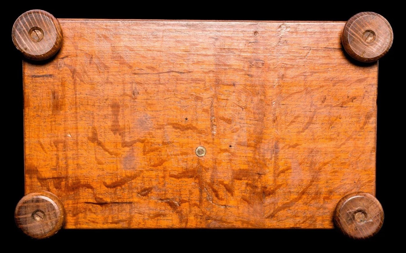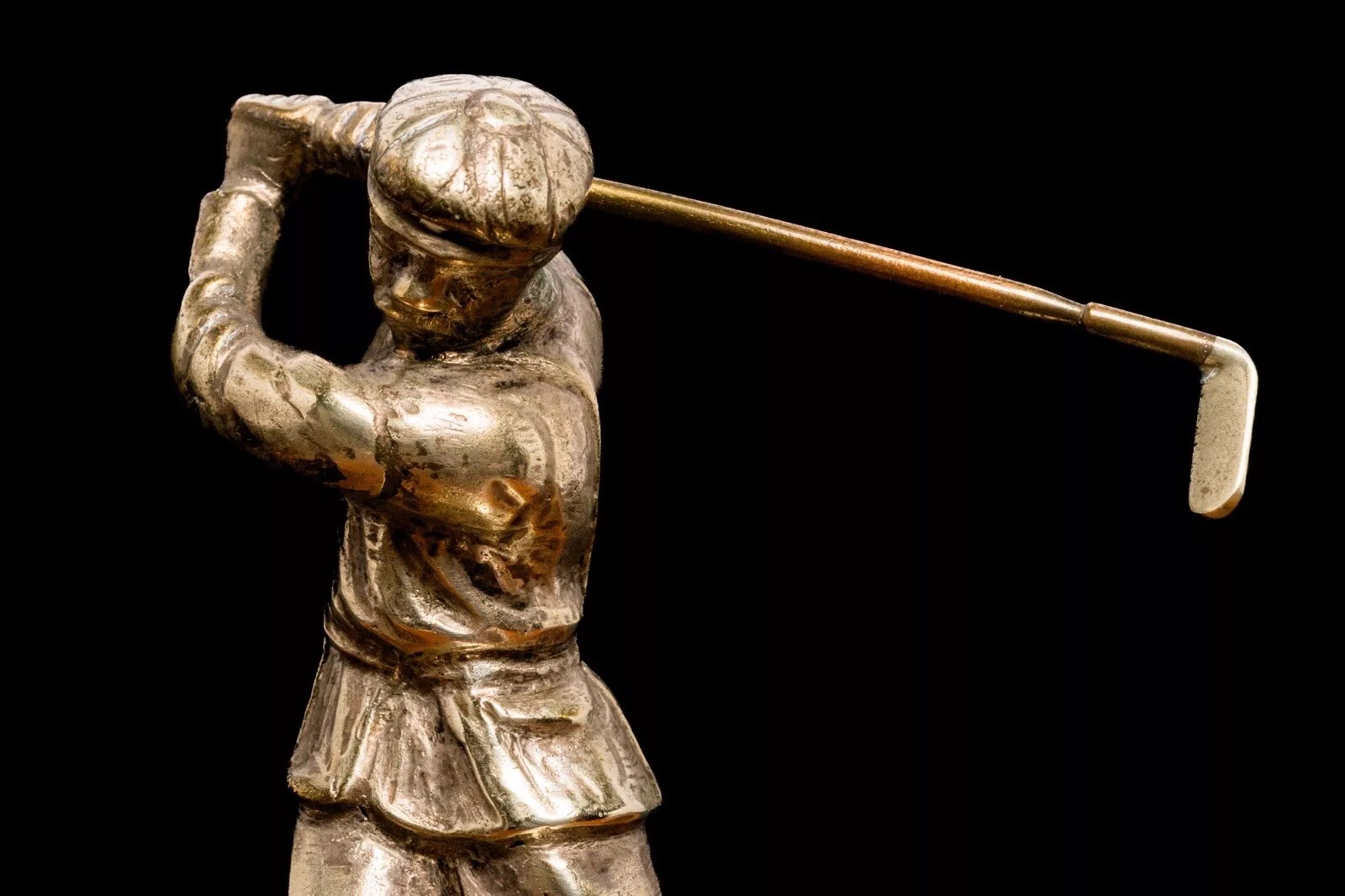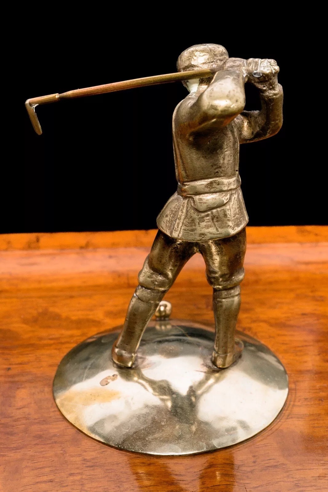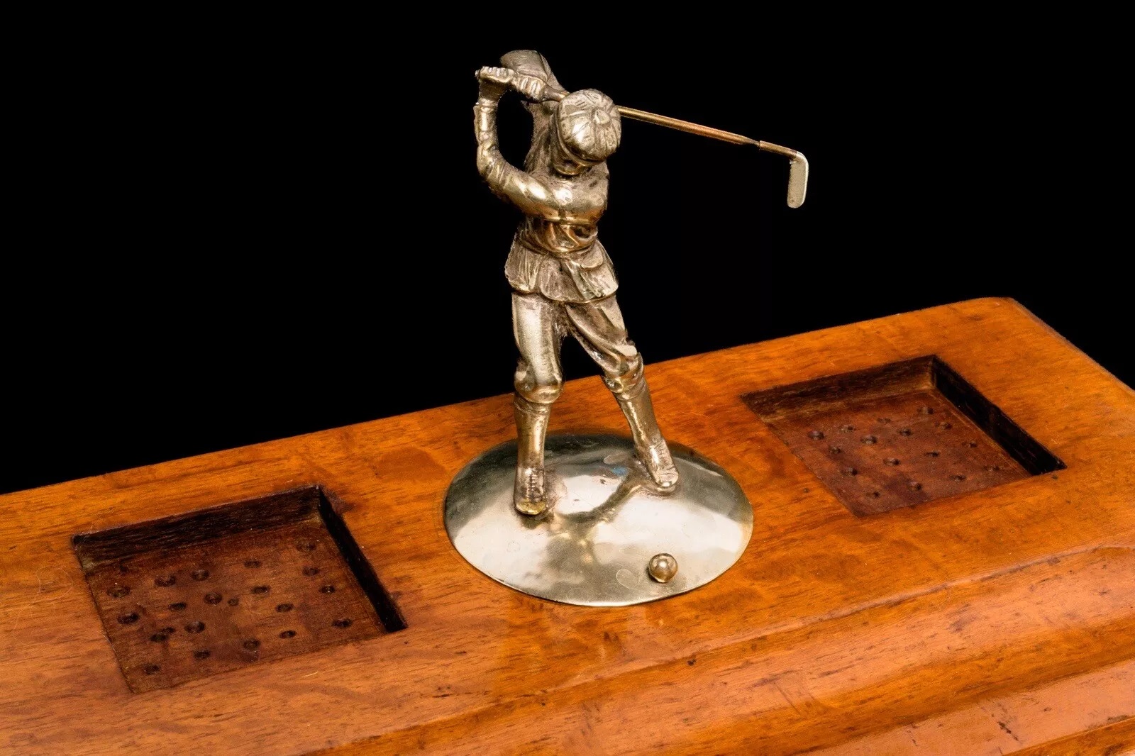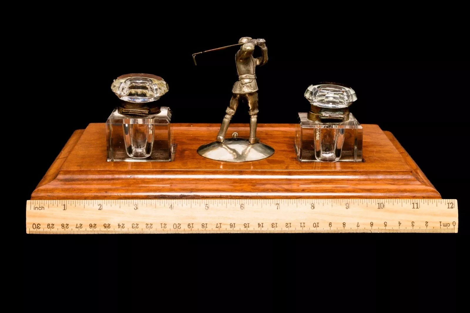 This inkstand features a central metal figurine of a golfer in mid-swing, positioned on a polished wooden base. On either side of the golfer, there are two glass inkwells with hinged metal lids, set into the wooden base.