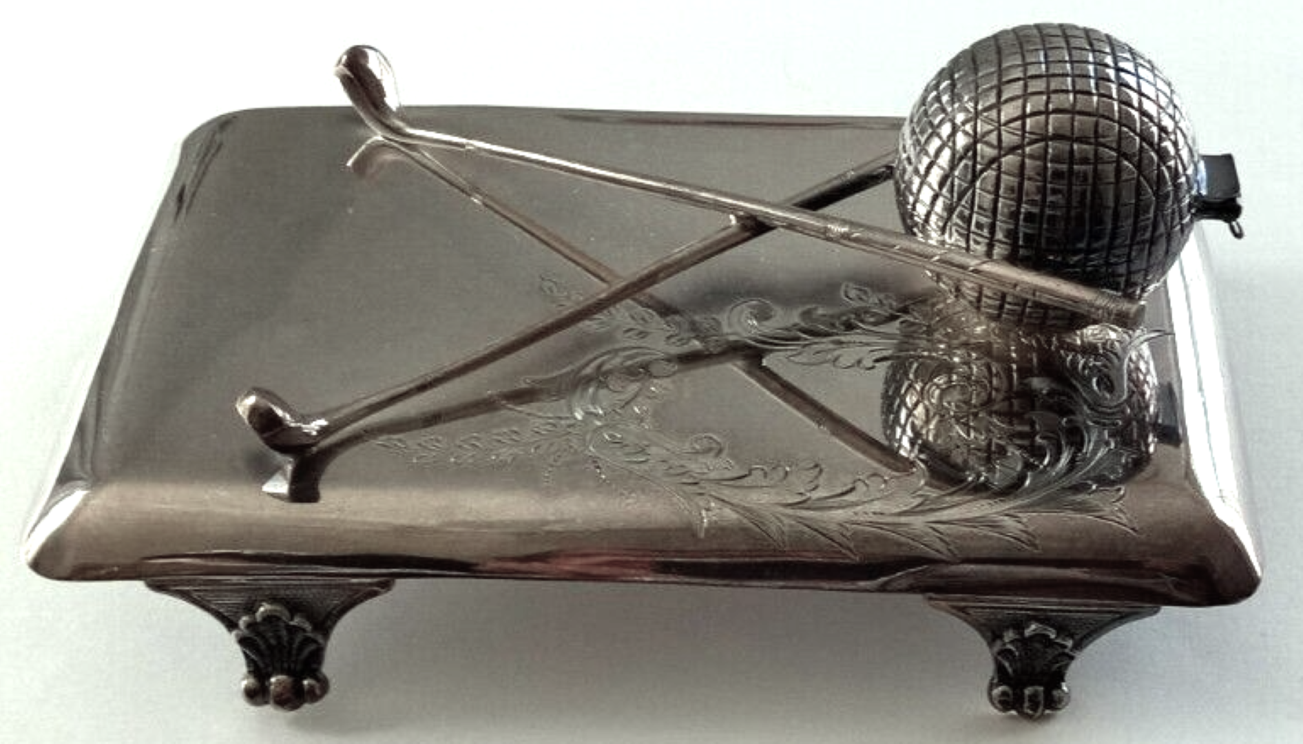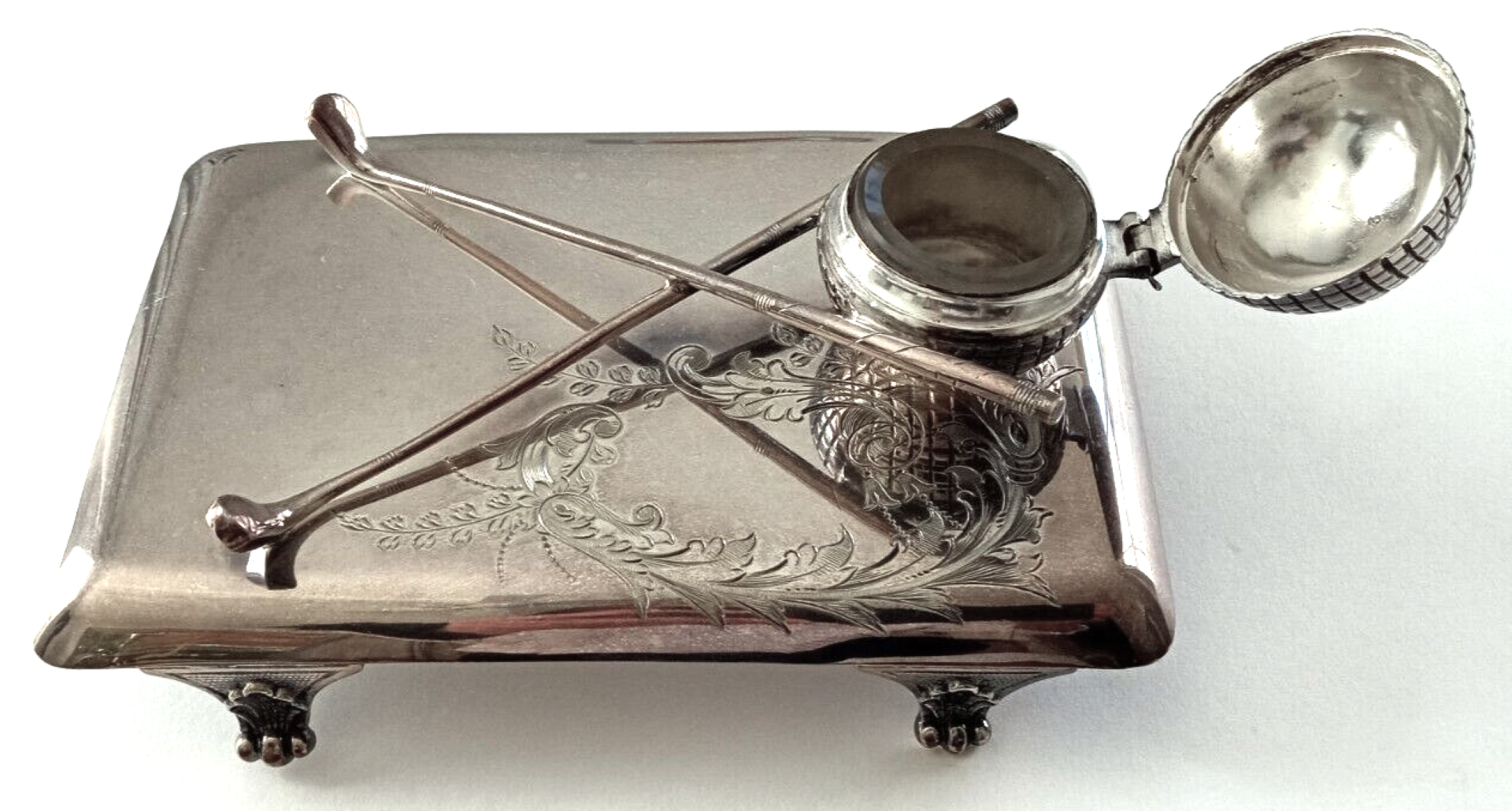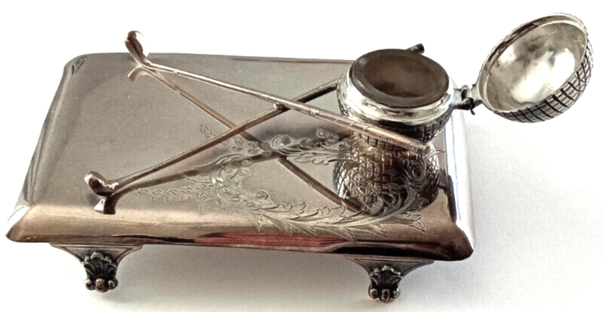 This electroplated silver inkstand has a rectangular base with rounded corners, four scrolled legs and is decorated with foliage engraving. The base is surmounted by crossed golf clubs and a mesh pattern golf ball with a hinged cover enclosing a glass liner. Maker’s mark and number on the underside.