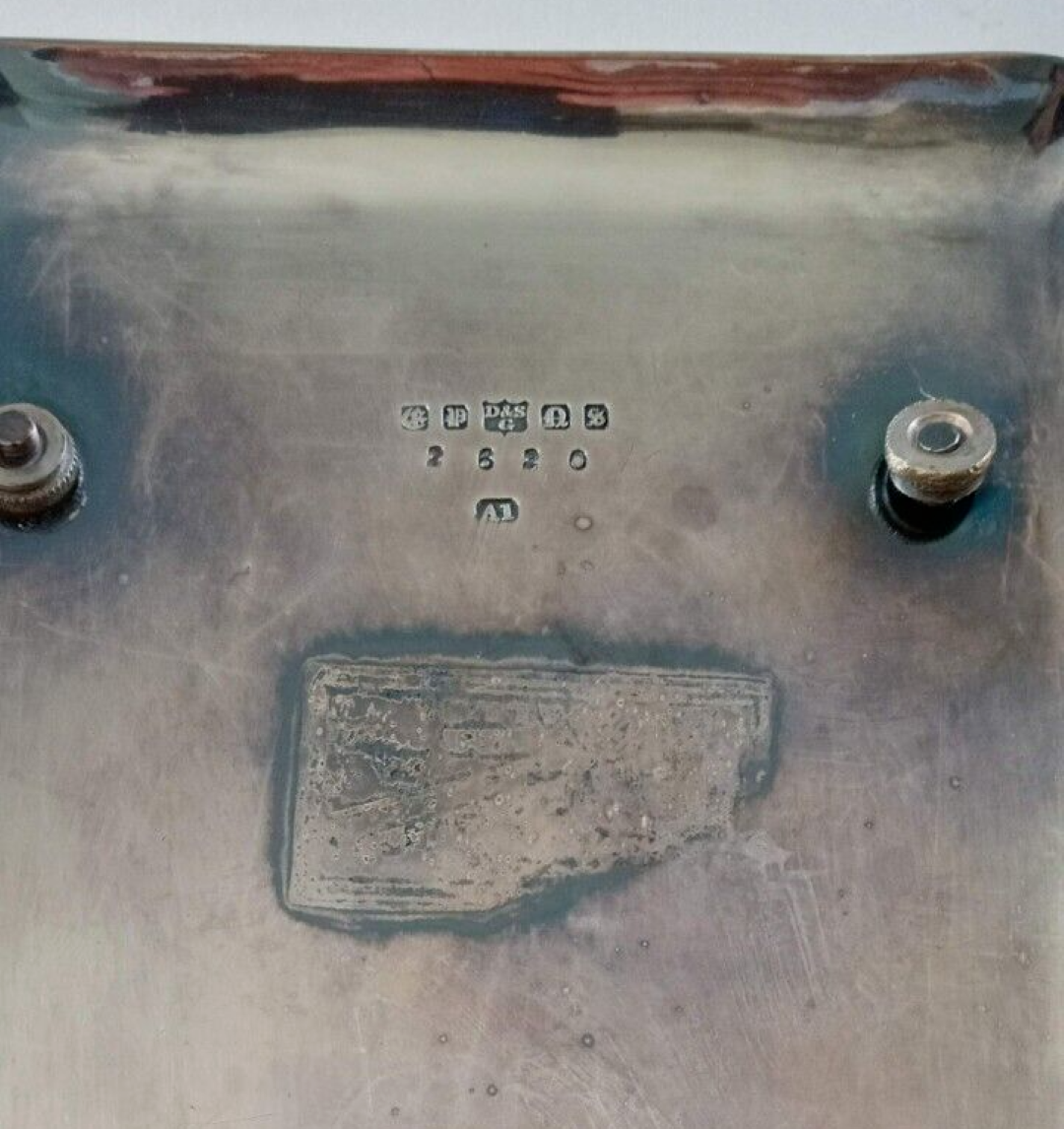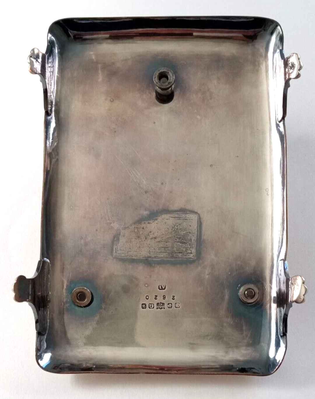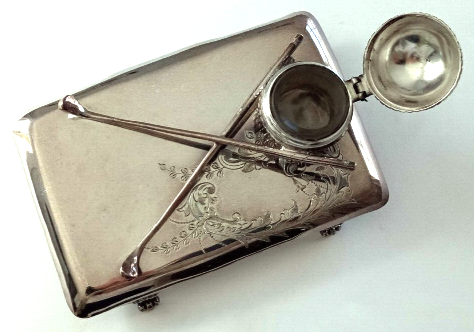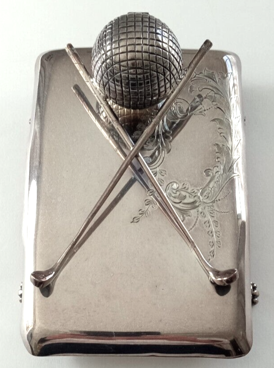 This electroplated silver inkstand has a rectangular base with rounded corners, four scrolled legs and is decorated with foliage engraving. The base is surmounted by crossed golf clubs and a mesh pattern golf ball with a hinged cover enclosing a glass liner. Maker’s mark and number on the underside.