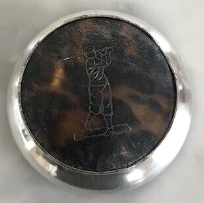 A sterling silver inkwell. Unable to decipher the hallmarks. The figure of a golfer in swing is etched into the hinged tortoiseshell lid.