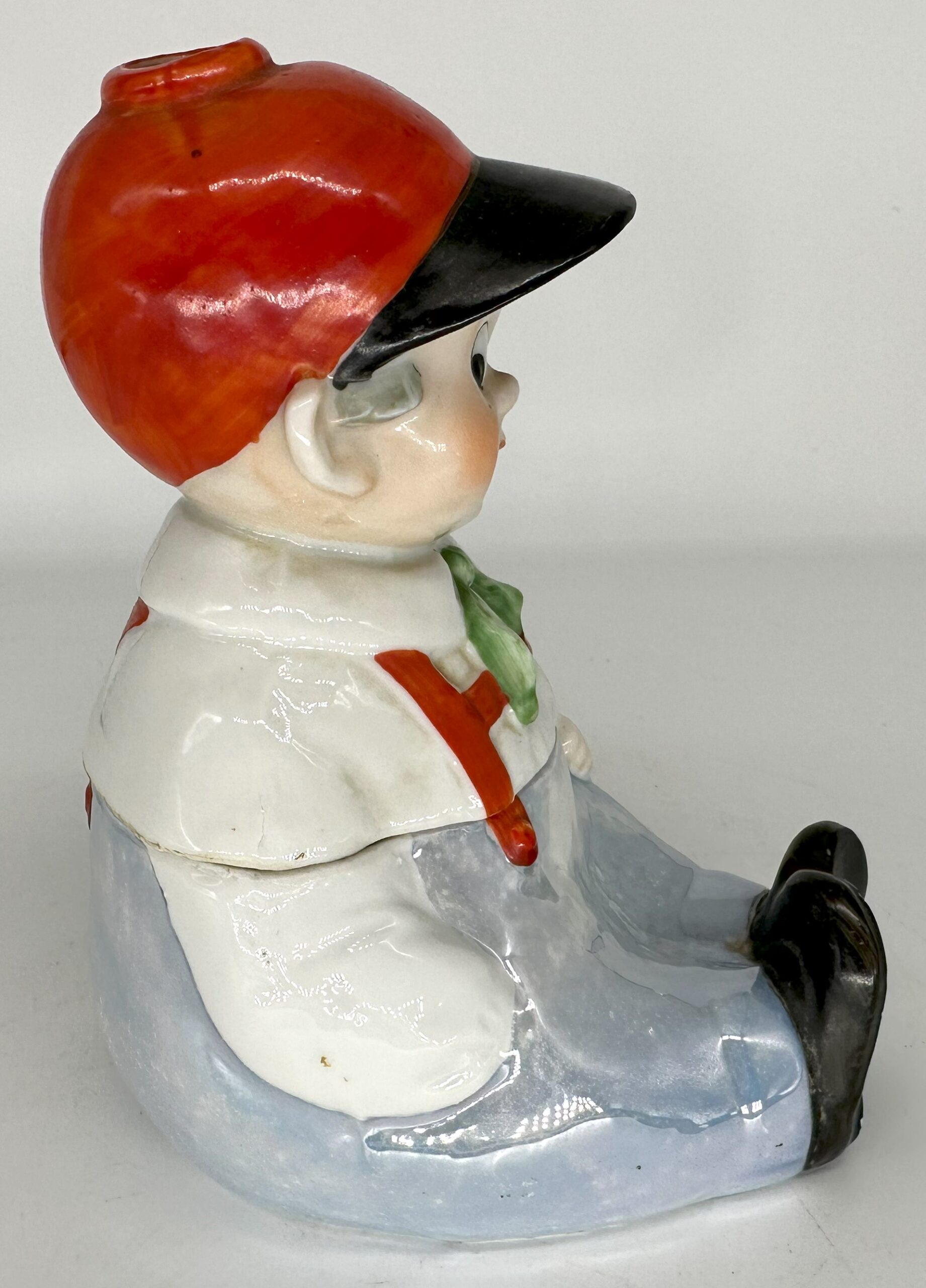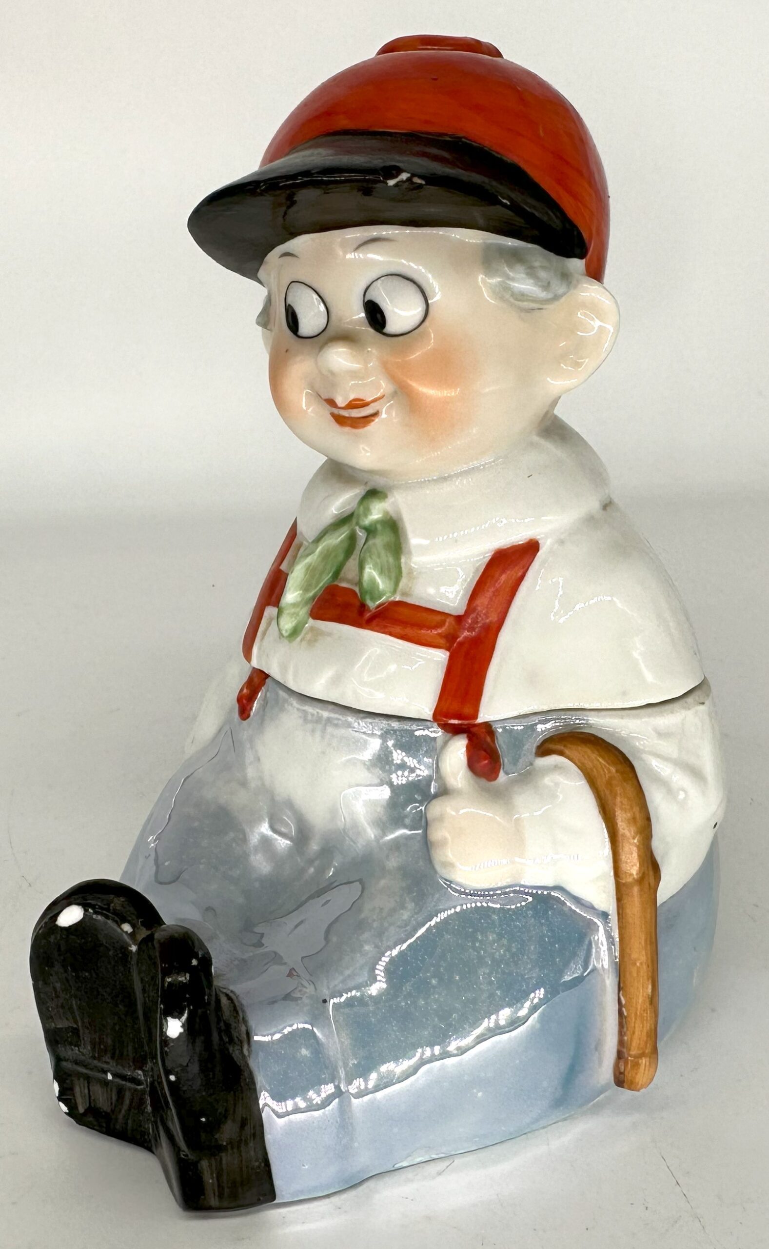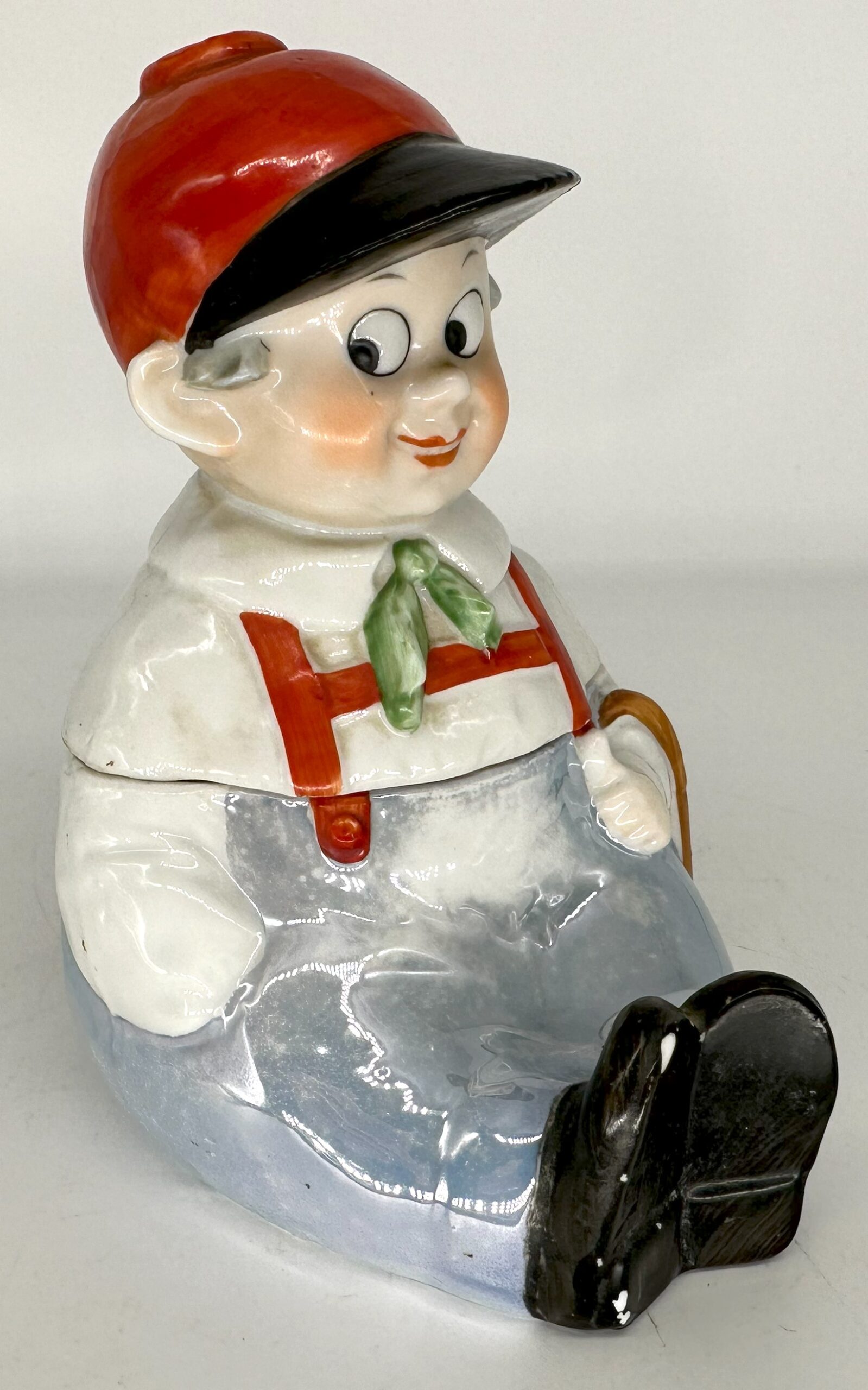 A googly-eyed boy wearing a baseball cap and suspenders sits with one hand in a pocket, a cane draped over the other arm. The hole in his cap serves as a pen holder.
