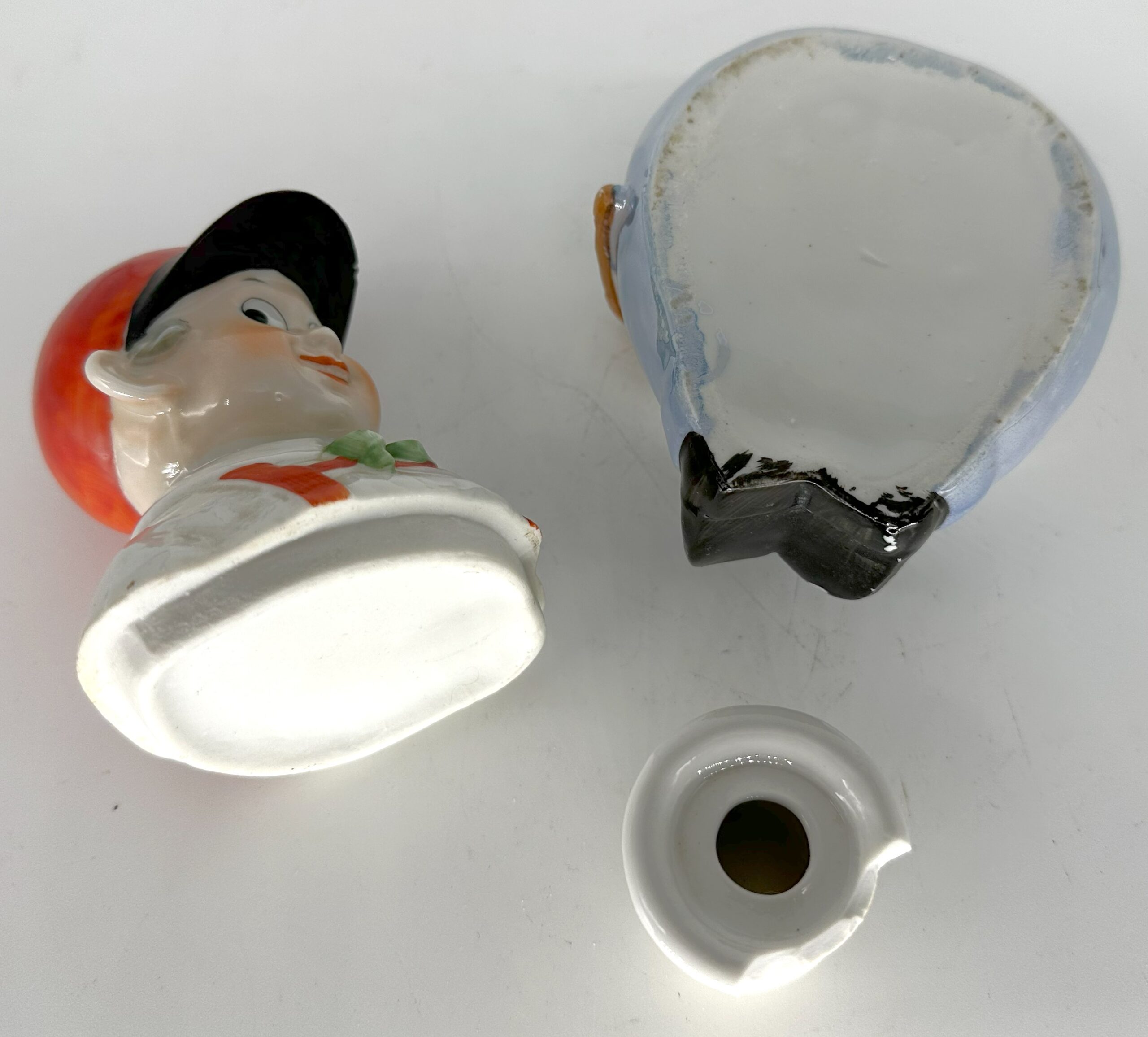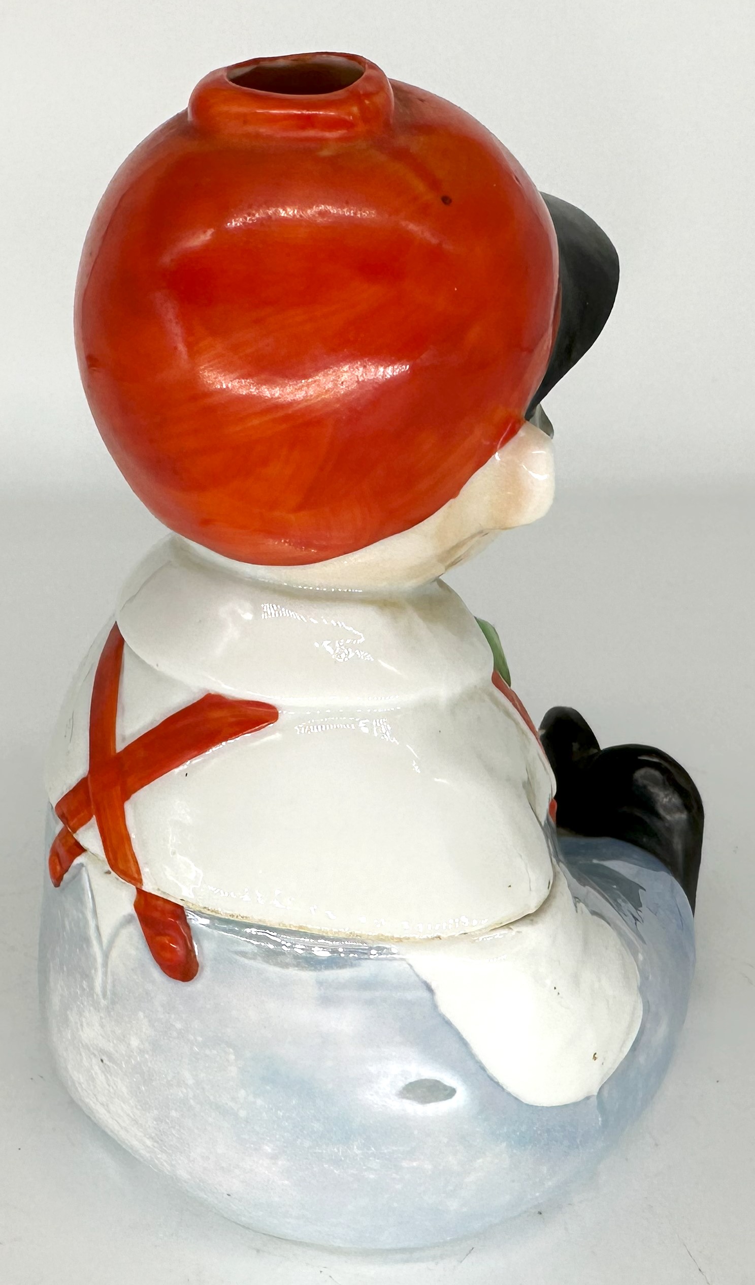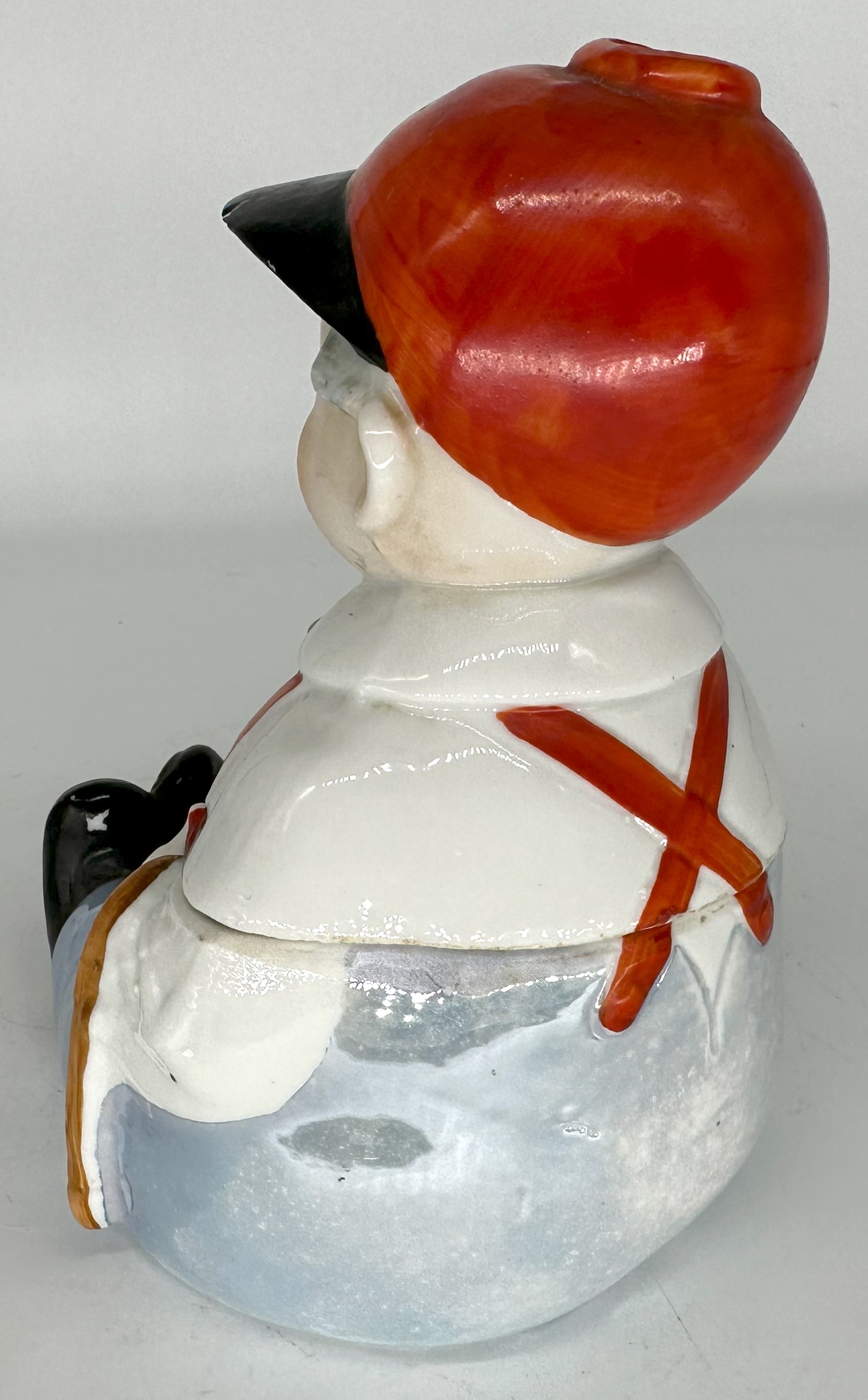 A googly-eyed boy wearing a baseball cap and suspenders sits with one hand in a pocket, a cane draped over the other arm. The hole in his cap serves as a pen holder.