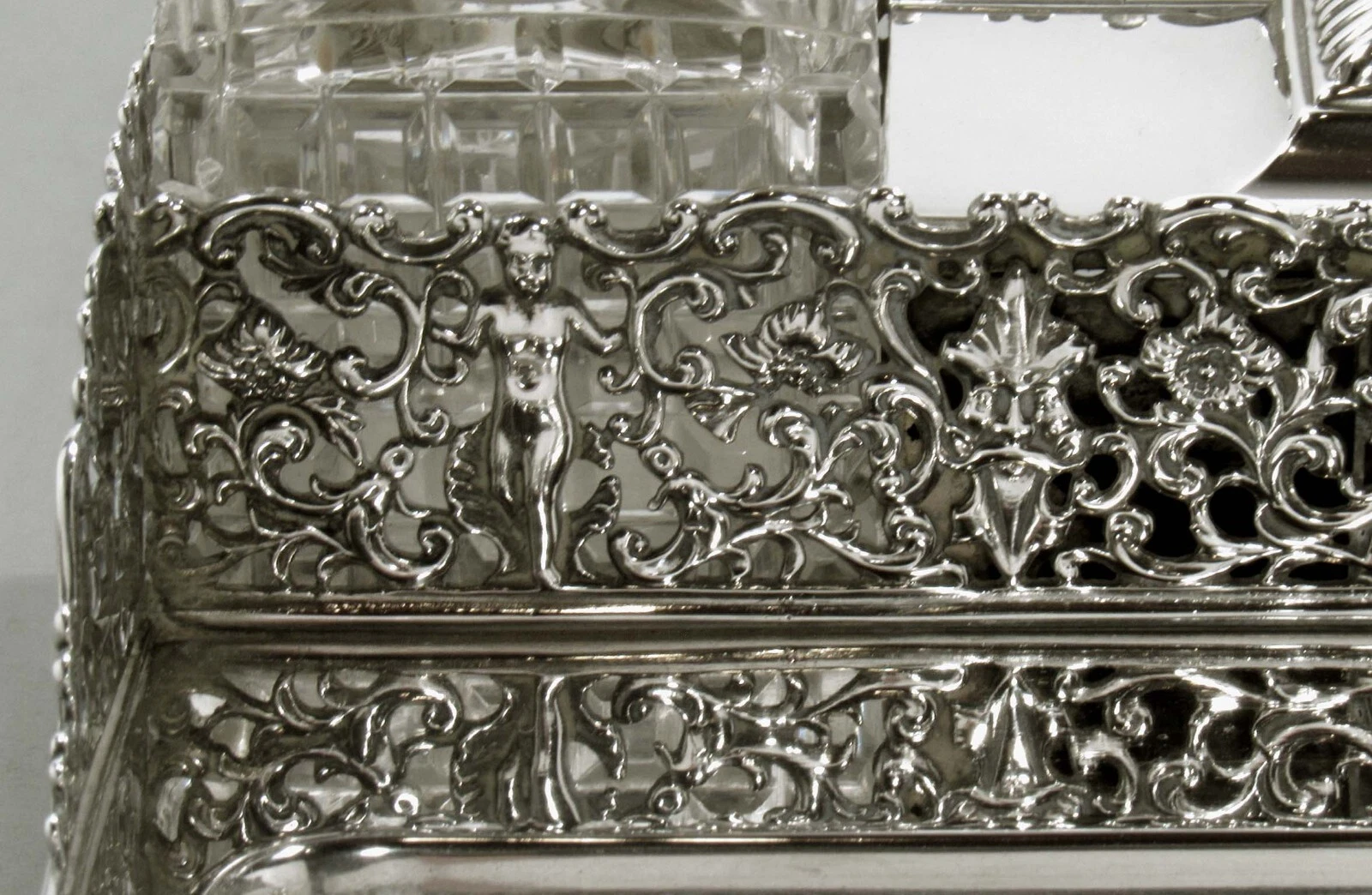 A striking feature of the inkstand is the deeply embossed and pierced sterling silver gallery that encircles the lower part of the piece, below the inkwells and central storage. This metalwork is richly decorated with: