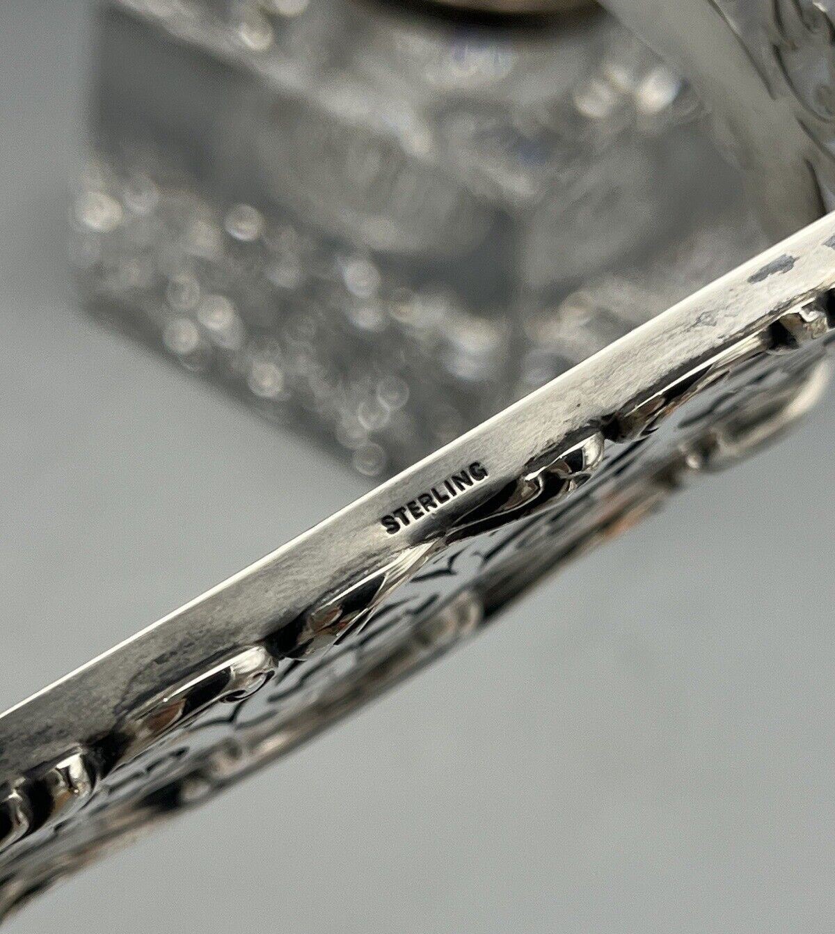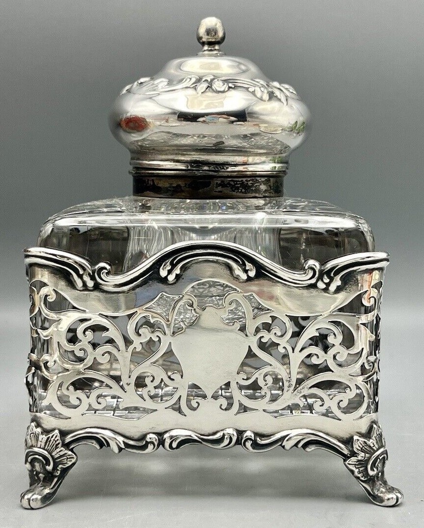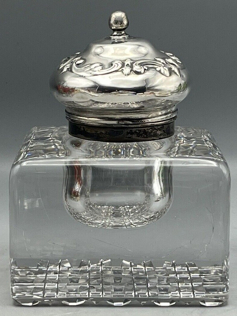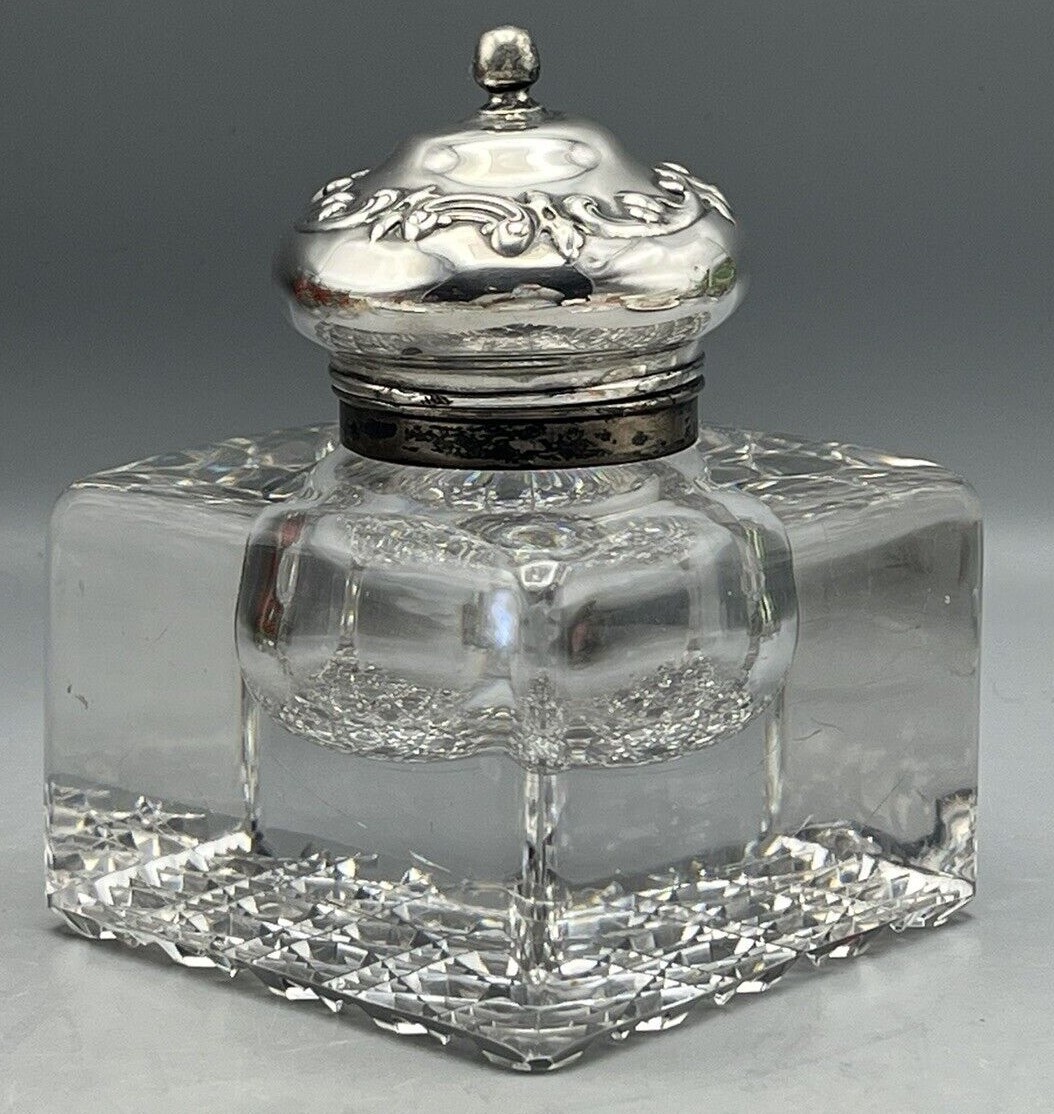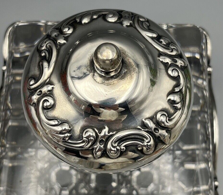 A large crystal inkwell with a deep button pattern cut into the underside is held in a sterling silver encasement. The silver holder is marked “Sterling” and bears a Gorham Silver mark indicating 1896 as the year of production. The inkwell holder is made of intricate scroll work and has a blank cartouche on the front for a monogram.