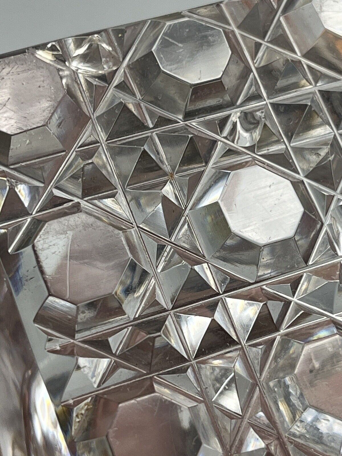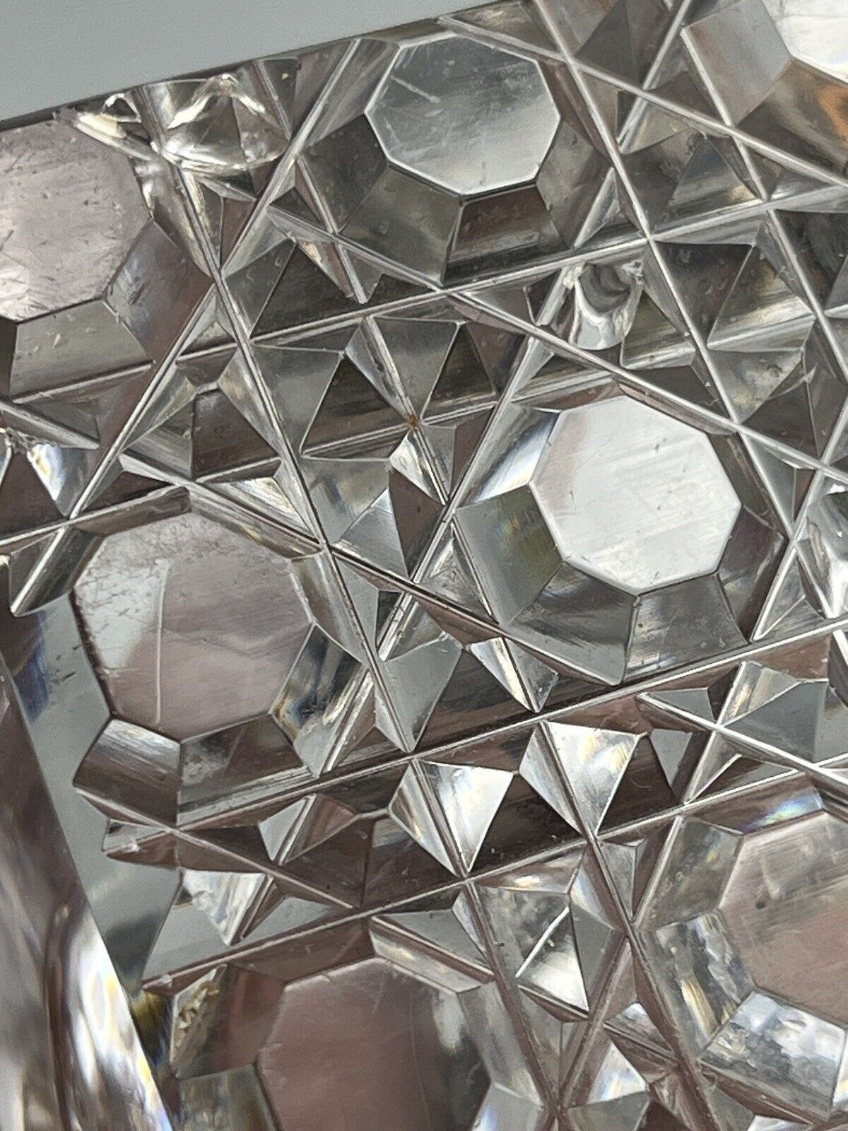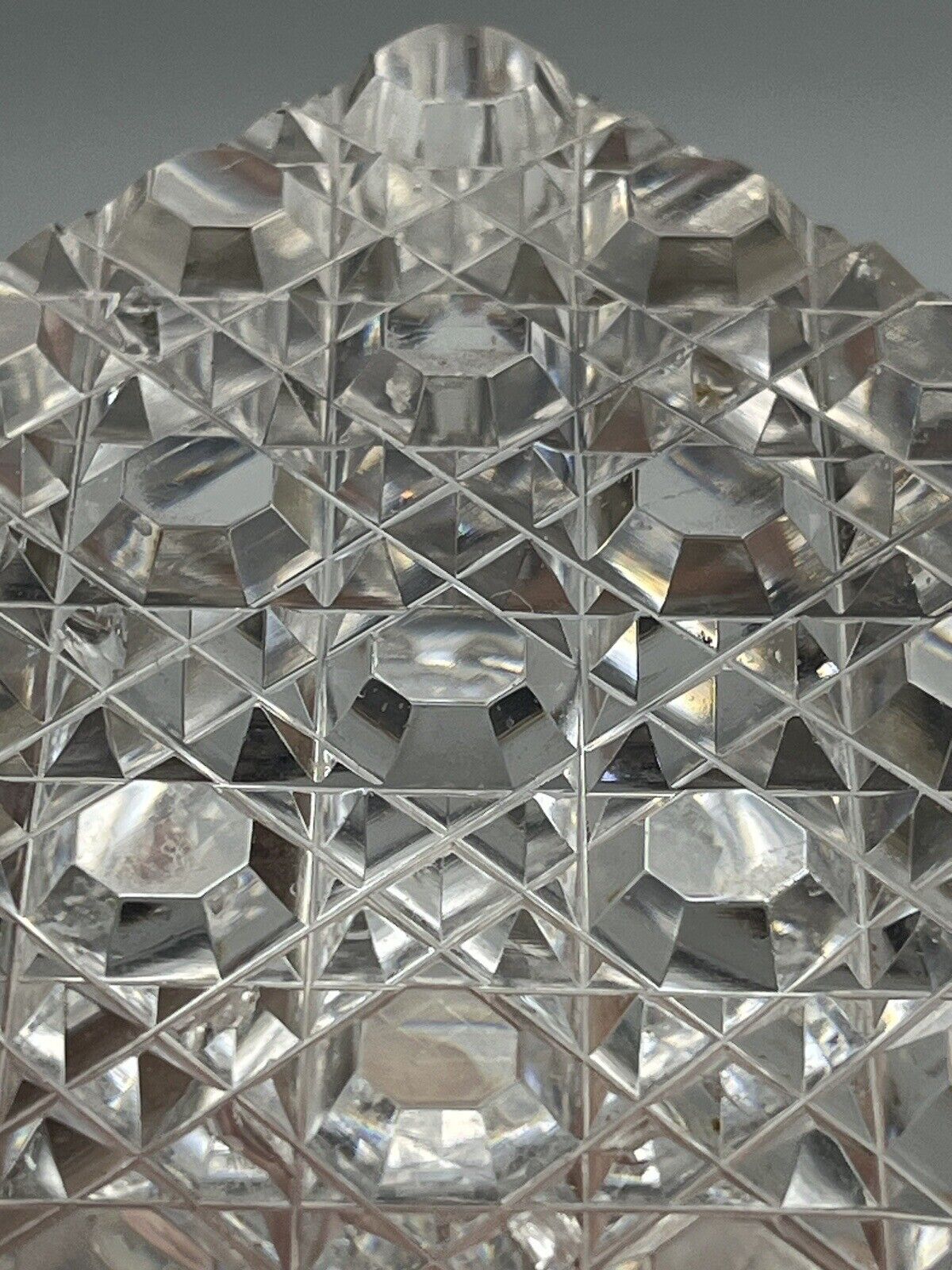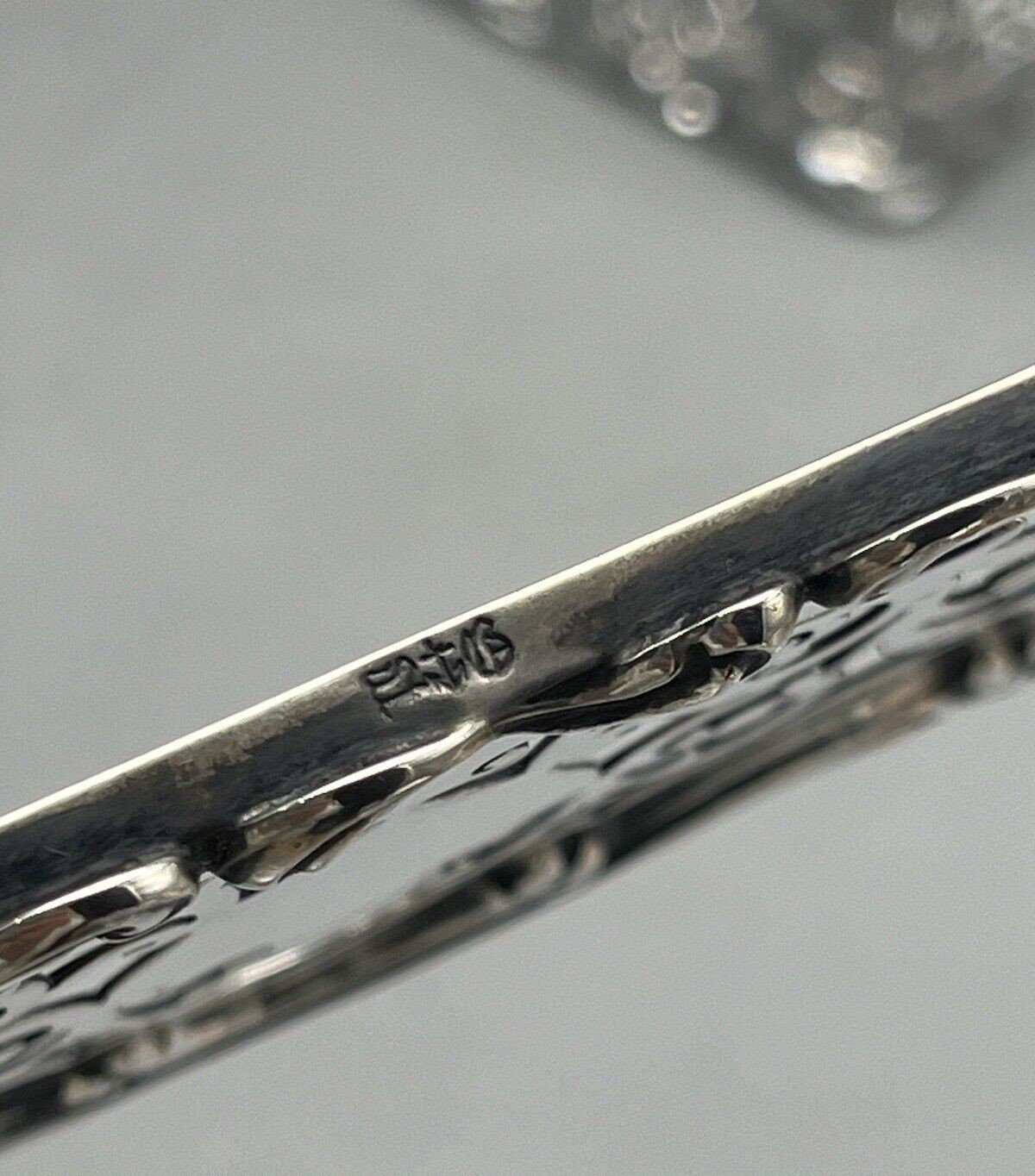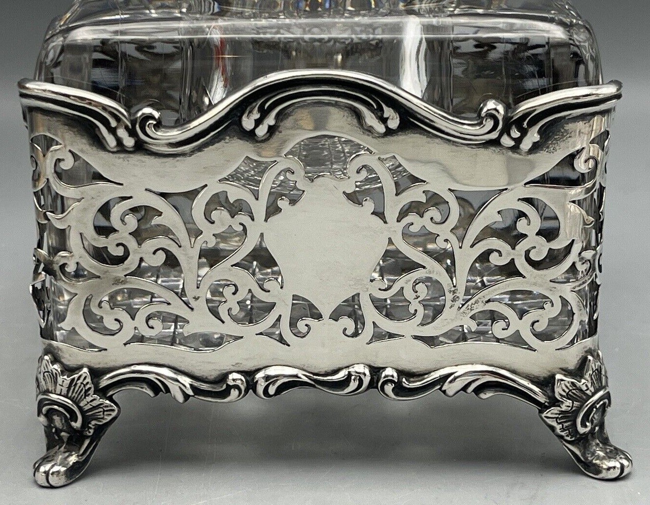 A large crystal inkwell with a deep button pattern cut into the underside is held in a sterling silver encasement. The silver holder is marked “Sterling” and bears a Gorham Silver mark indicating 1896 as the year of production. The inkwell holder is made of intricate scroll work and has a blank cartouche on the front for a monogram.