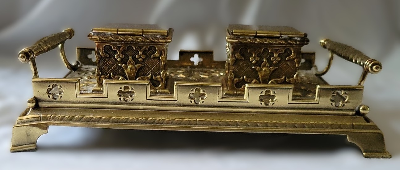 This Gothic Revival double inkstand is an example of the 19th-century architectural aesthetic applied to desk accessories.