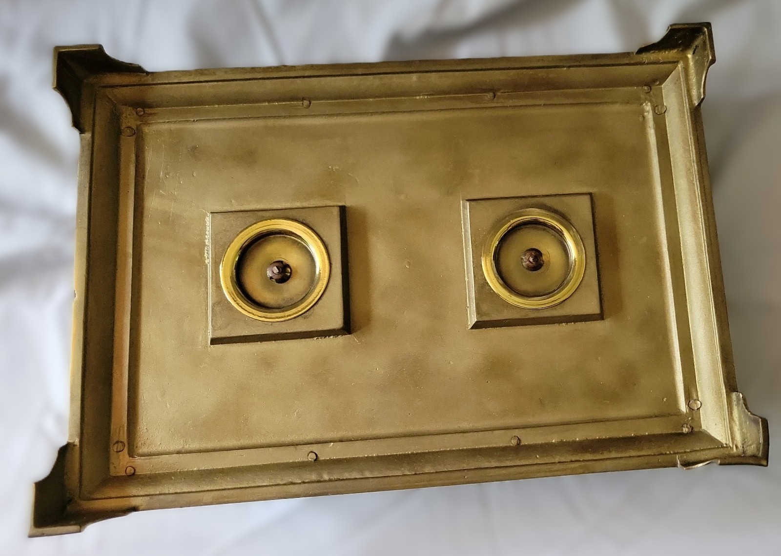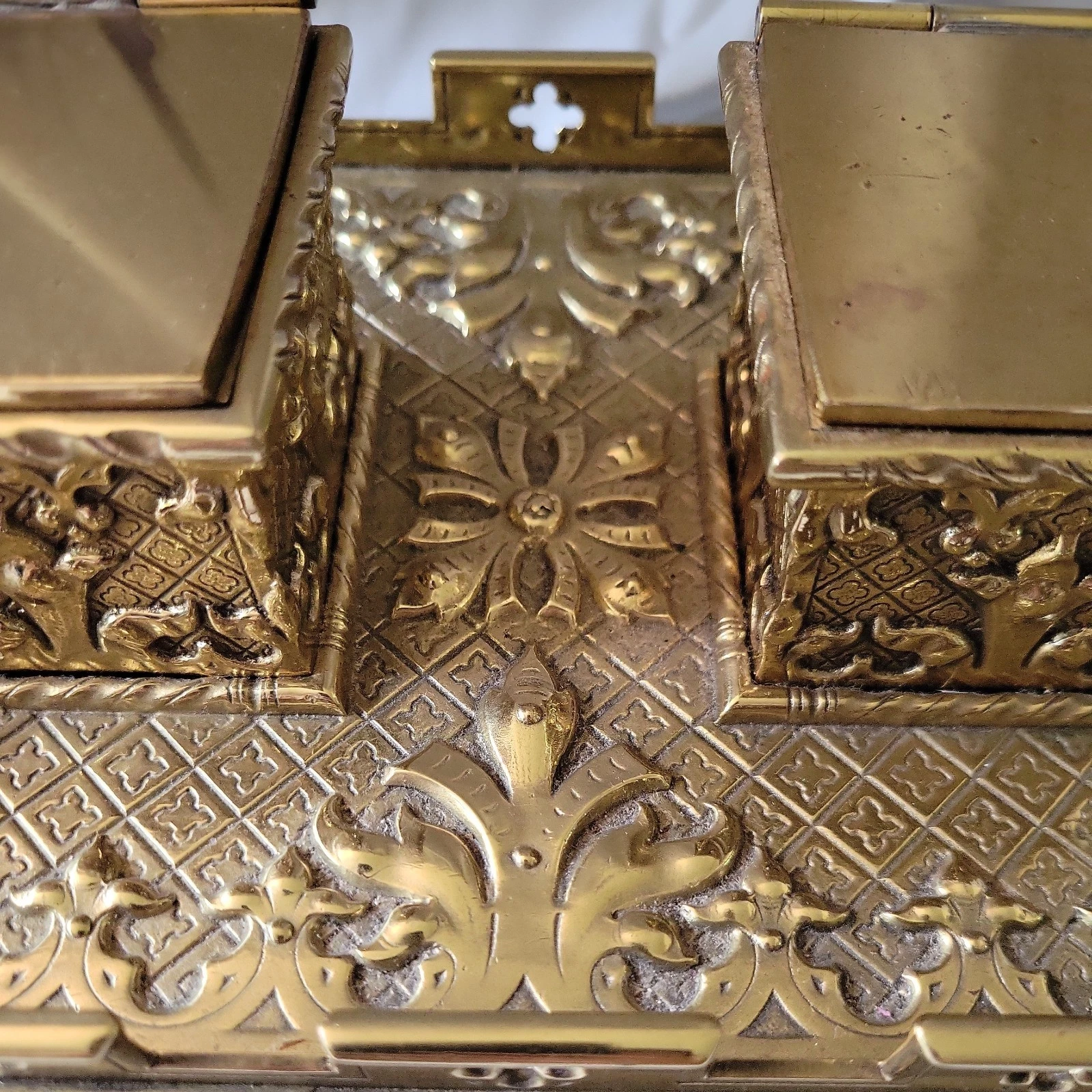 • The Structure: This is a heavy, rectangular brass stand with a double-well design. It features two square, hinged inkwell housings flanking a central space.