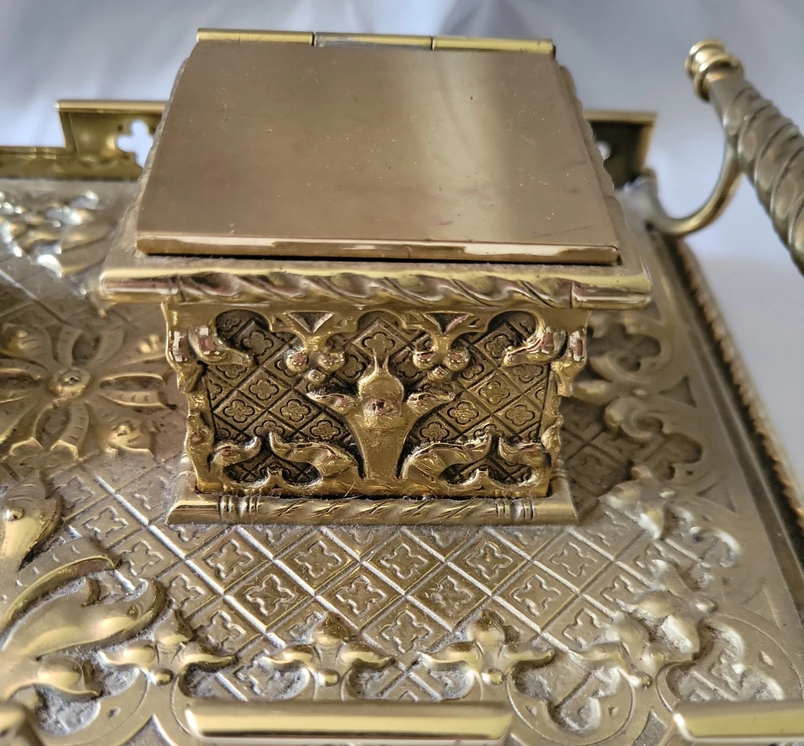 • The Gothic Revival movement in England, championed by designers like A.W.N. Pugin, peaked in the 1870s. This “High Victorian” period favored these heavy, masculine desk sets for use in home libraries or law offices. The use of heavy brass casting and mechanical hinges suggests it was made before the lighter, stamped-metal mass production of the 1890s took over.