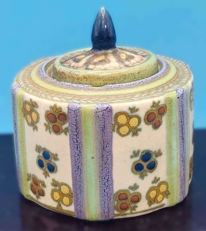 • Stylized Florals: The main decorative bands on both the body and the lid consist of repeating, abstract floral or botanical motifs that are highly stylized and symmetrically arranged.