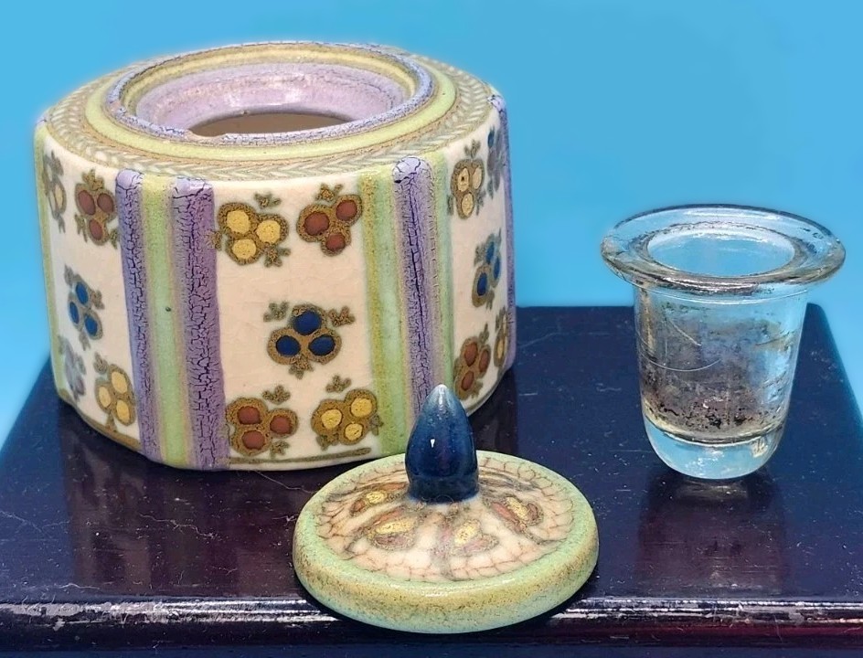 • Shape: The inkwell has a low, circular body with a broad, flat profile and gently sloping sides. It features a central aperture for a glass ink liner.