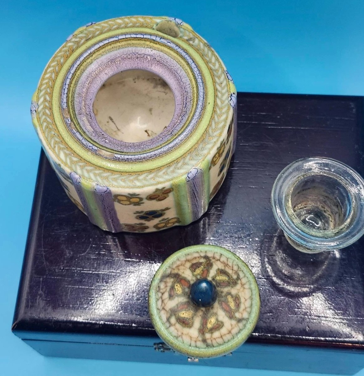 This is a hand-painted earthenware inkwell produced by the Plateelbakkerij Zuid-Holland (PZH) factory in Gouda, Netherlands, exhibiting characteristic Dutch Art Deco-period design.