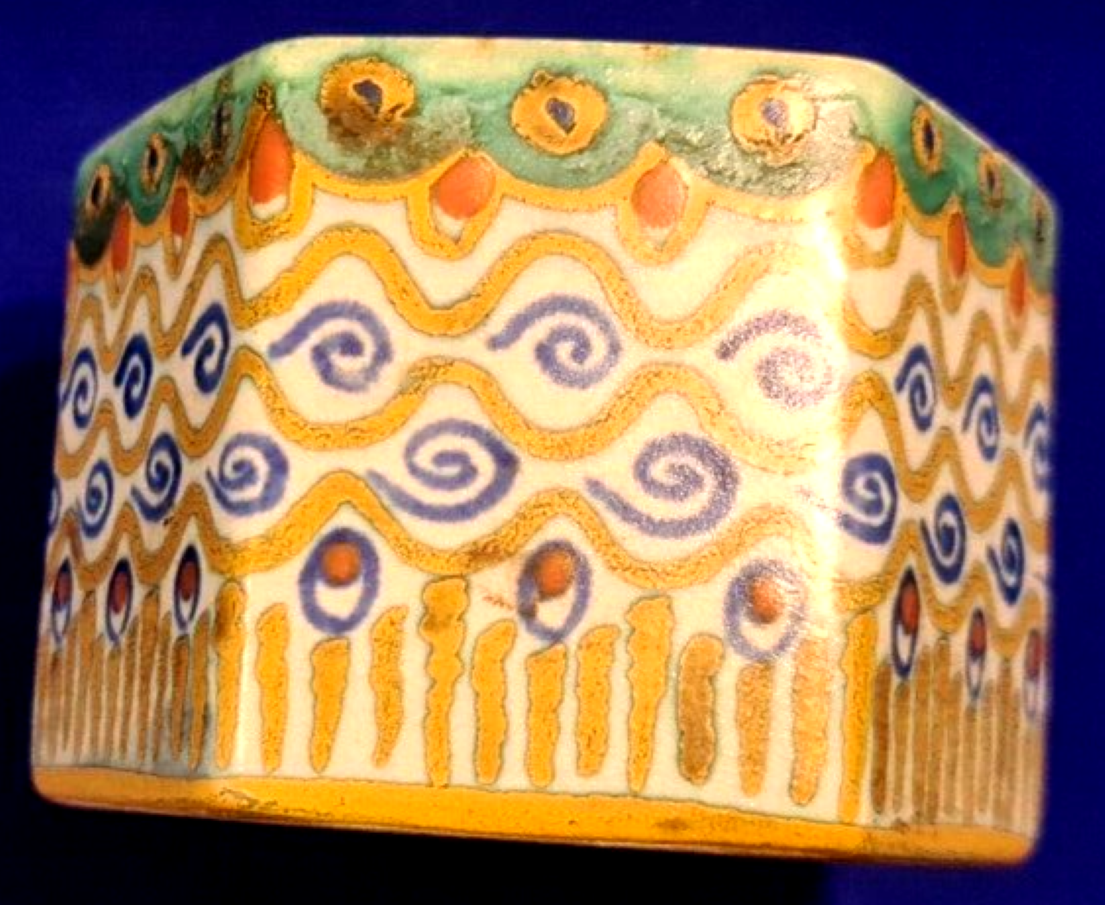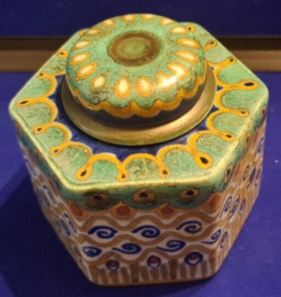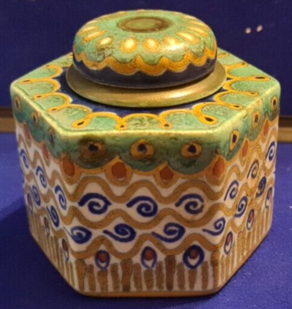 This six-sided pottery inkwell with a round, domed lid features vibrant colors (green, blue, orange) in an intricate design of different shapes (wave-like patterns, circular motifs). The piece was made in Holland for Liberty of London (marked on the underside).