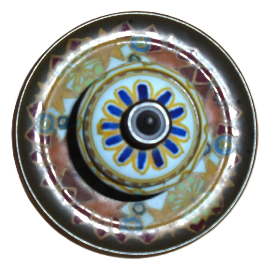 - Motifs: The saucer is decorated with a ring of jagged, star-shaped flowers and circular “buds” in blue and green. The lid features a radiating sunflower-like motif in blue and yellow, framed by a delicate band of orange dots.
