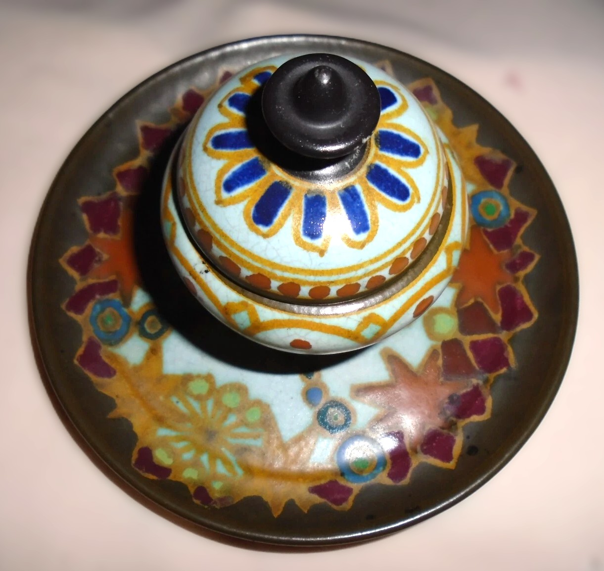This Gouda pottery inkwell is a good example of the Arnhem factory’s work during the peak of the Dutch Art Nouveau and Art Deco periods. Featuring the “Astra” pattern, it beautifully demonstrates the factory’s signature “dark border” style, characterized by a semi-matte glaze and vibrant, stylized floral abstractions.