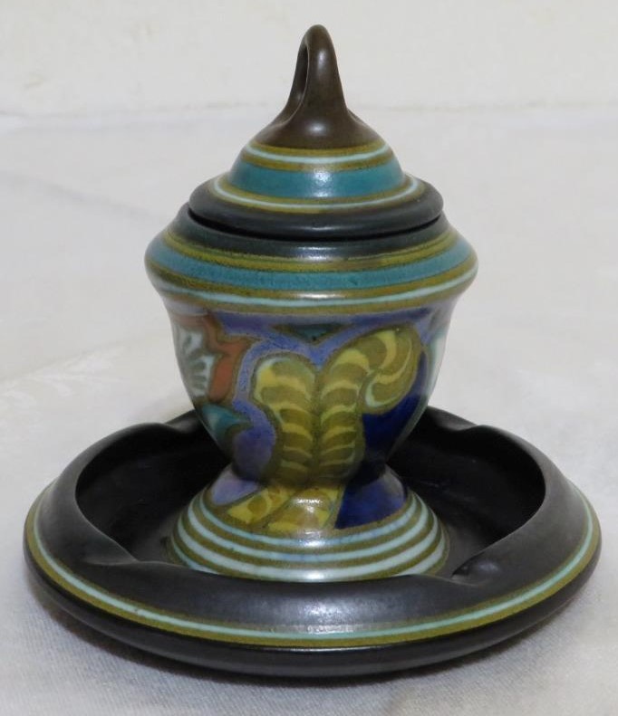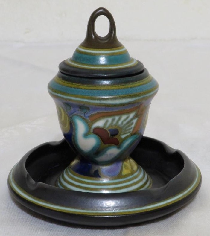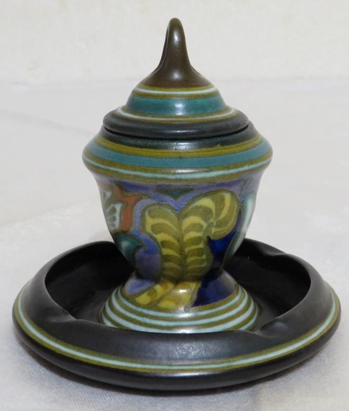 Hand painted Gouda Holland polychrome inkwell with lid.