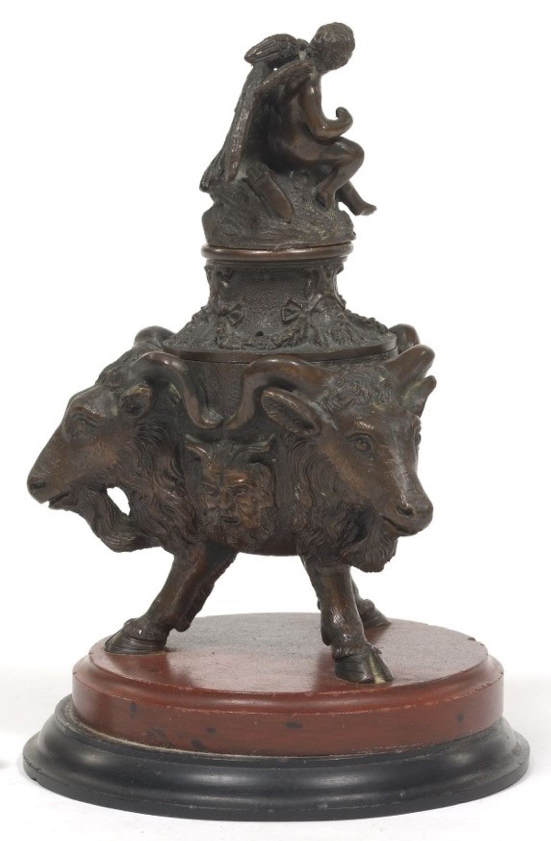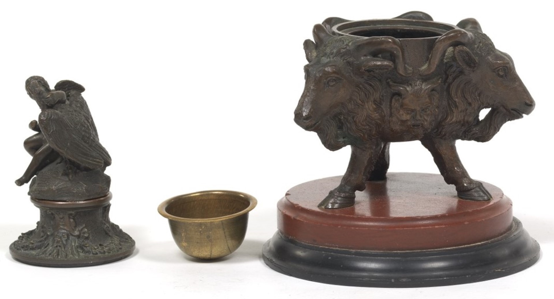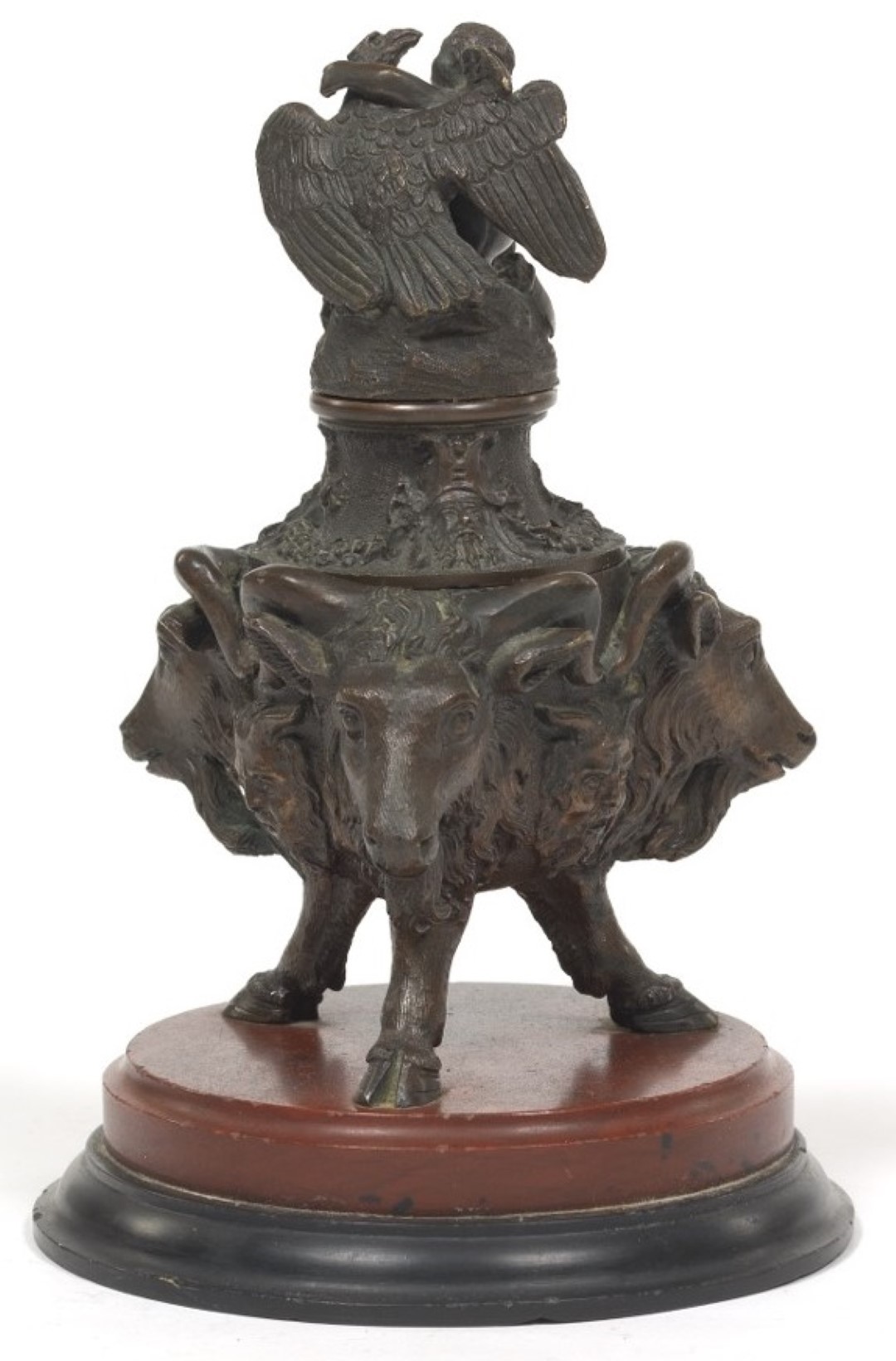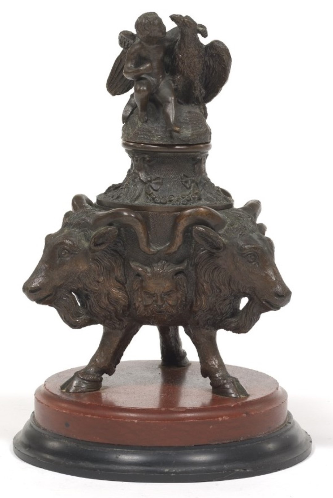 A neo-classical inkstand on a red jasper and black slate base, this cast bronze tripod inkwell is formed with three goat heads alternating with masks of Pan, all on three hoofed legs. Topped with floral garlands and a sculpture of Cupid embracing an eagle.