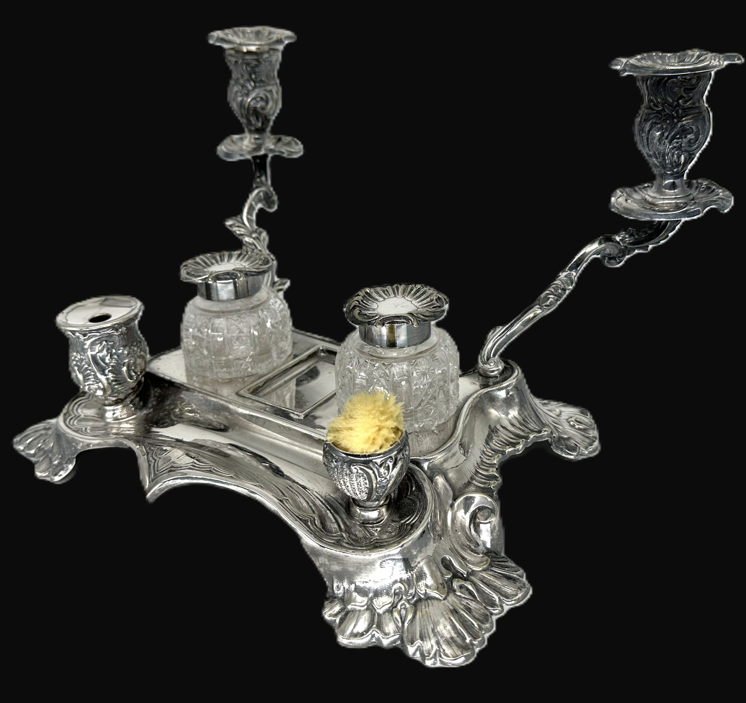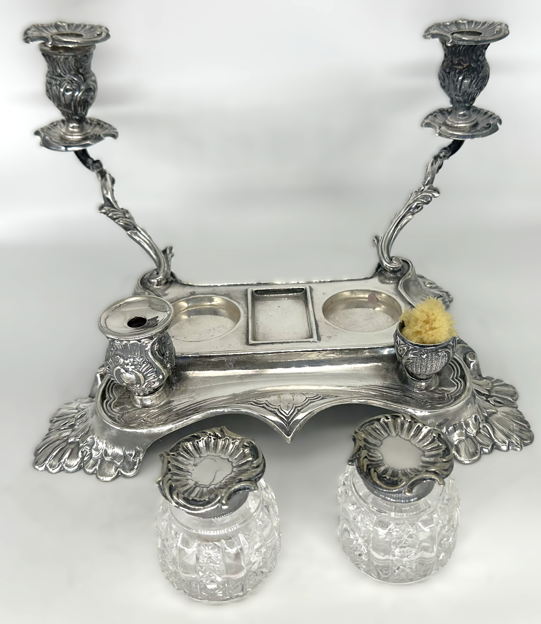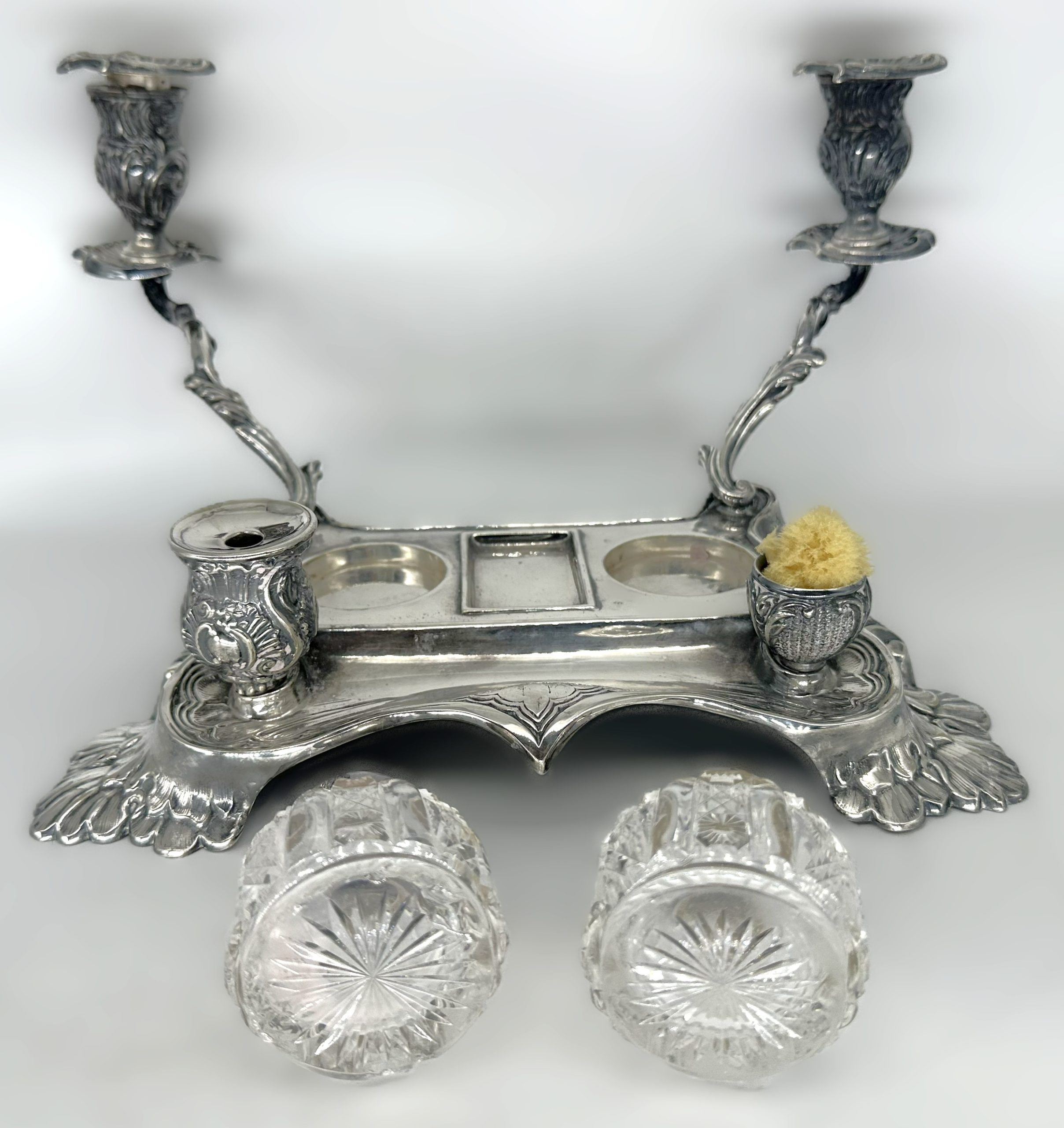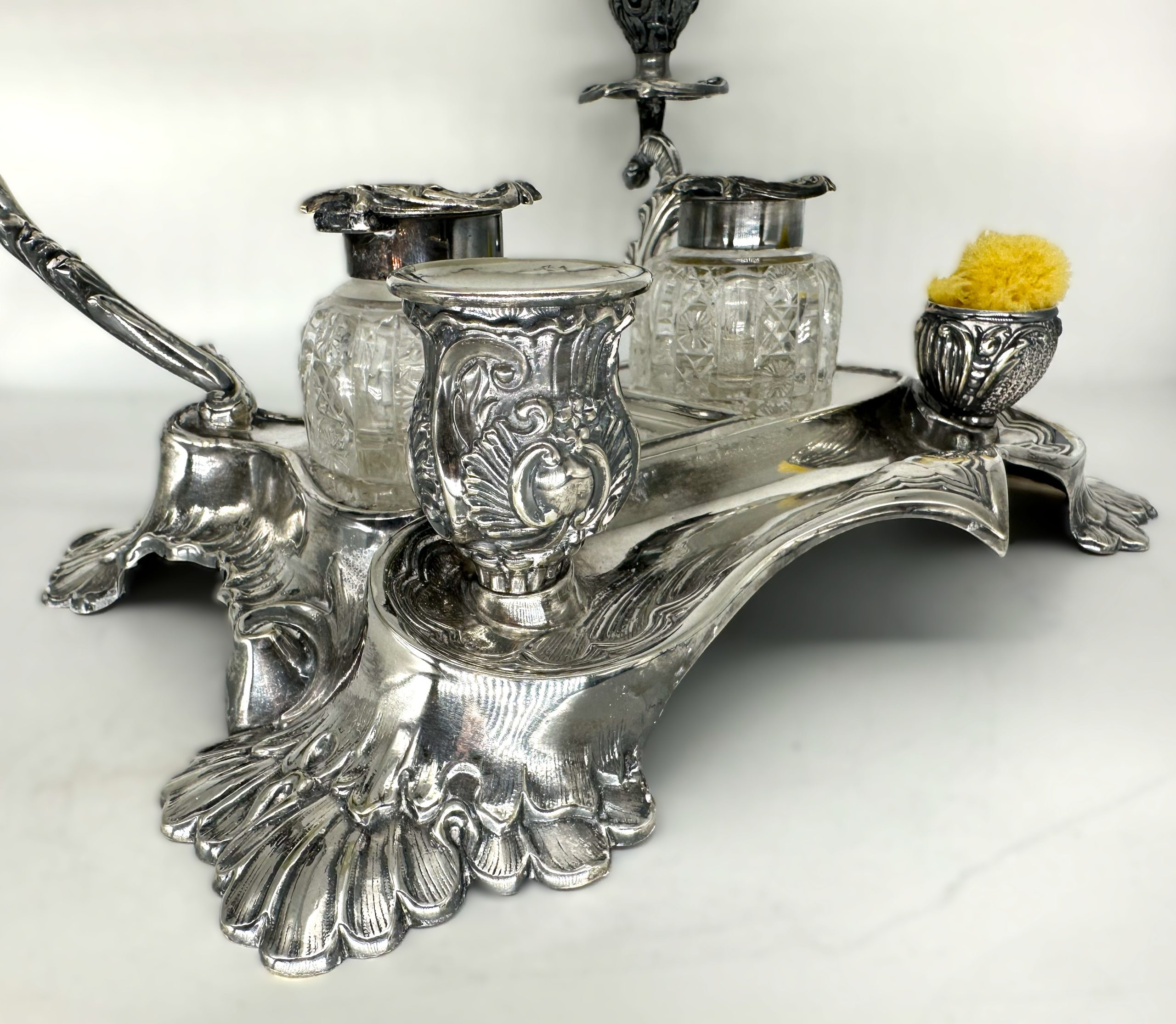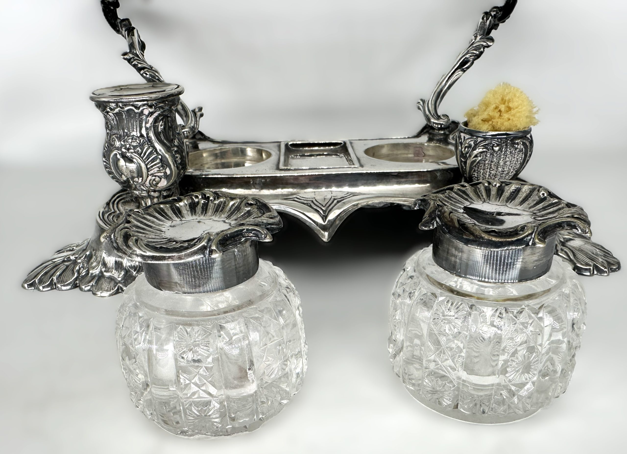 This Victorian silverplated inkstand in the ornate Rococo Revival style, likely dates from the late 19th century (circa 1880–1895).