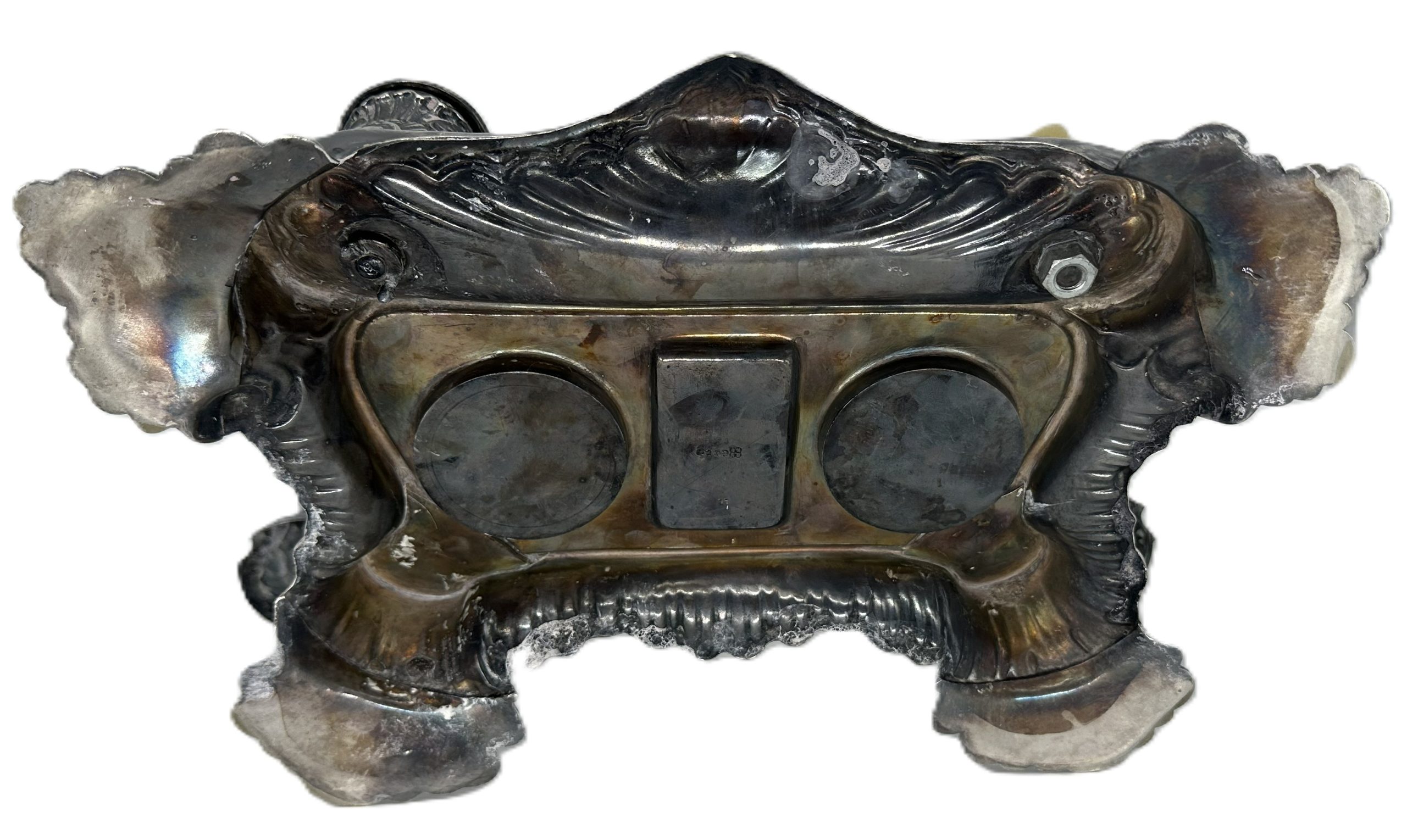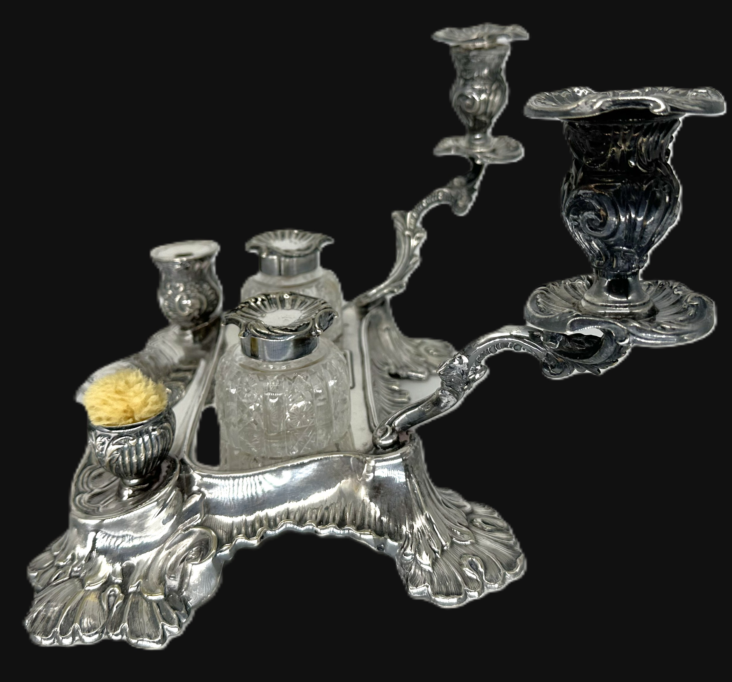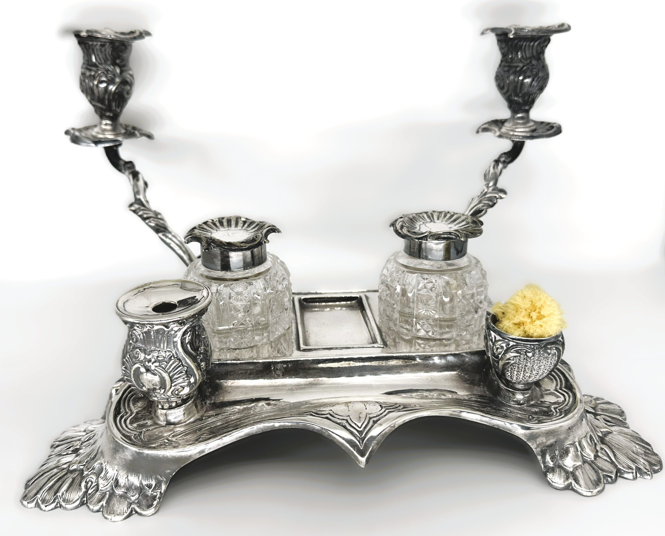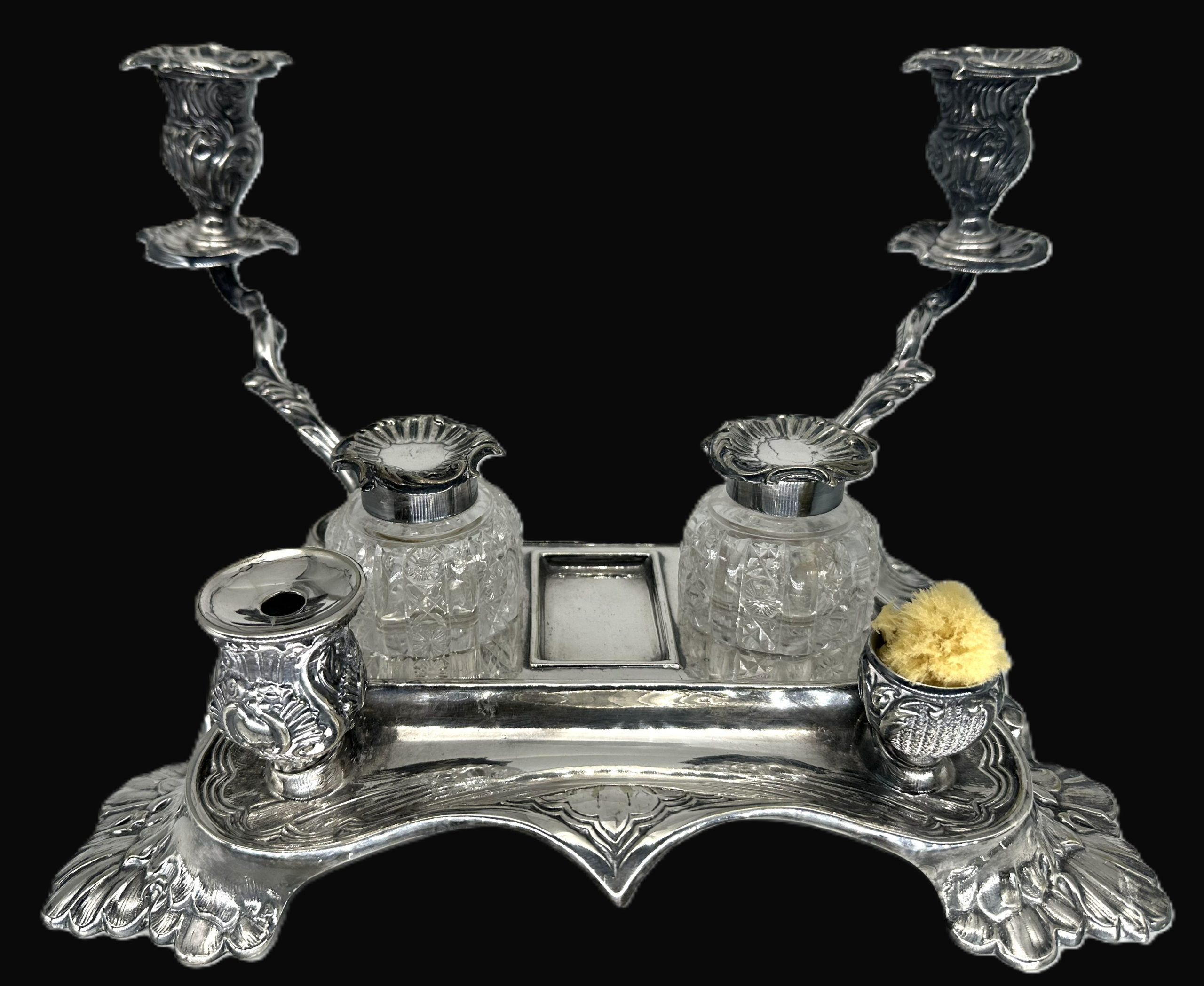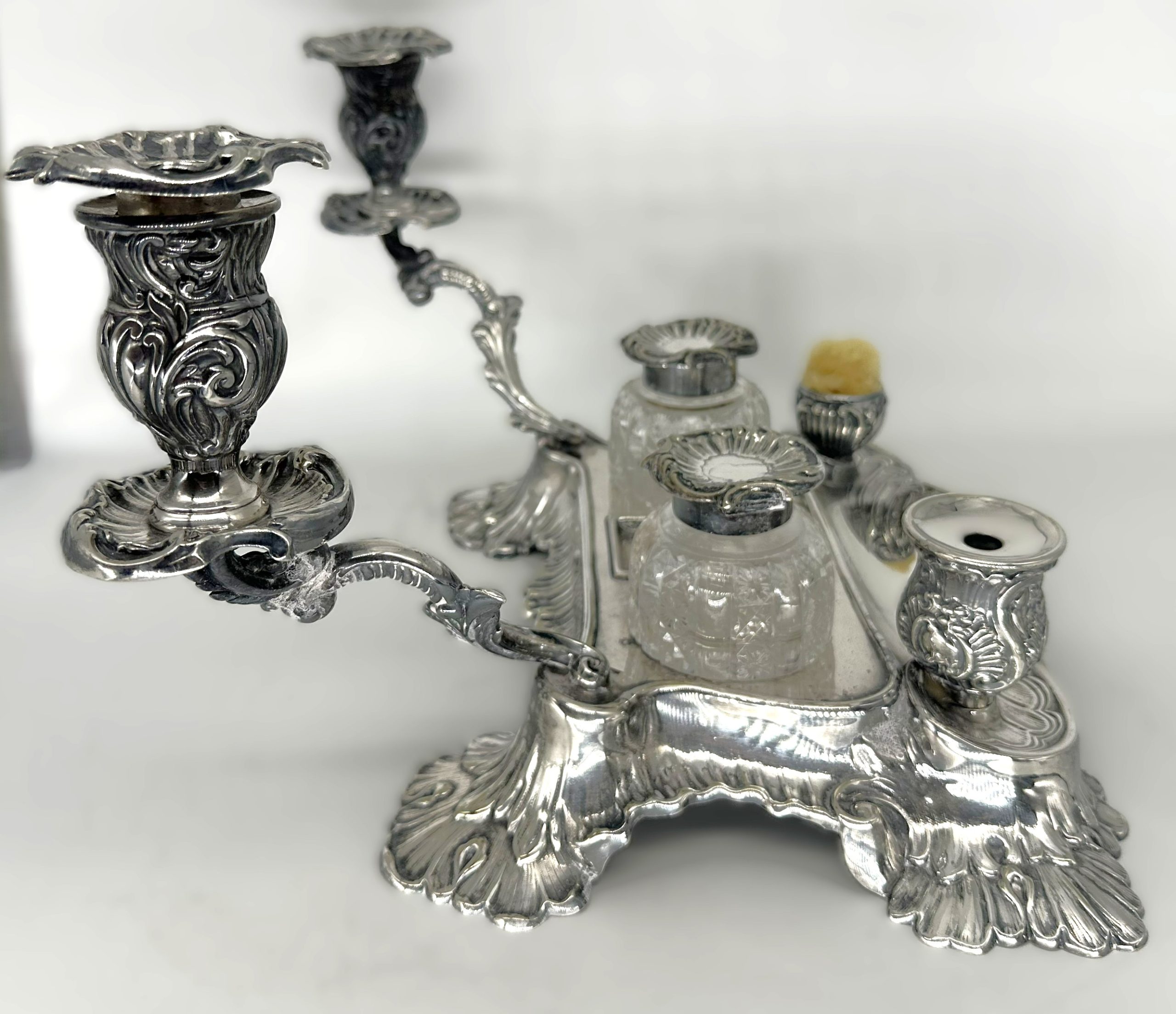 This Victorian silverplated inkstand in the ornate Rococo Revival style, likely dates from the late 19th century (circa 1880–1895).