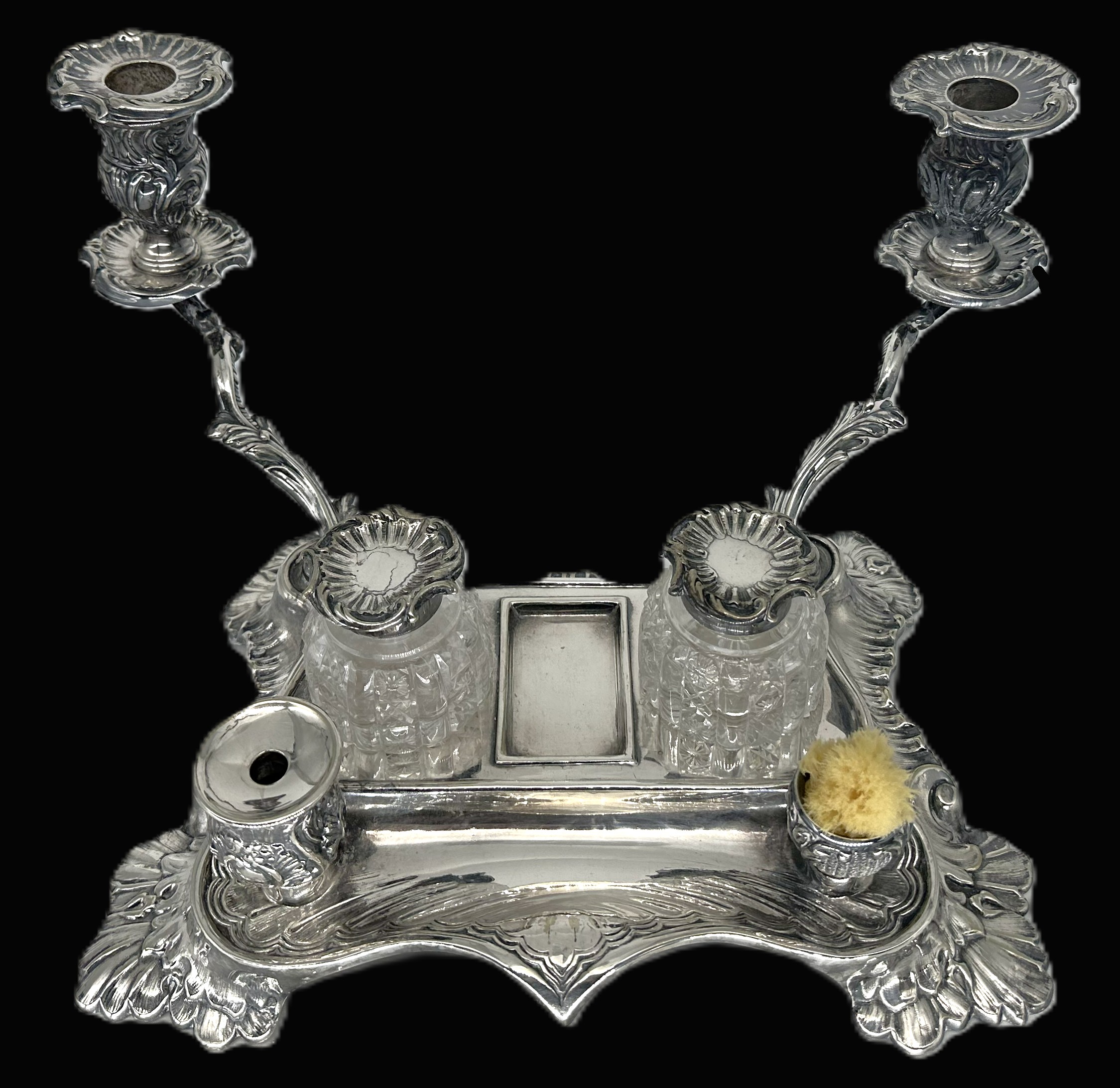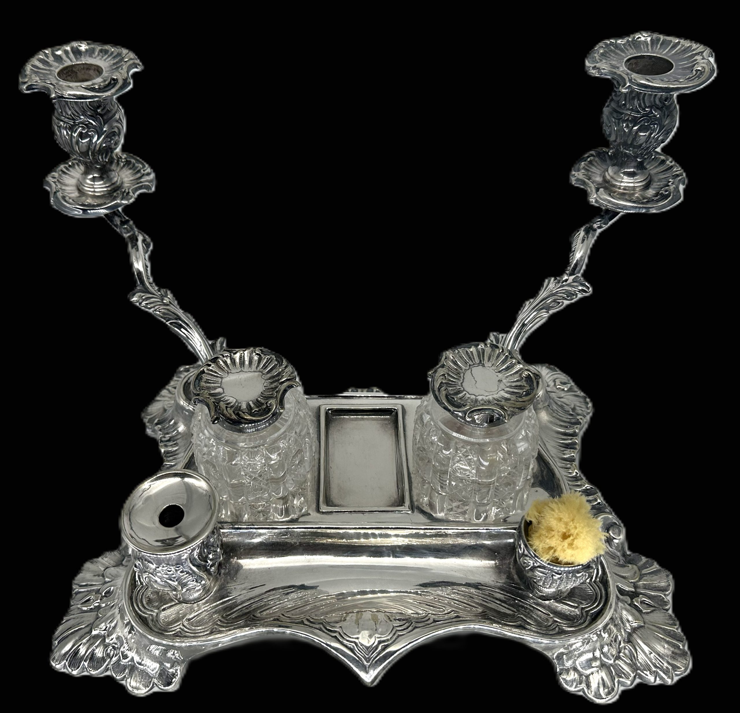 The inkstand features a heavily chased and scrolled base with classic Rococo motifs, including acanthus leaves, C-scrolls, and shell-patterned corners. It is a “complete” writing set, designed for a formal desk.