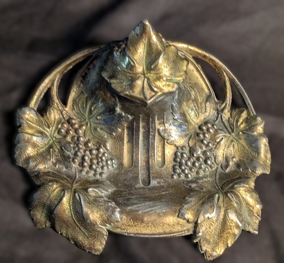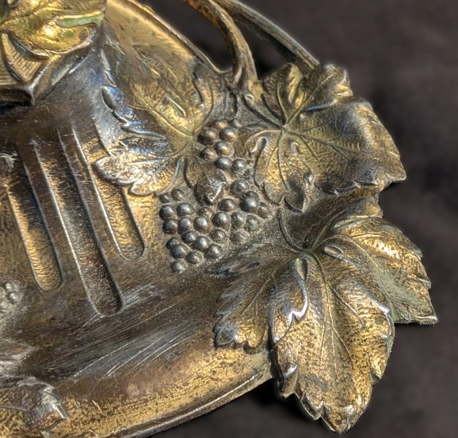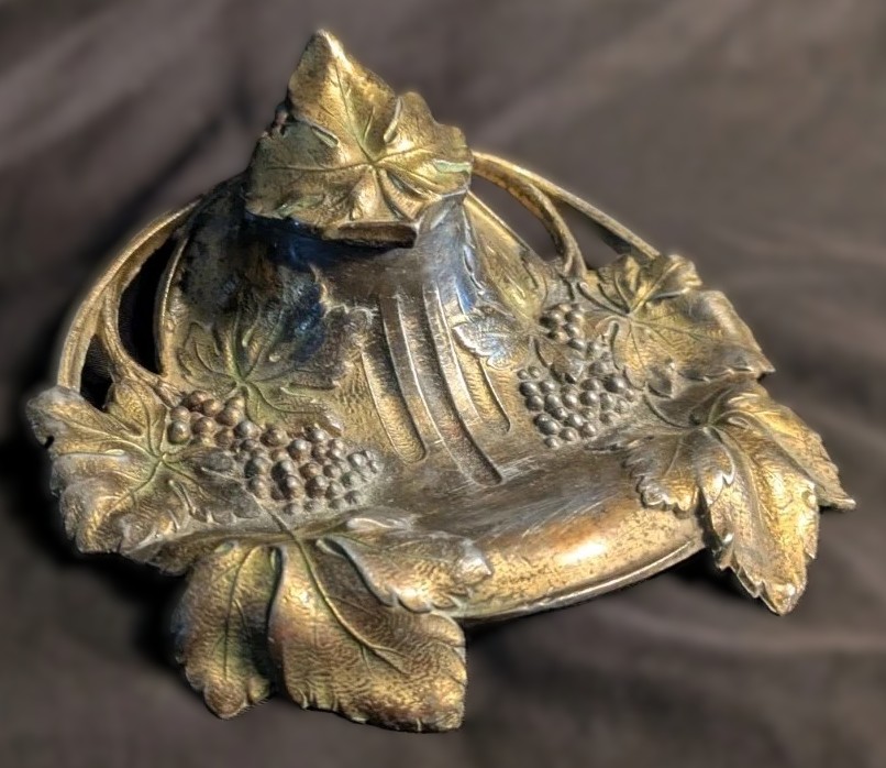 This likely was made in France. France was the epicenter of the Art Nouveau movement, and “vide-poches” (valets) and inkstands with botanical themes like grapes, mistletoe, and ivy were produced in large quantities by Parisian foundries.
