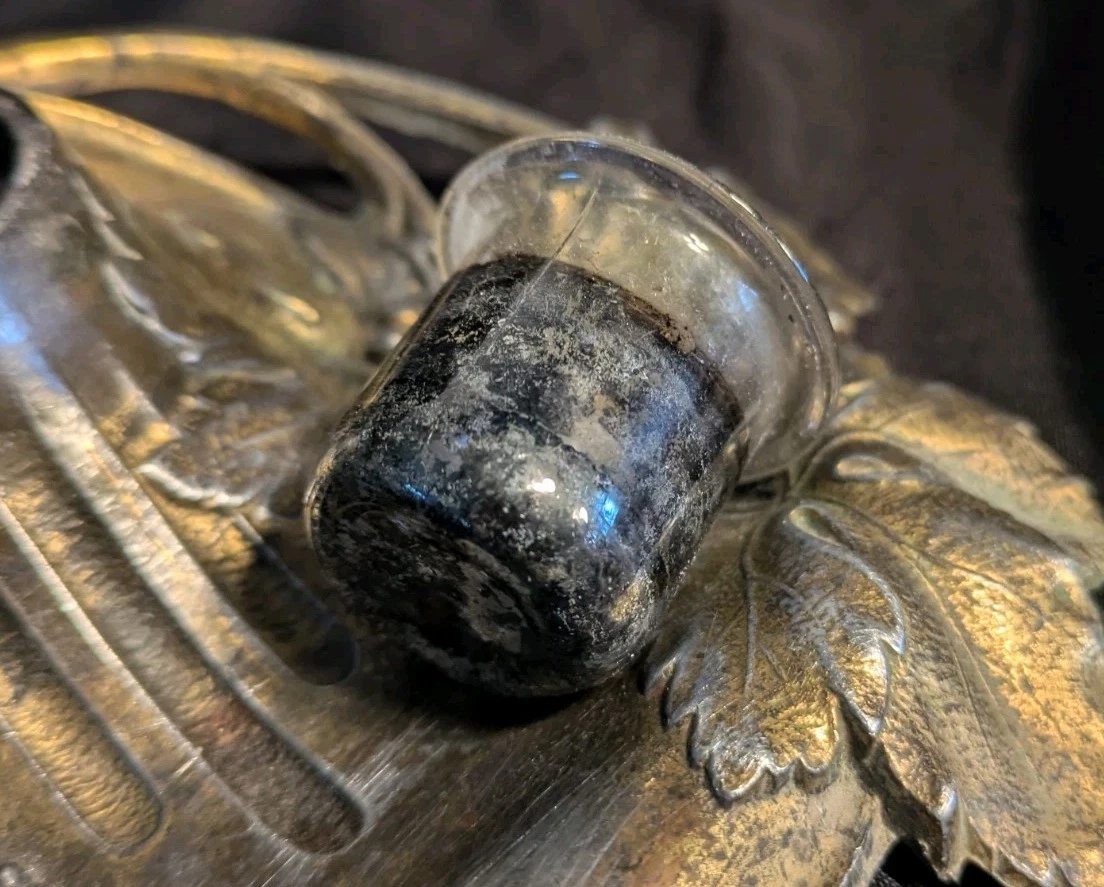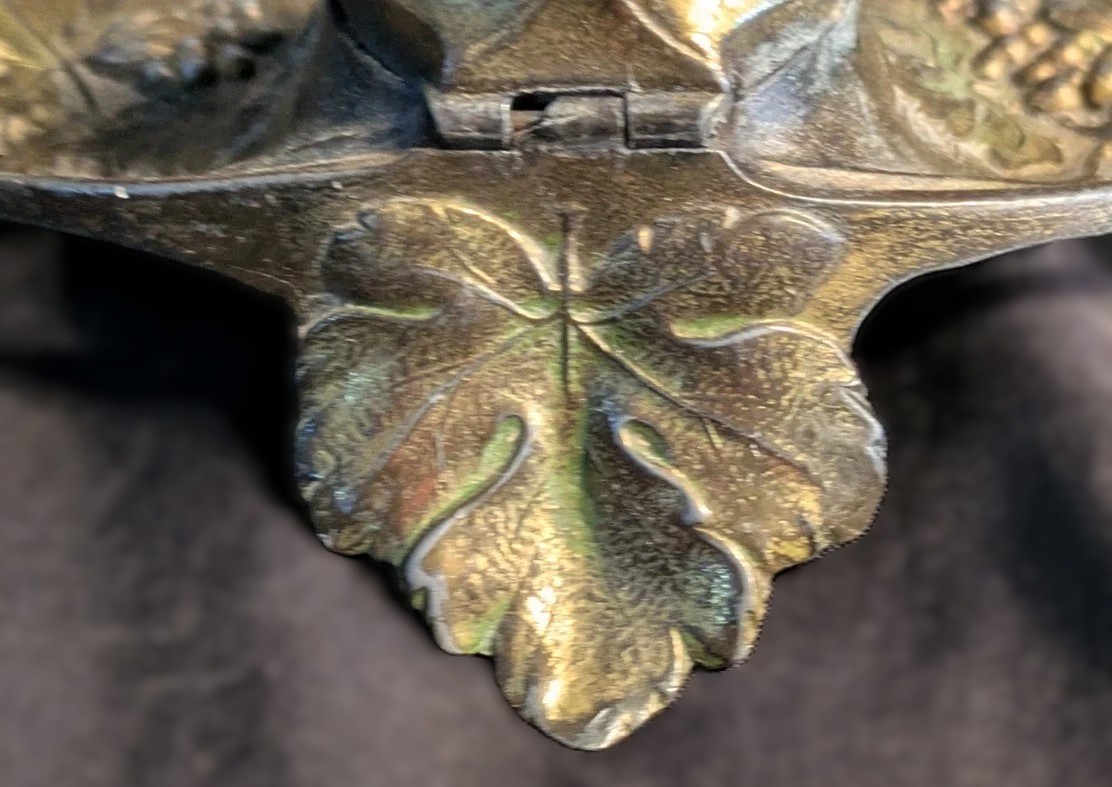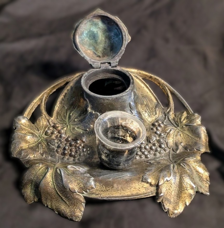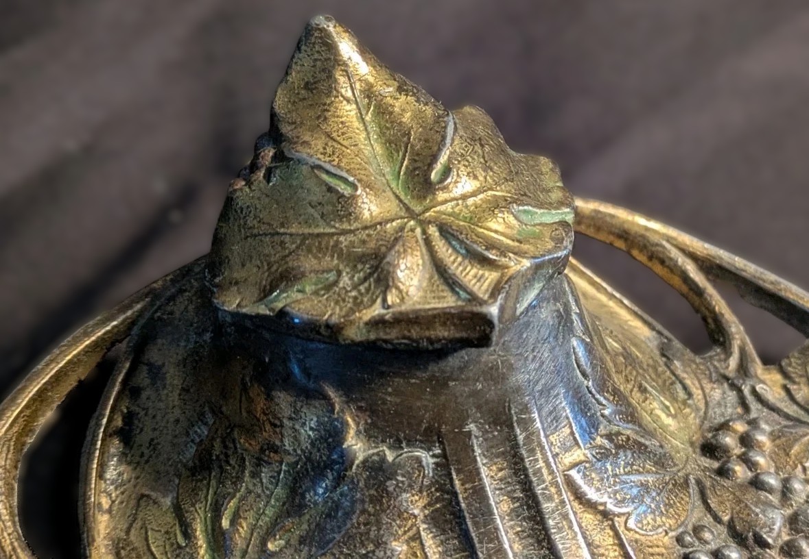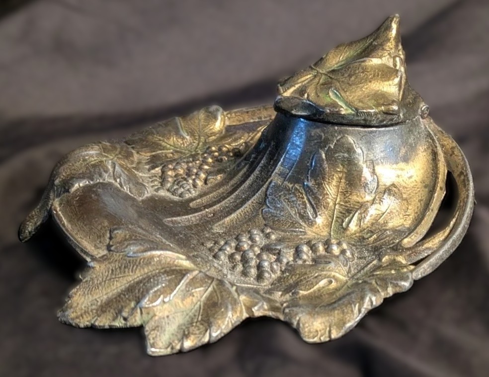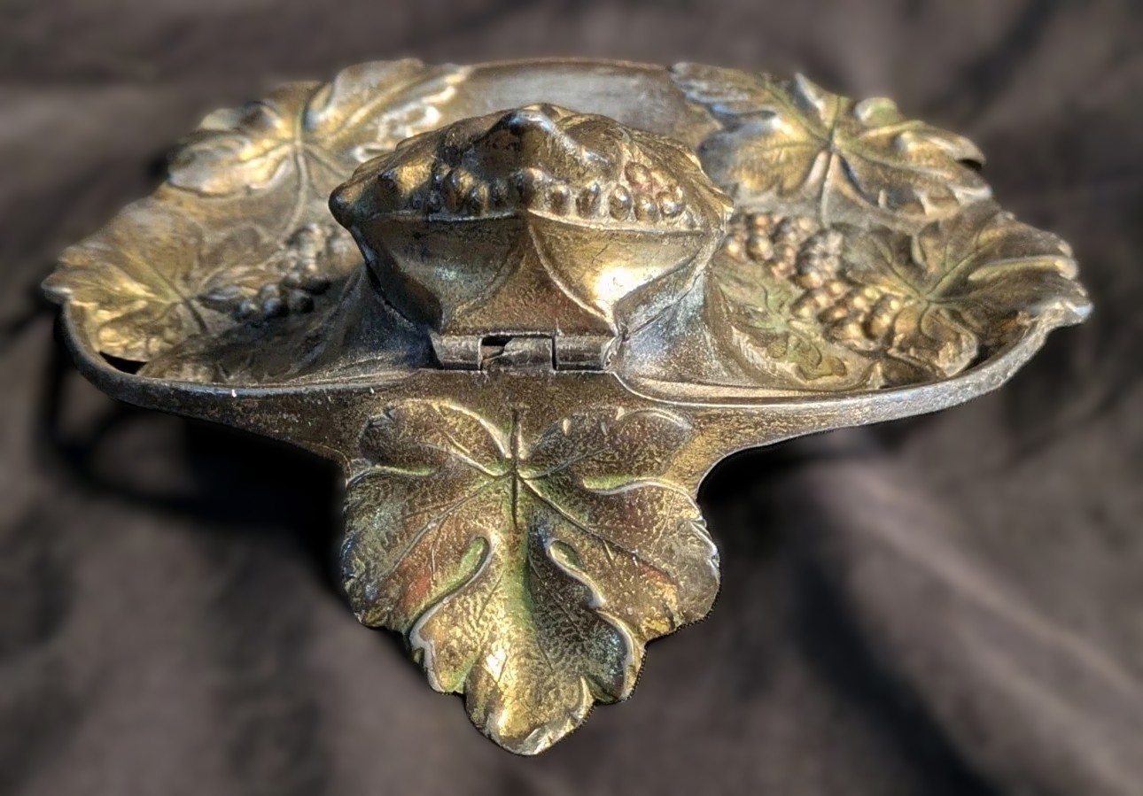 - The Motif: The central theme is a lush grapevine. Two large, detailed vine leaves form the front “feet” and extend upward to cradle the inkwell. Clusters of ripe grapes are nestled on either side of the well, while a smaller, single leaf serves as the hinged lid.