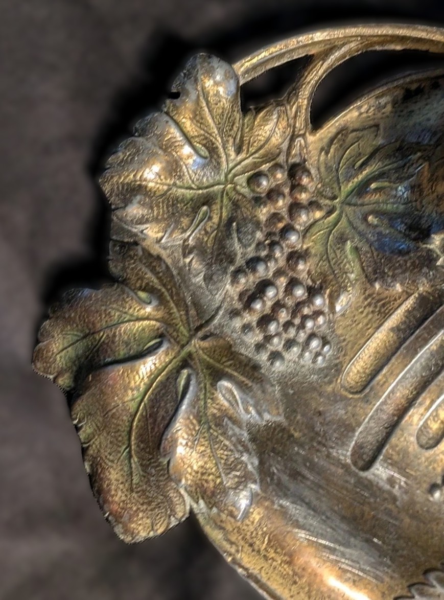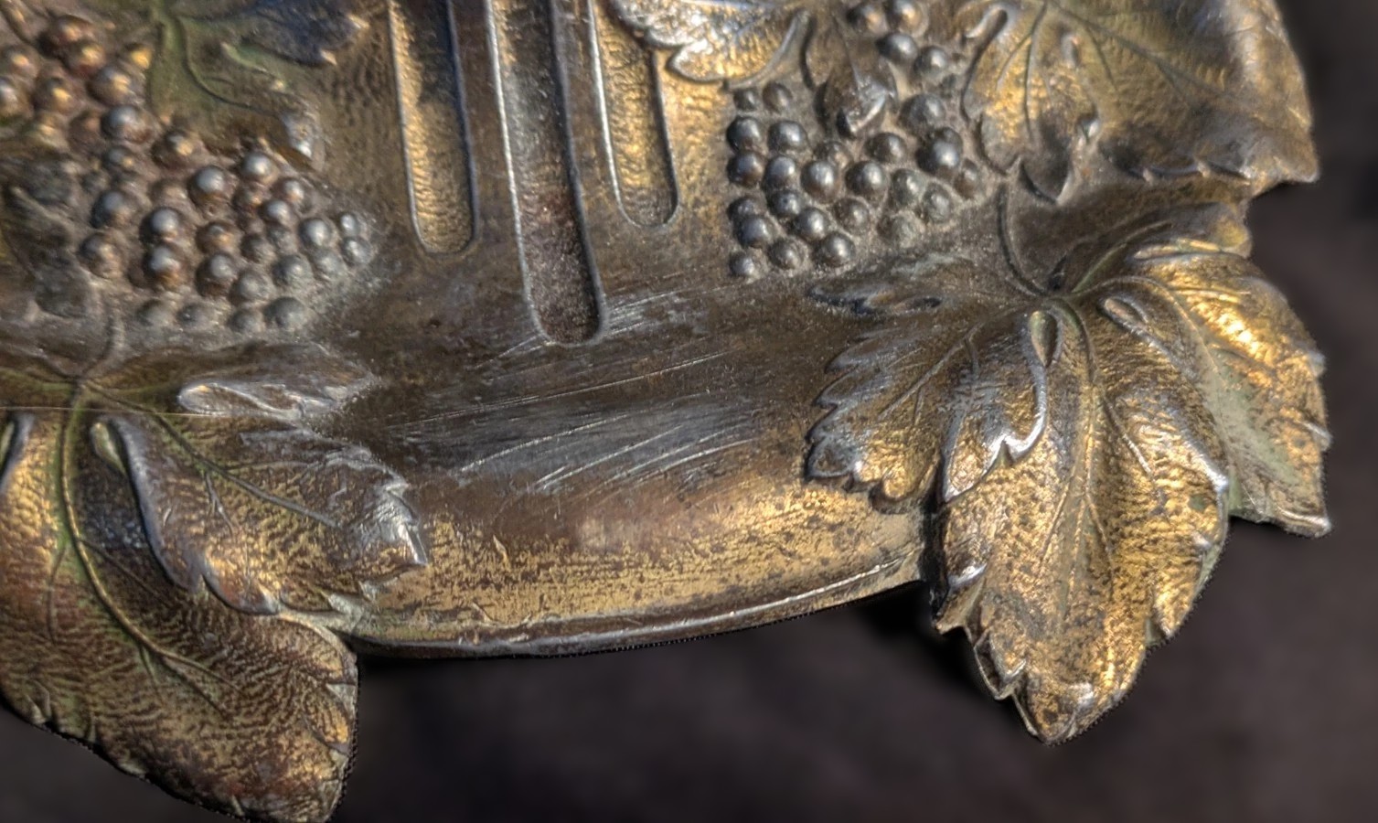 While there are no visible maker’s marks in the photos, these pieces were often produced by noted foundries such as L.V.E. (Léopold Van Est) or various Limoges-area metalworkers. The grape and vine motif was particularly popular because it symbolized abundance and was a nod to the French wine regions.