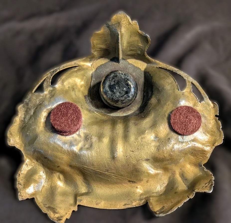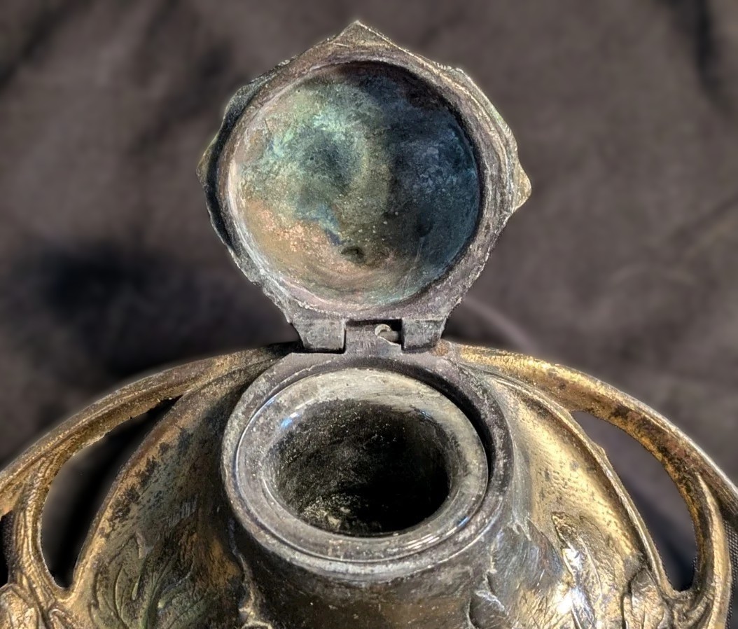 - The Structure: Behind the inkwell, a stylized open-framework arch or “handle” suggests a more structured, almost architectural influence, common in French Art Nouveau designs. The shallow depression in the front serves as a pen tray.