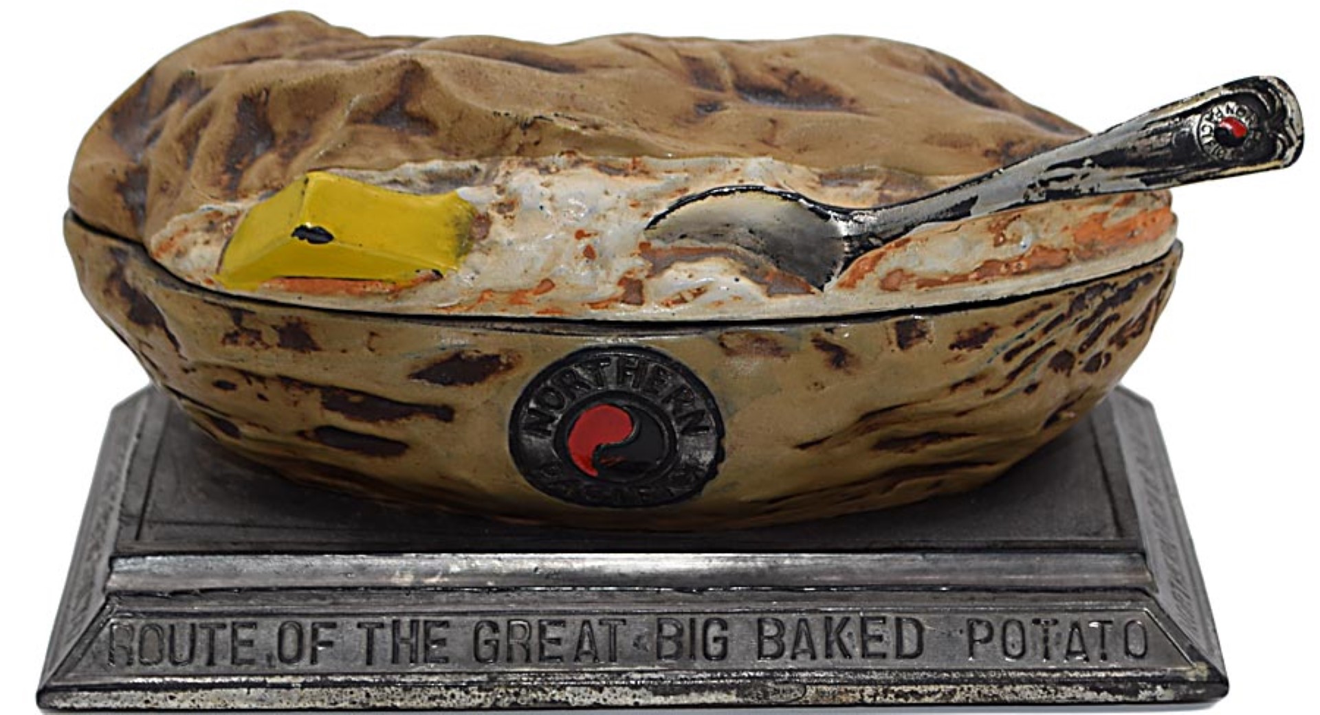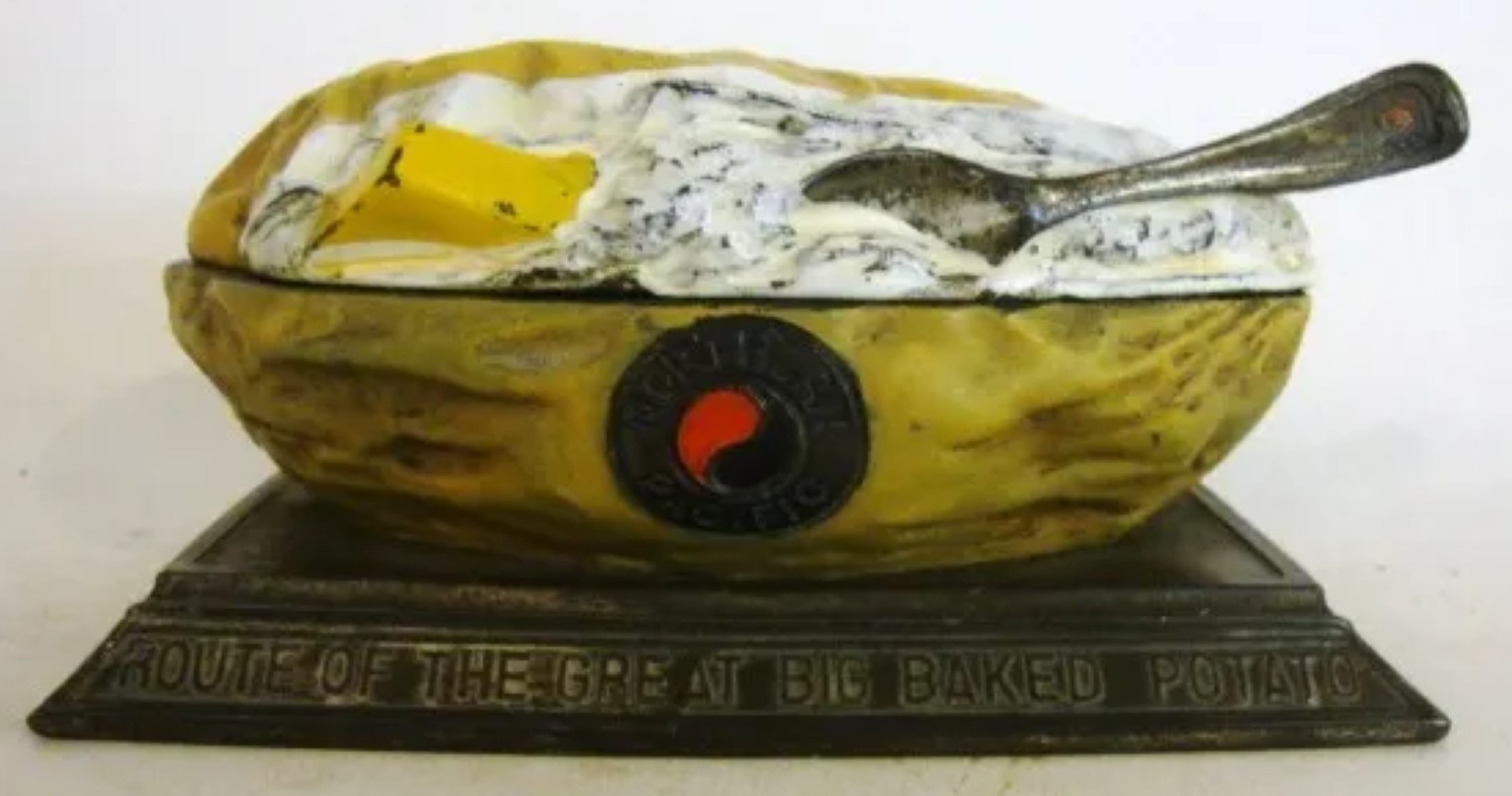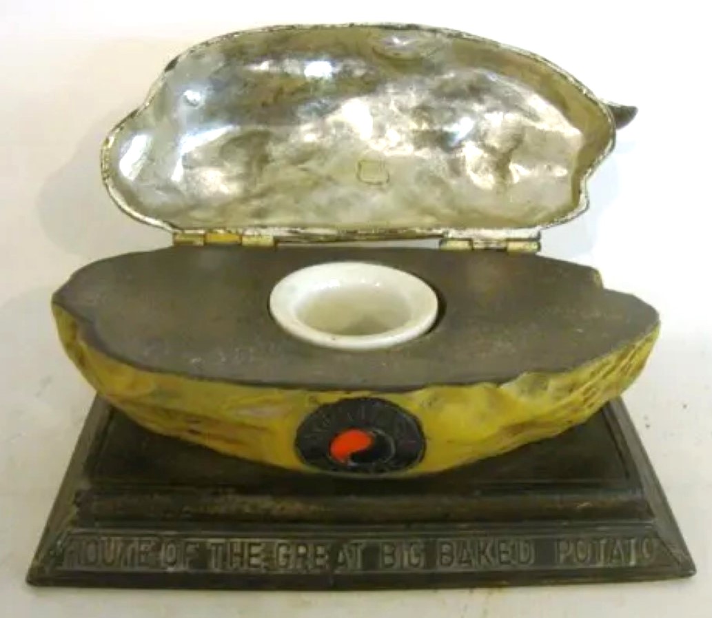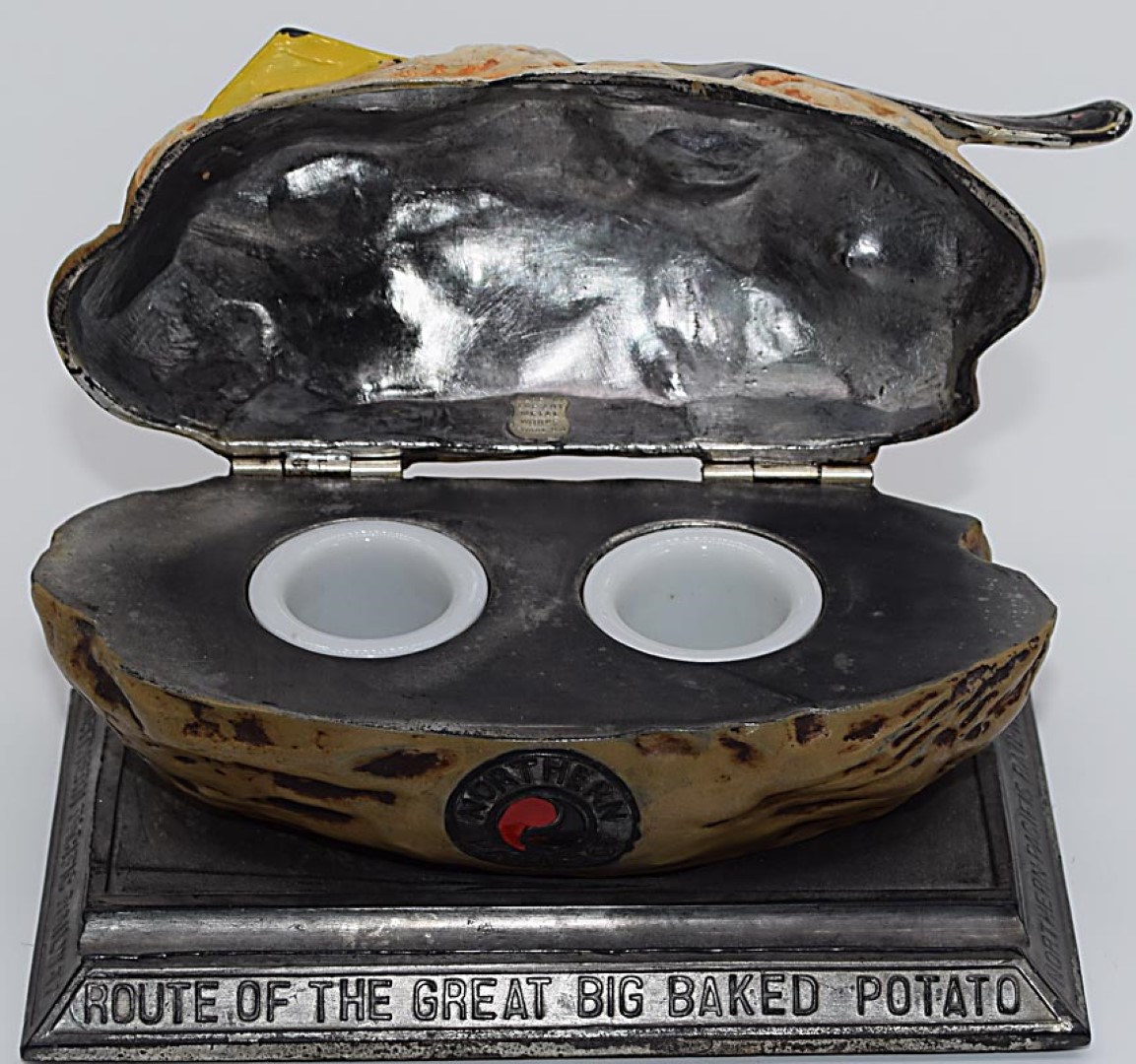 These potato inkwells, smothered in butter with a spoon at the ready, were part of the Northern Pacific Railroad’s advertising campaign “Route of the Great Baked Potato”. Made by the Art Metal Works in New Jersey, there is both a “single” inkwell and “double” inkwell.