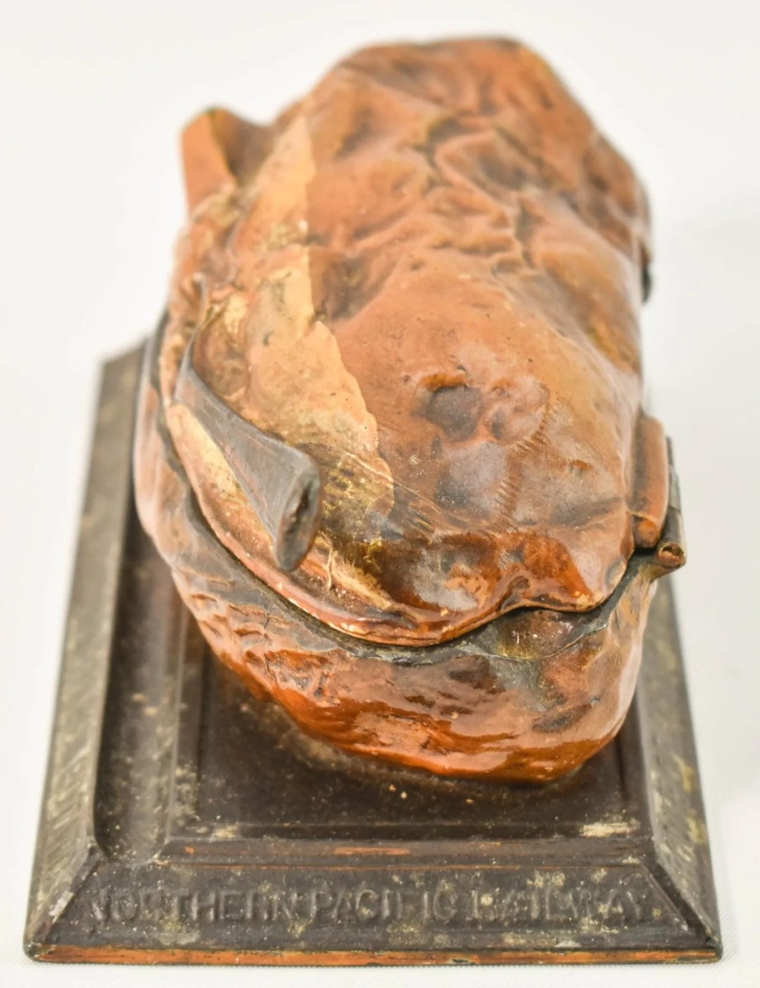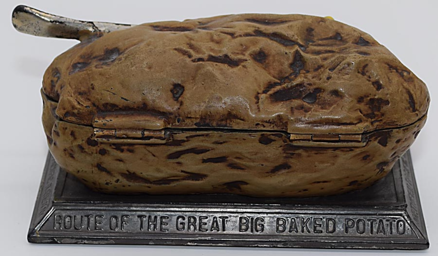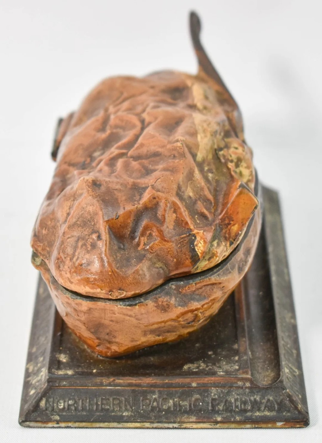 These potato inkwells, smothered in butter with a spoon at the ready, were part of the Northern Pacific Railroad’s advertising campaign “Route of the Great Baked Potato”. Made by the Art Metal Works in New Jersey, there is both a “single” inkwell and “double” inkwell.