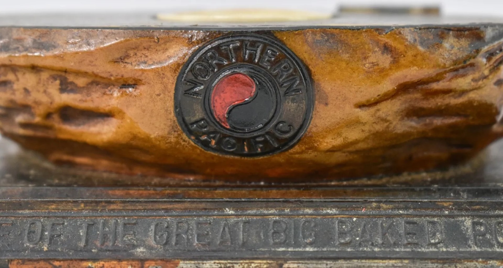 When an addition was built for the Northern Pacific’s Seattle commissary in 1914, a Railway Age reporter wrote, “A large trademark, in the shape of a baked potato, 40 ft. long and 18 ft. in diameter, surmounts the roof. The potato is electric lighted and its eyes, through the electric mechanism, are made to wink constantly. A cube of butter thrust into its split top glows intermittently.” Premiums such as postcards, letter openers, ink blotters (one pictured here) and spoons were also produced to promote “The Route of the Great Big Baked Potato”; the slogan served the Northern Pacific for about 50 years.