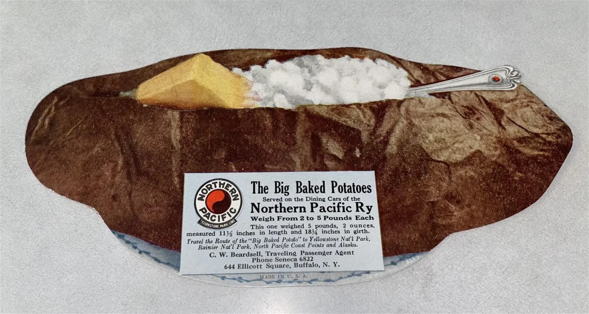 Titus and his staff discovered the “inedible” potatoes were delicious after baking in a slow oven. He contracted to purchase as many potatoes as the farmers could produce that were more than two pounds in weight. Soon after the first delivery of “Netted Gem Bakers”, they were offered to diners on the North Coast Limited beginning in early 1909. Word of the line’s specialty offering traveled quickly, and before long it was using “the Great Big Baked Potato” as a slogan to promote the railroad’s passenger service. Hollywood stars were hired to promote it (Lillian Russell among others).