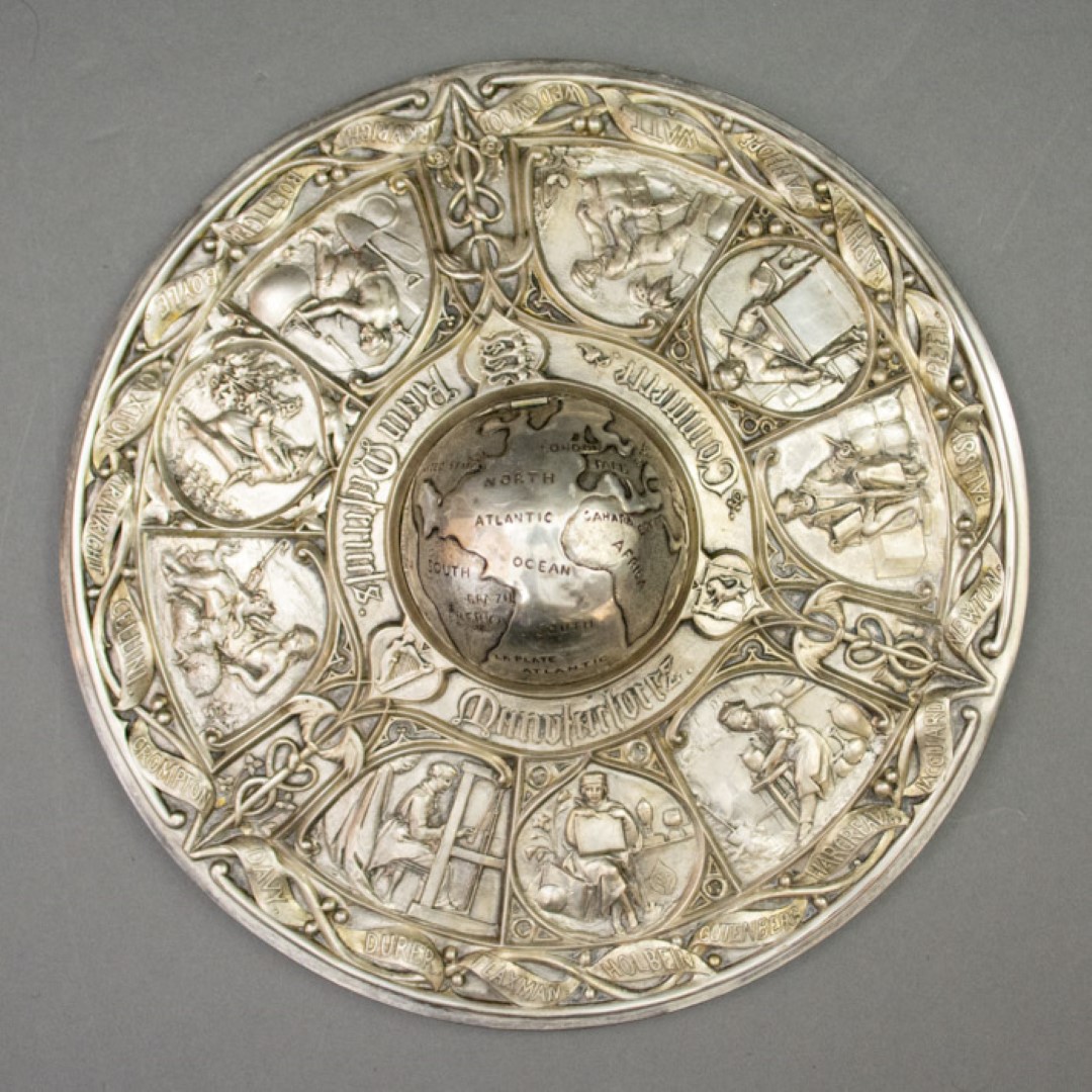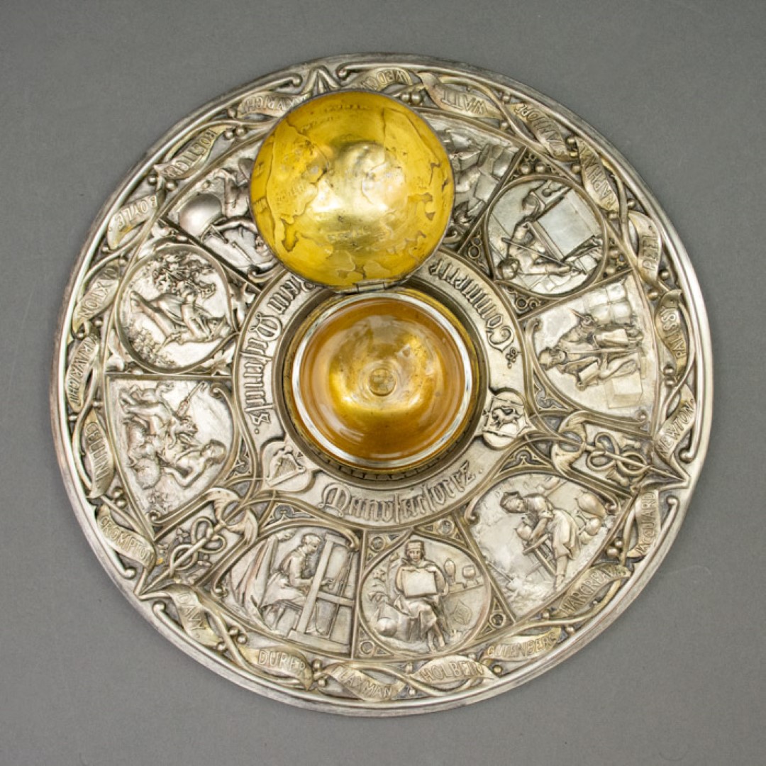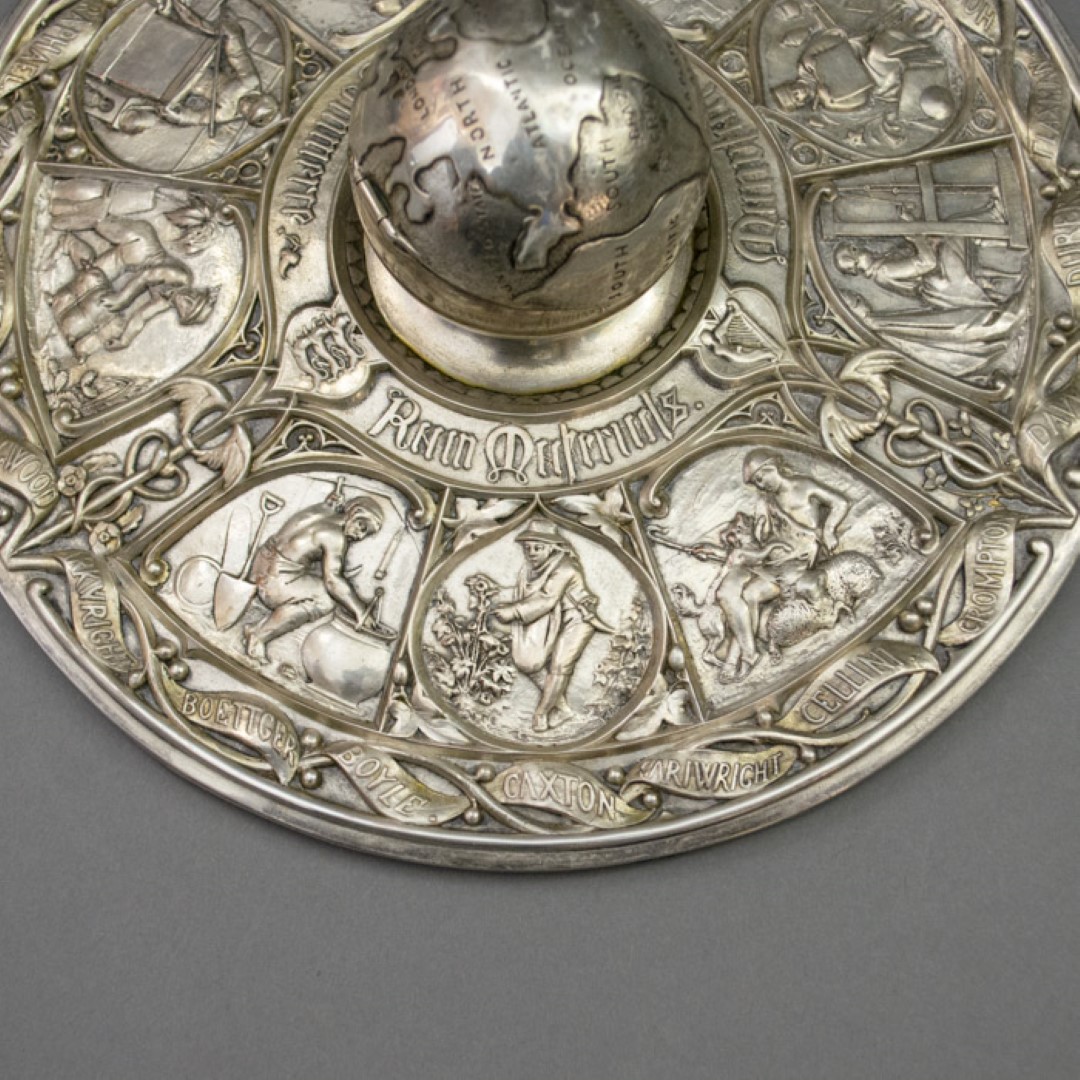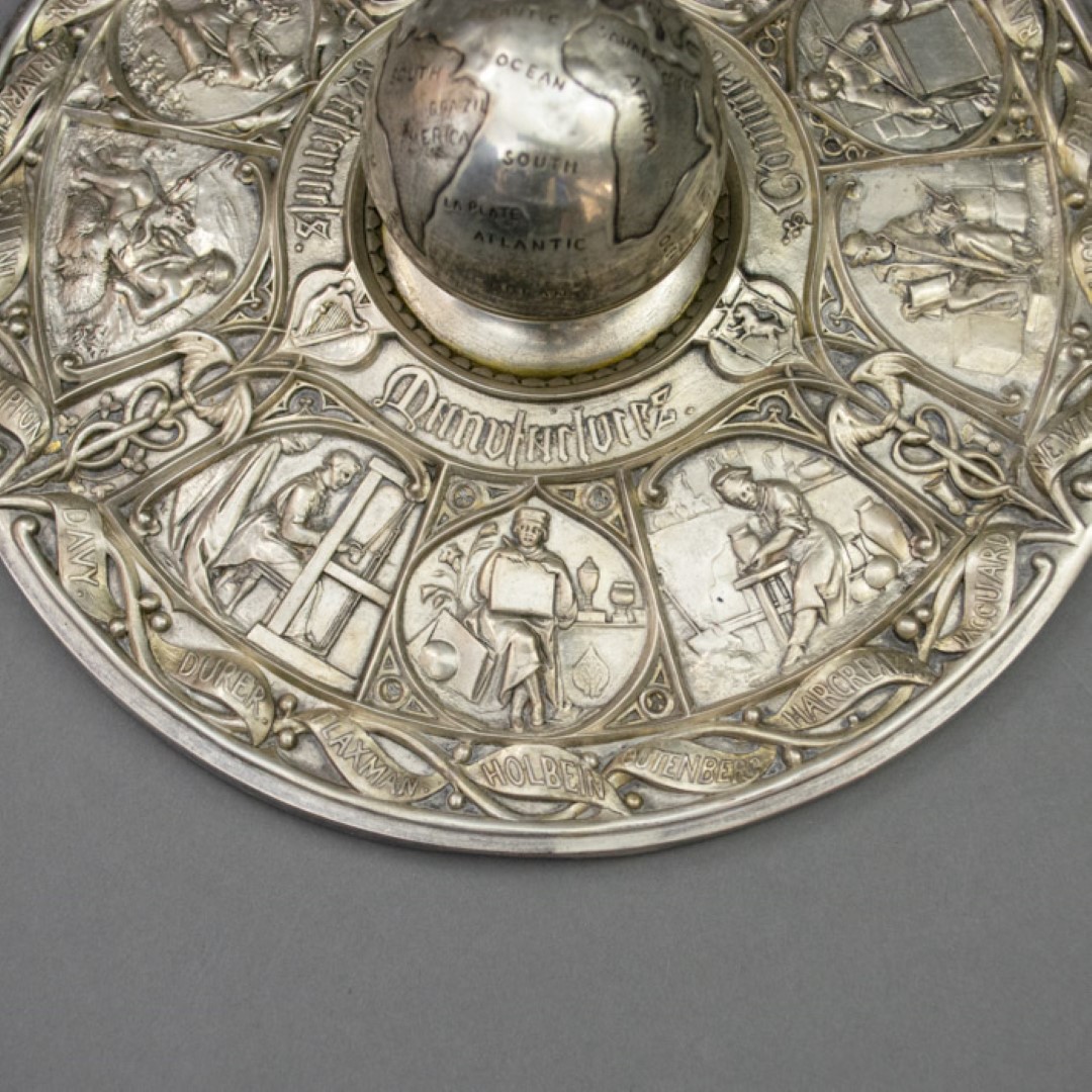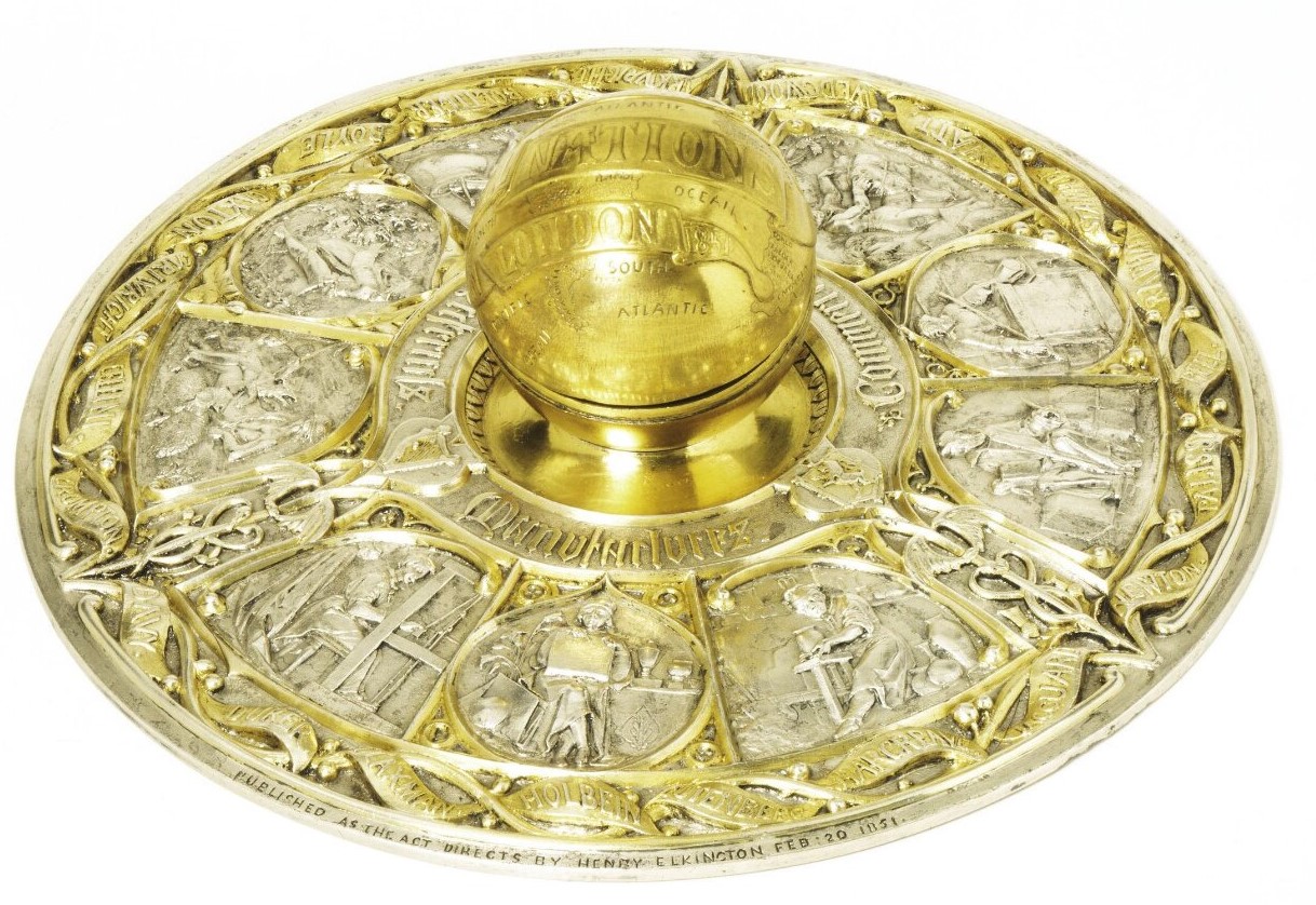 Commemorative inkwell produced for the Great Exhibition of 1851 comprised of a silver-gilt terrestrial globe with gilt interior opening to reveal a blown glass inkwell within. It is mounted in the center of a circular silver-plated repoussé base having allegorical vignettes of Raw Materials, Commerce, and Manufacturers. On the base, each category is labeled in Gothic lettering and represented by three illustrations: Raw Materials by a man at a cauldron, a farmhand picking sugar cane, and a sheepherder; Manufacturers by a weaver at a loom, an artist drawing, and a potter; and Commerce by a man with a ledger and pen beside a wrapped parcel, a person apparently laying out a bolt of cloth, and a man moving the parcel in a tropical landscape. The vignettes are separated by elaborate Gothic borders, with three caducei separating the categories. The inkstand was made by Elkington & Co. and was gilded by electric current, an innovative process at the time. There is one in the collection of London’s Victoria & Albert Museum that was donated by its designer, John Leighton.