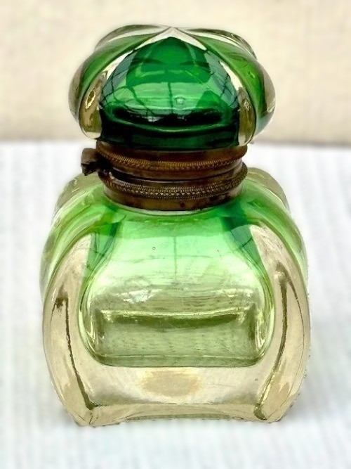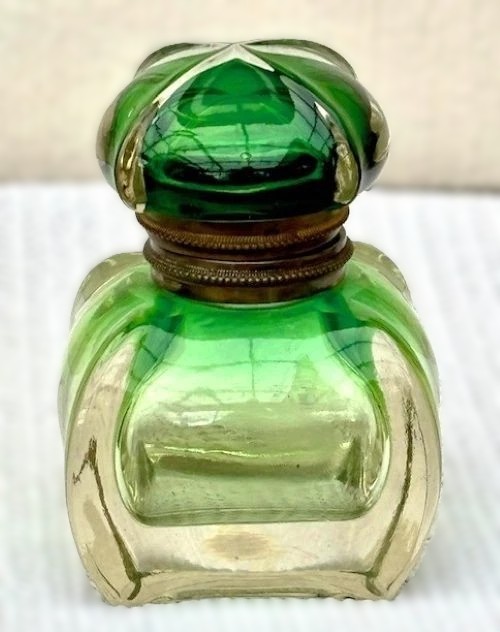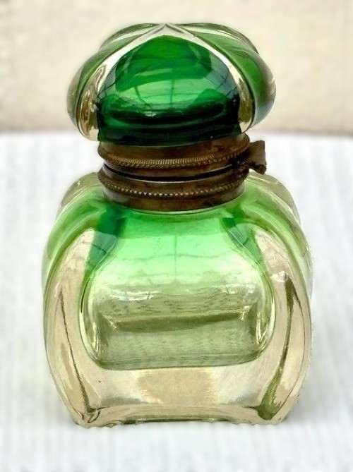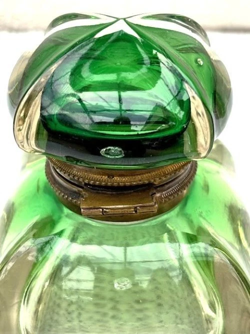- Lid: A domed green glass top, secured with a metal hinge and collar.