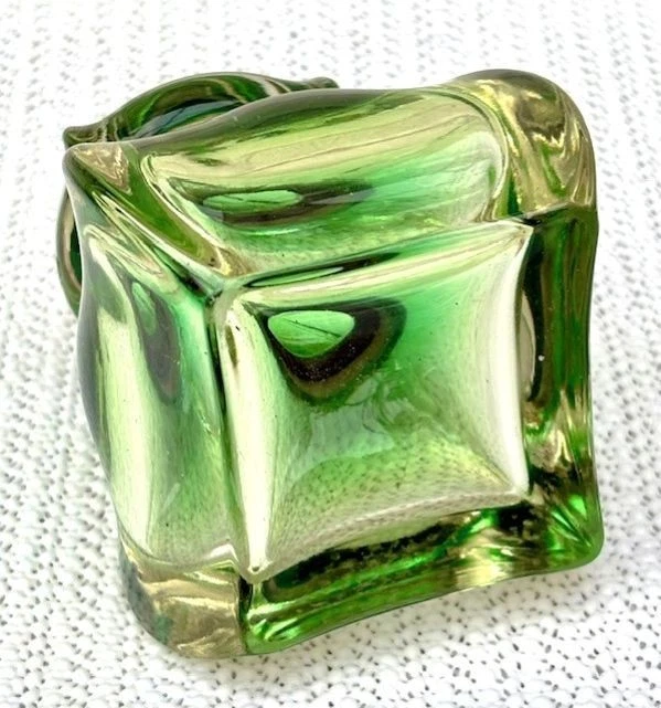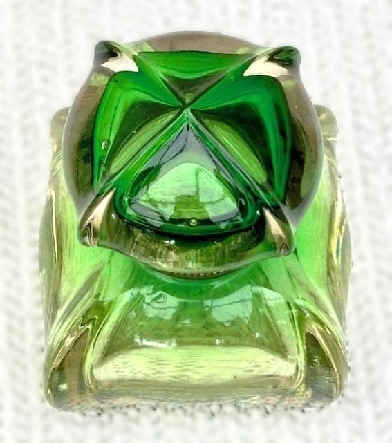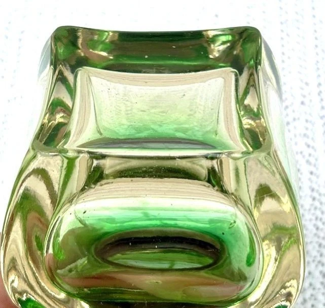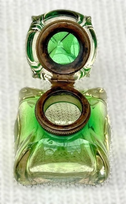This glass inkwell features a harmonious interplay of green and clear glass.