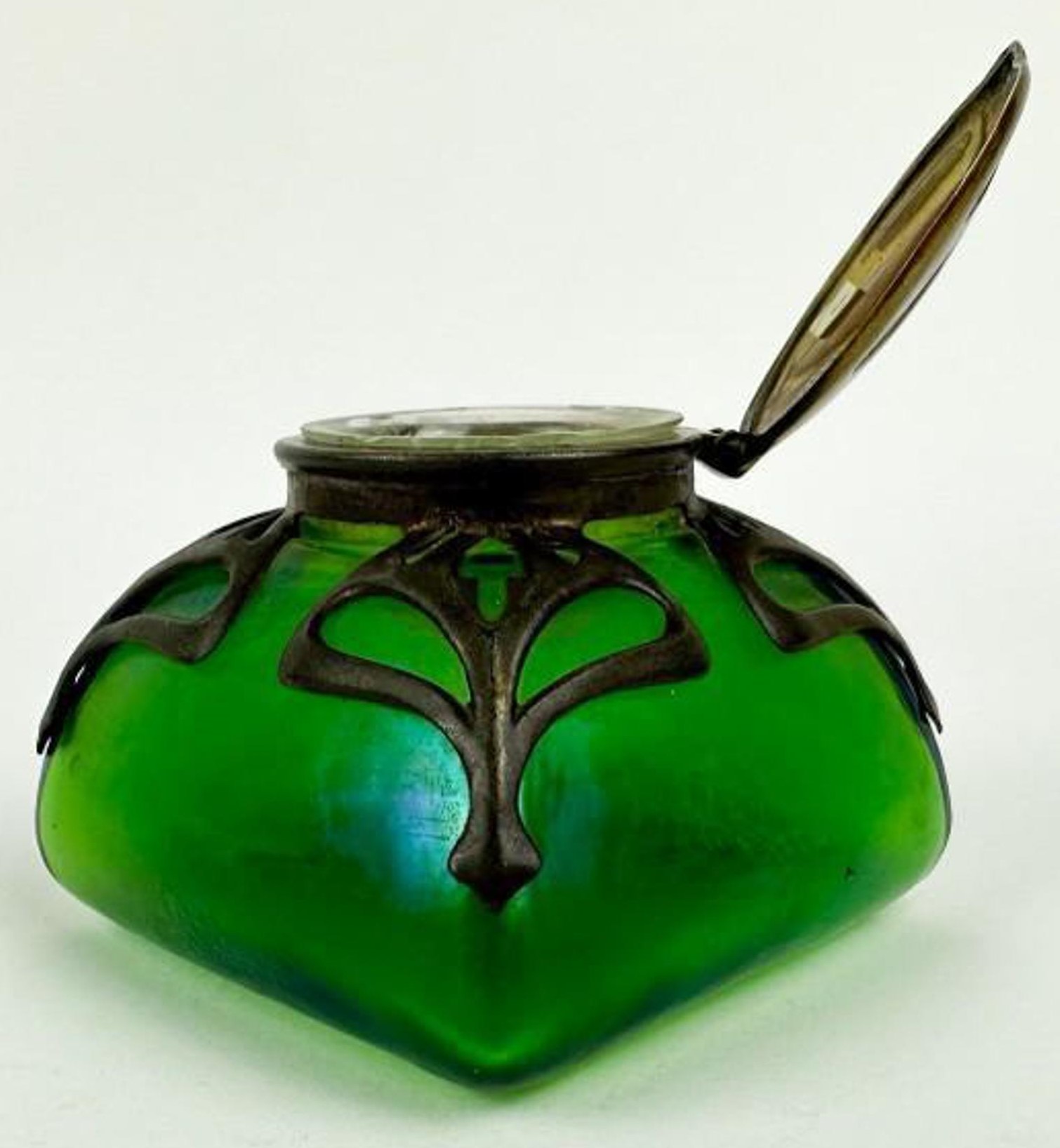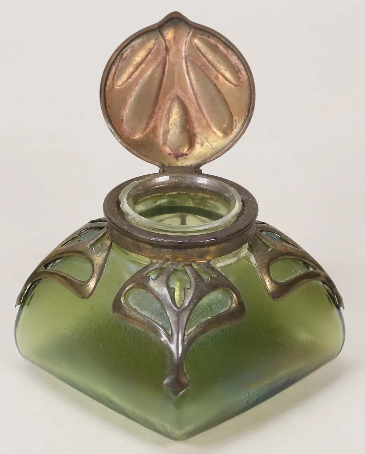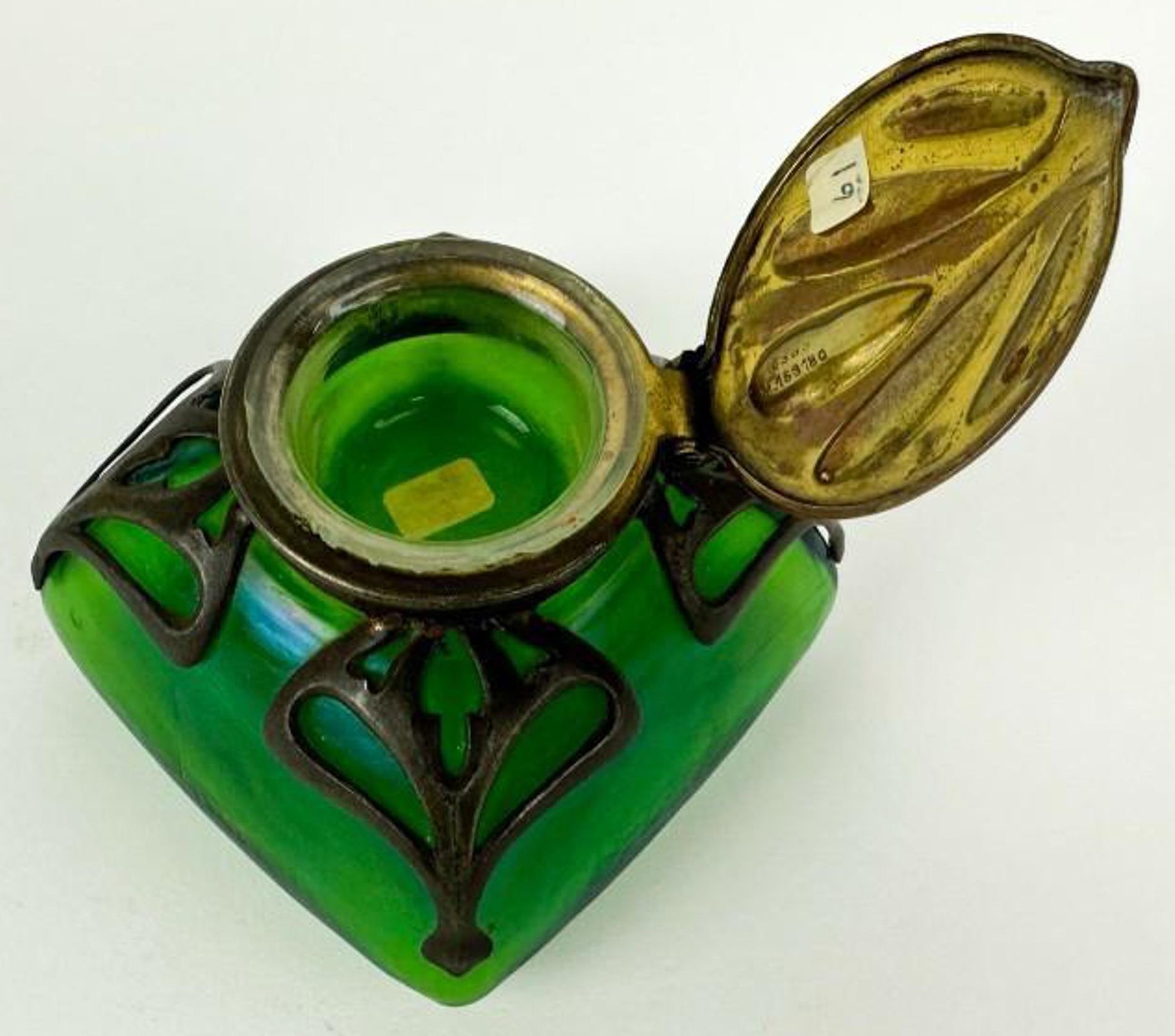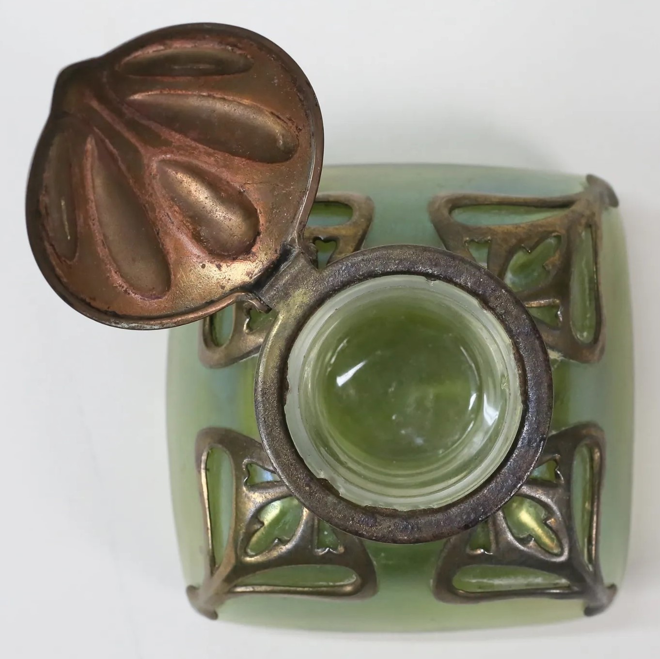 Attributed to Stölzle & Sons, shown are two Art Nouveau art glass inkwells. Both were made in shades of green with ornamental brass mounting, and a hinged foliage form lid.