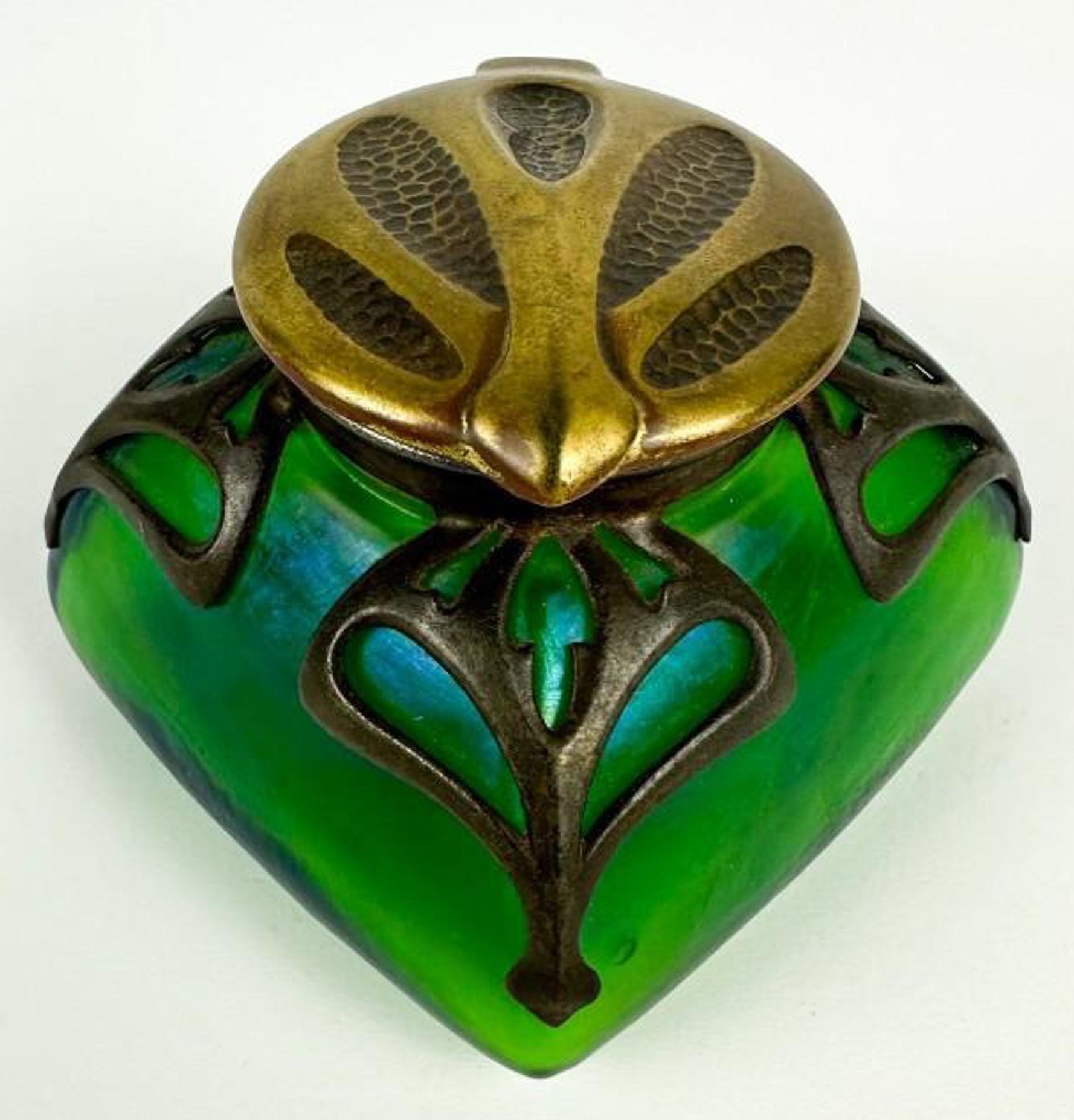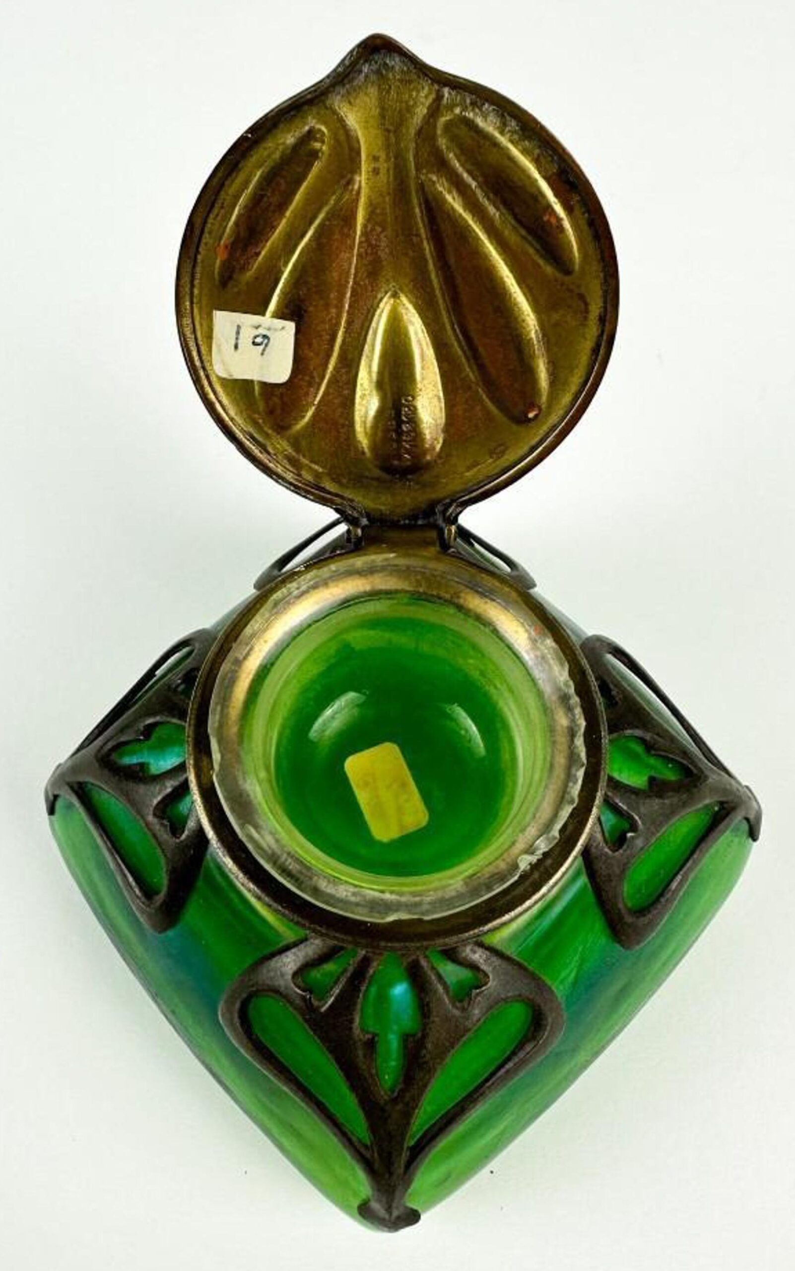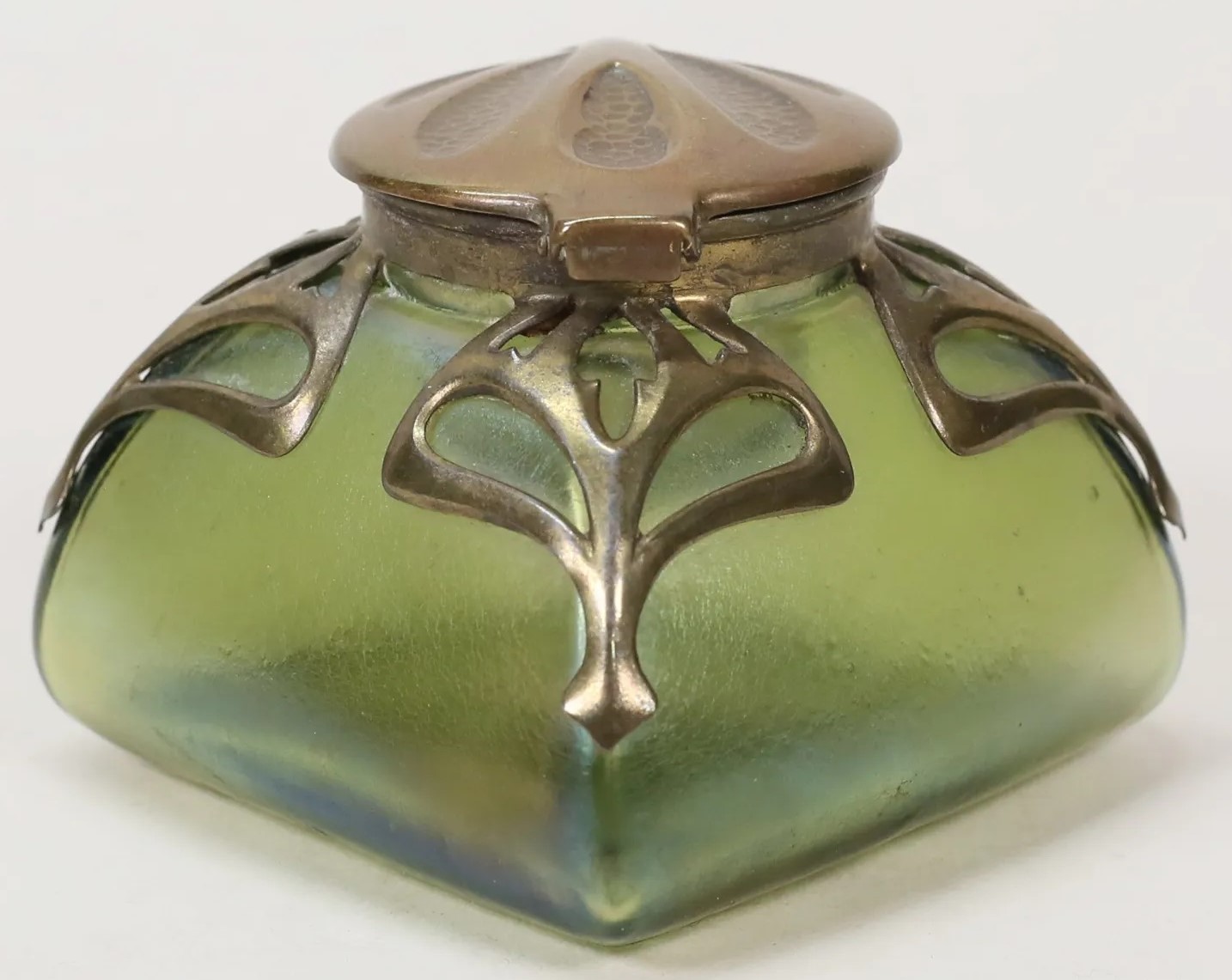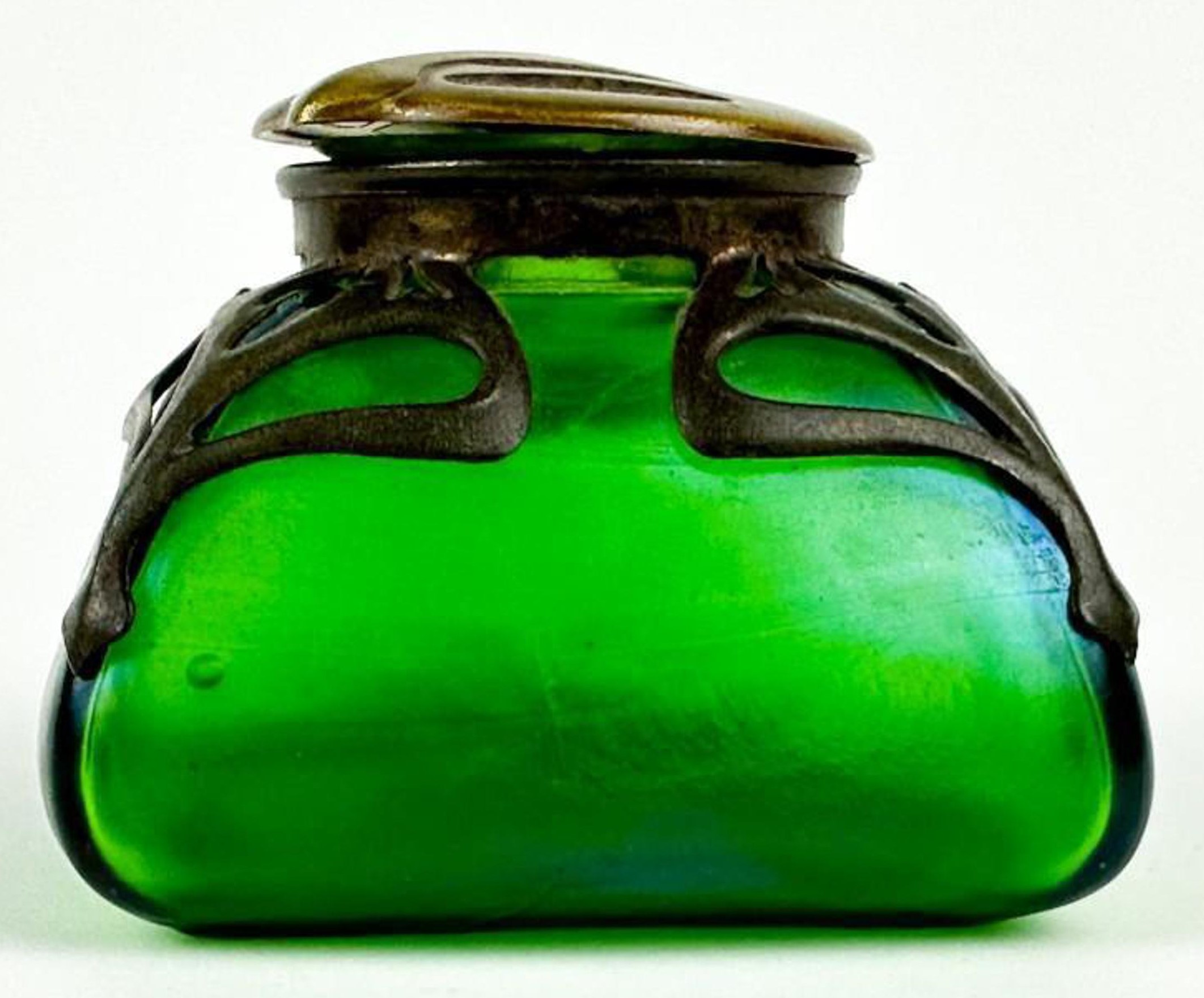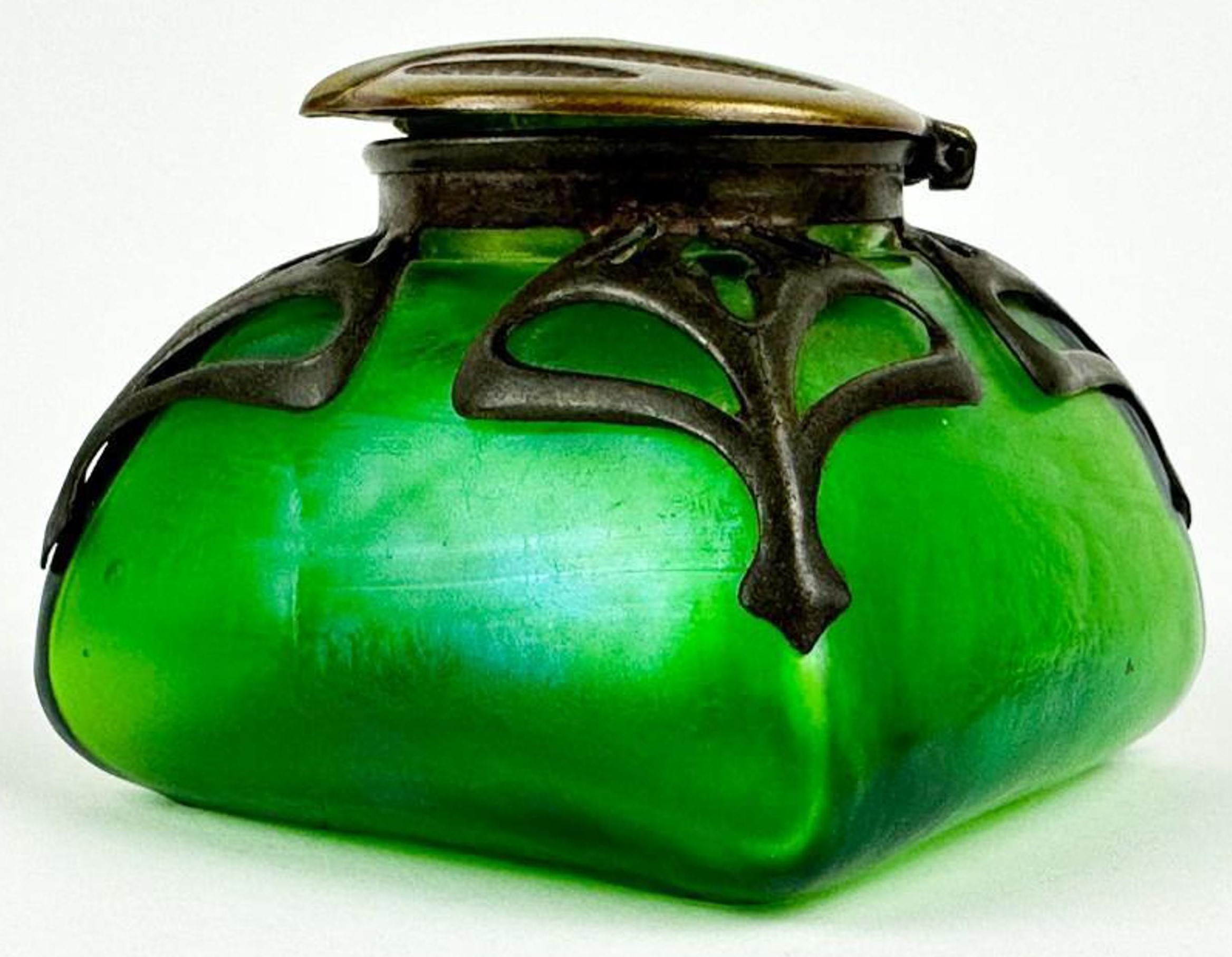 Attributed to Stölzle & Sons, shown are two Art Nouveau art glass inkwells. Both were made in shades of green with ornamental brass mounting, and a hinged foliage form lid.