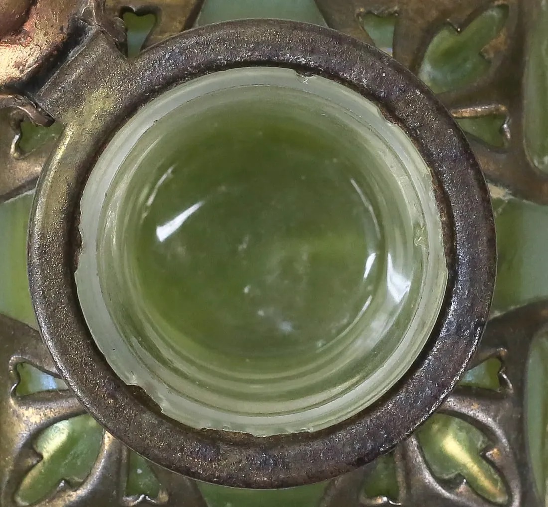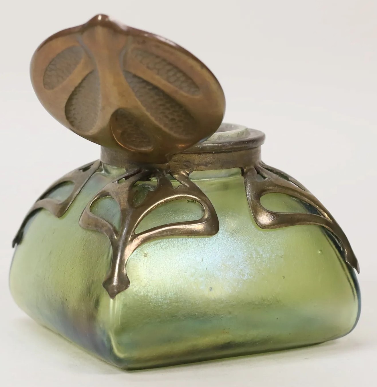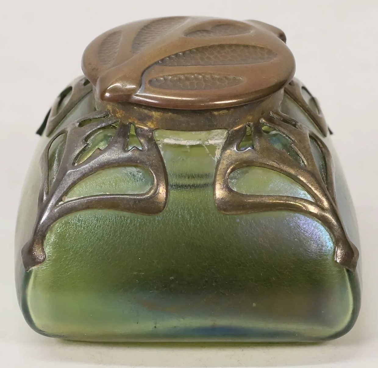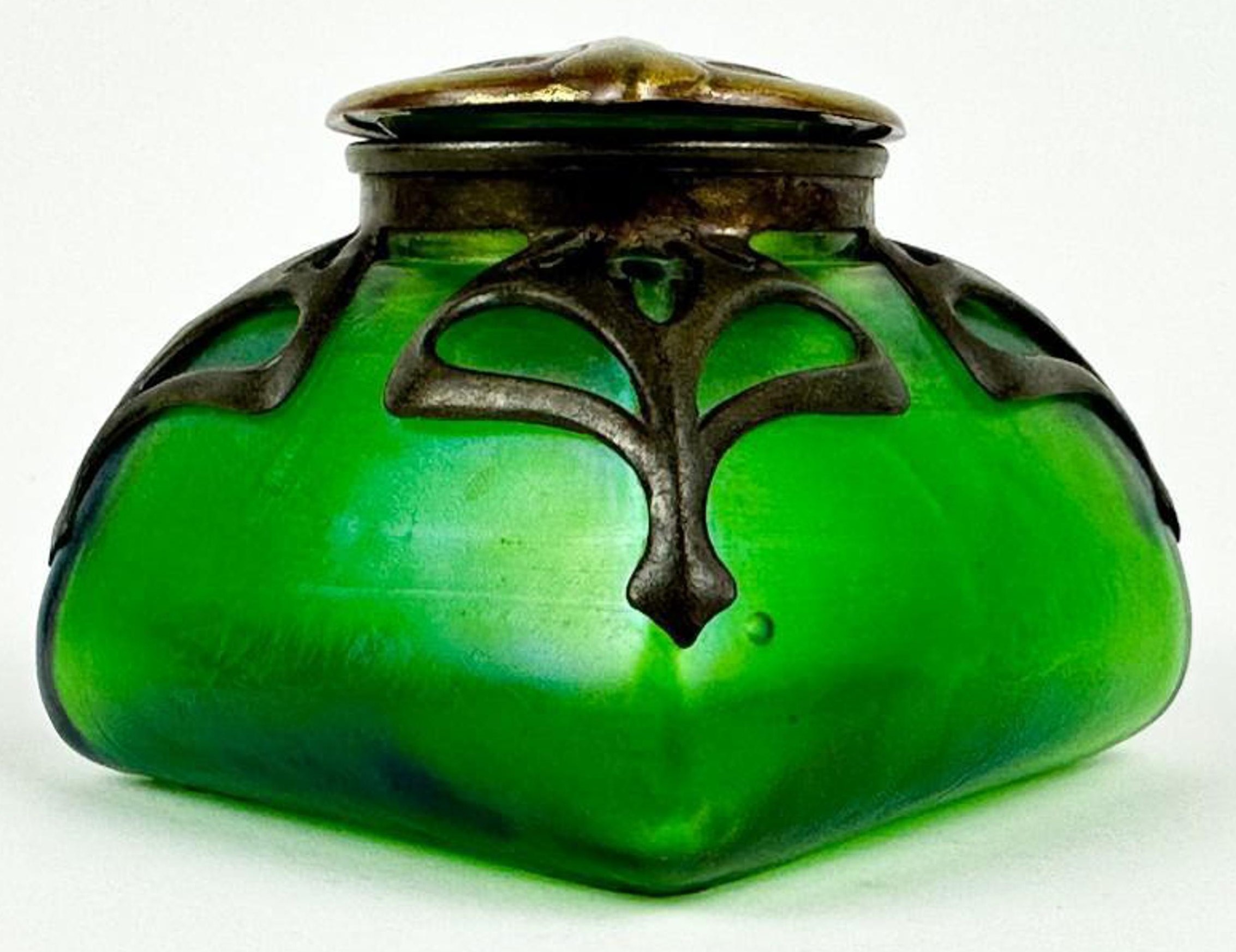 Attributed to Stölzle & Sons, shown are two Art Nouveau art glass inkwells. Both were made in shades of green with ornamental brass mounting, and a hinged foliage form lid.