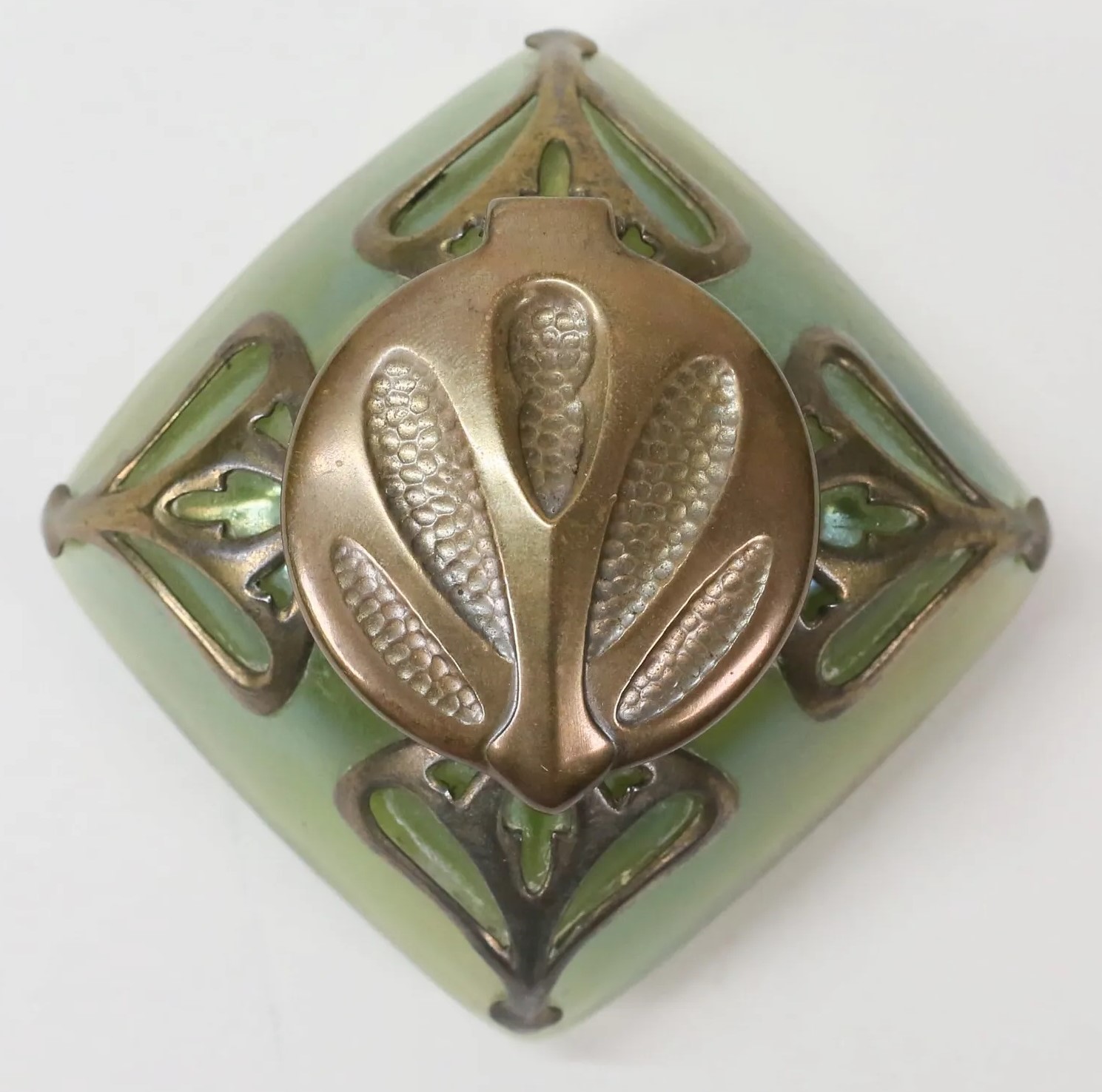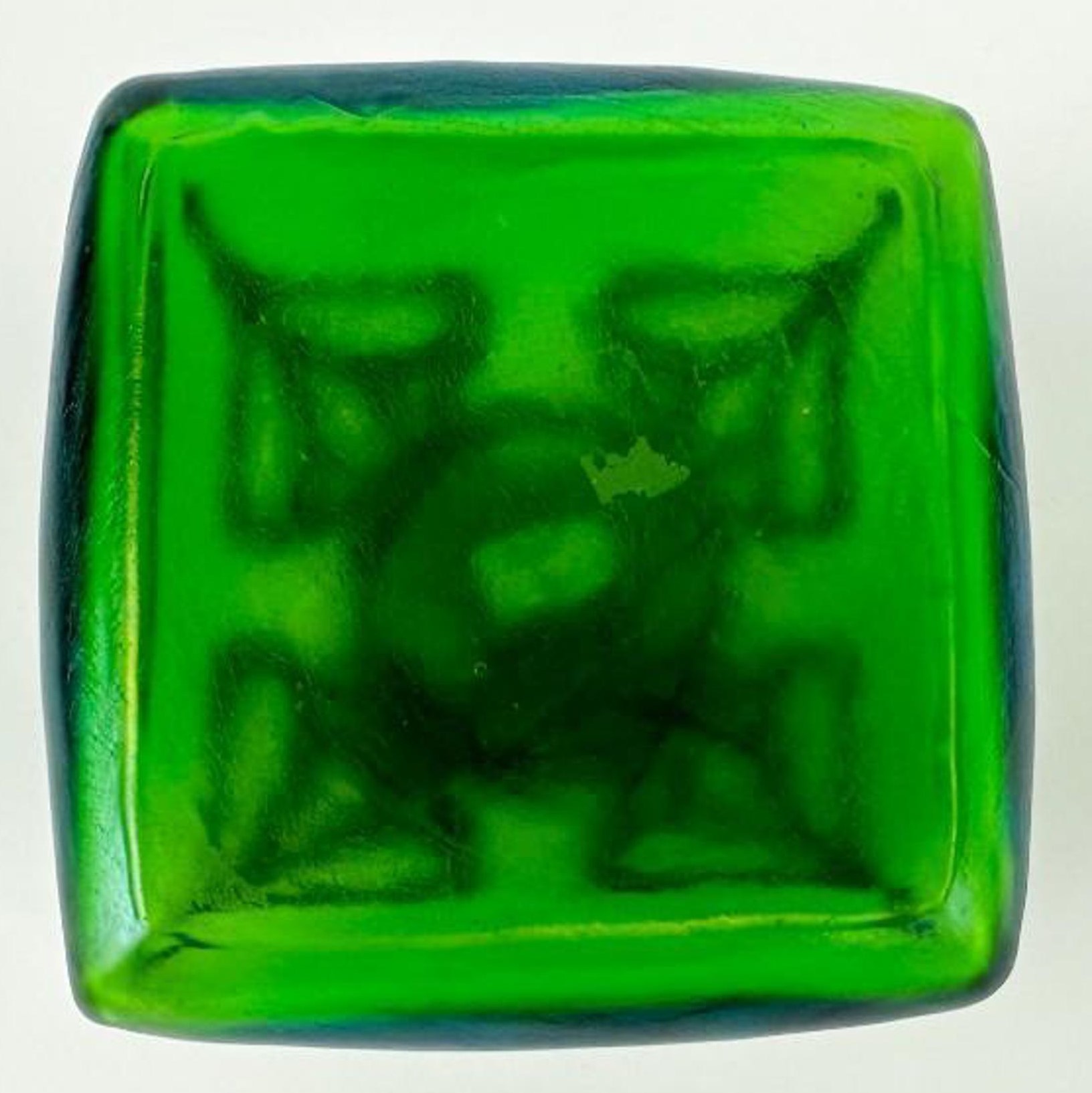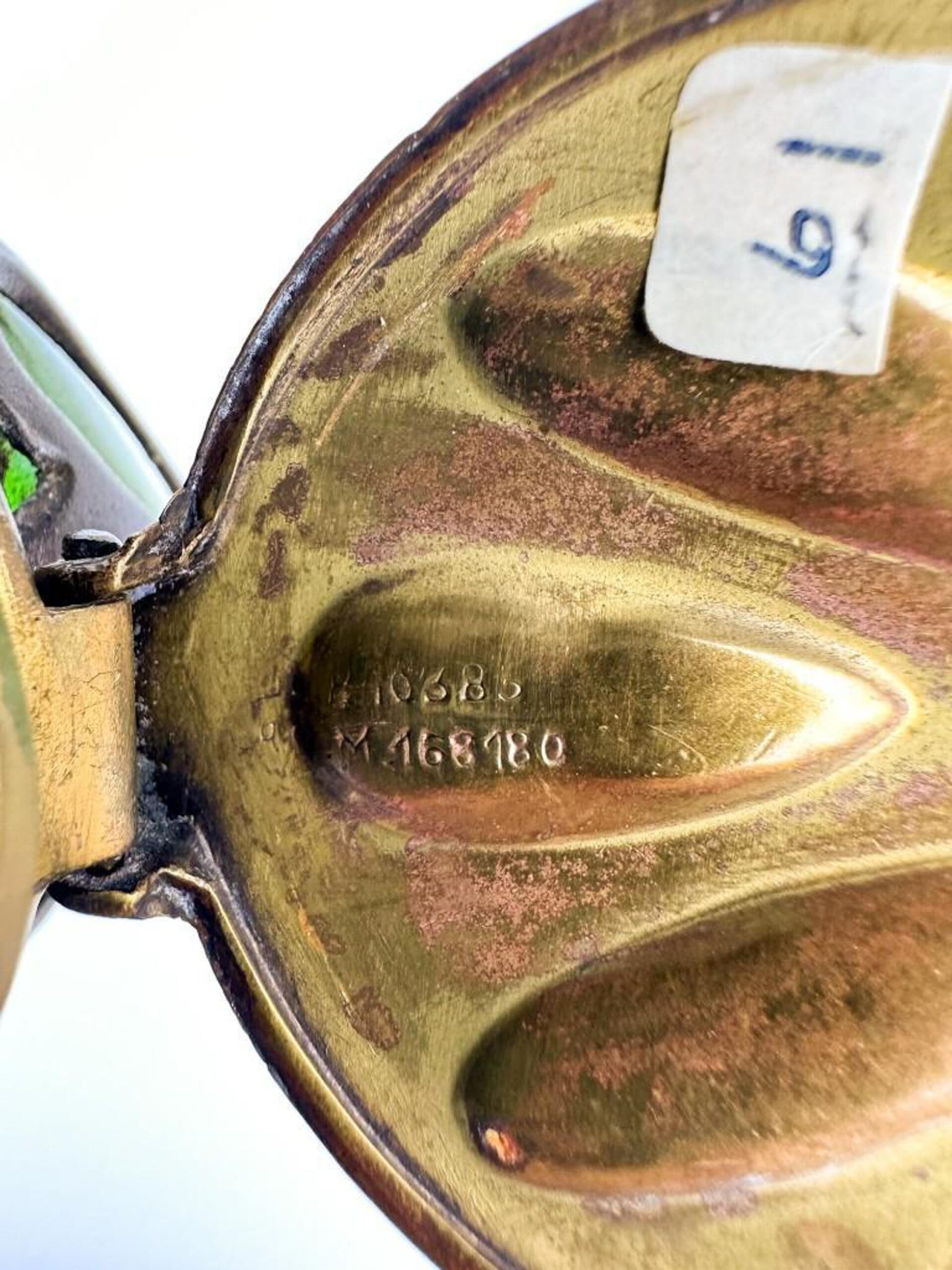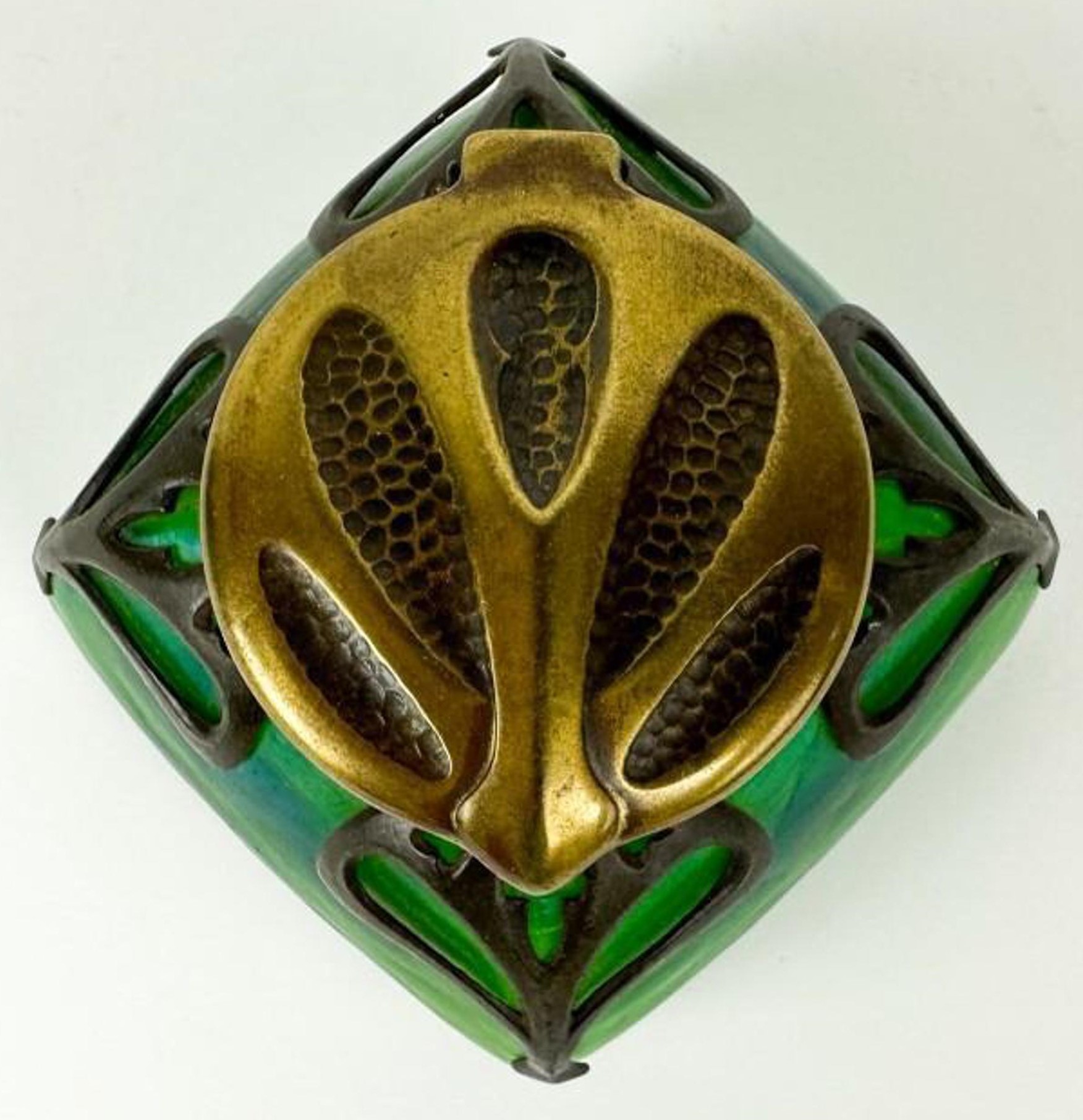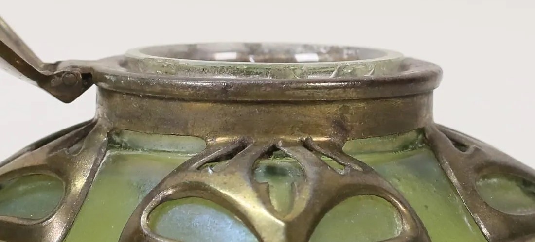 Attributed to Stölzle & Sons, shown are two Art Nouveau art glass inkwells. Both were made in shades of green with ornamental brass mounting, and a hinged foliage form lid.