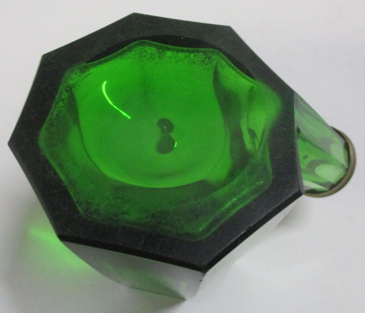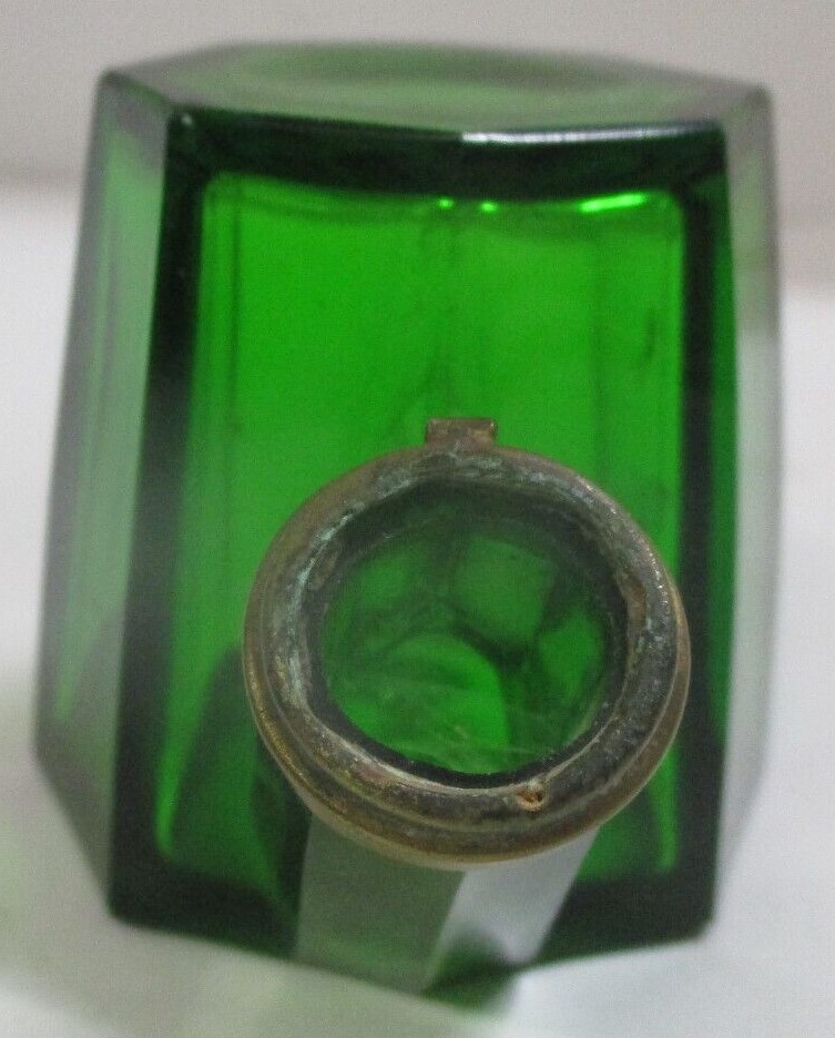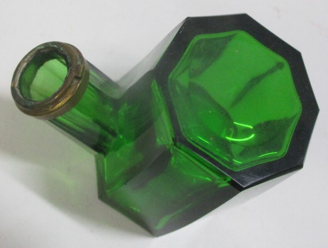 Green glass teakettle ink with eight nearly horizontal panels, flat top, and base. This was made with a simplistic mold and dates early. It’s lid / cap is missing.
