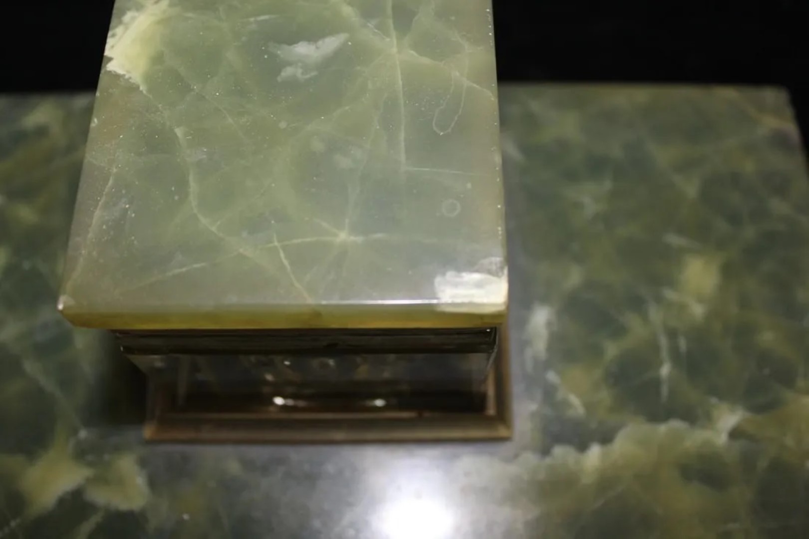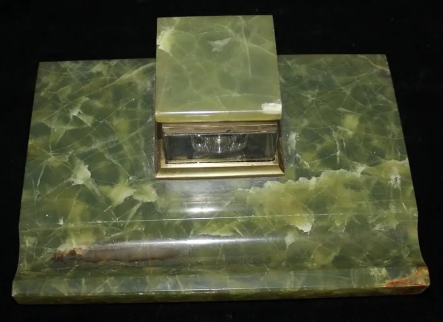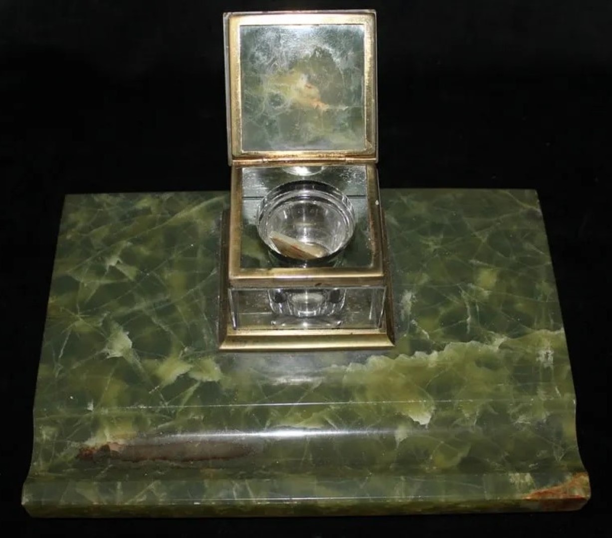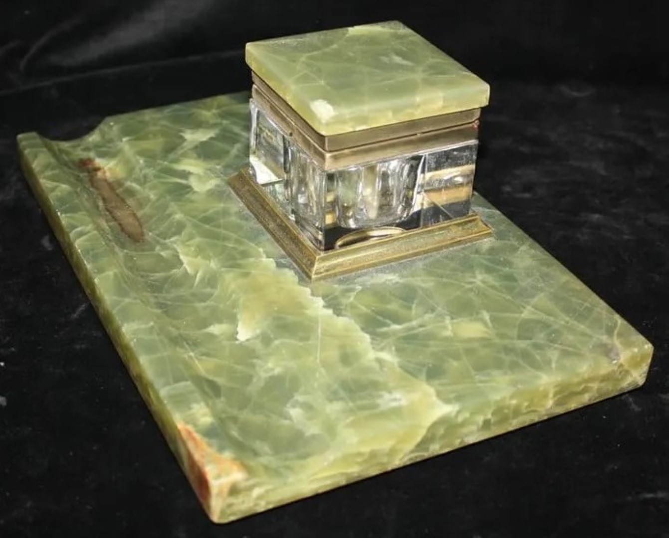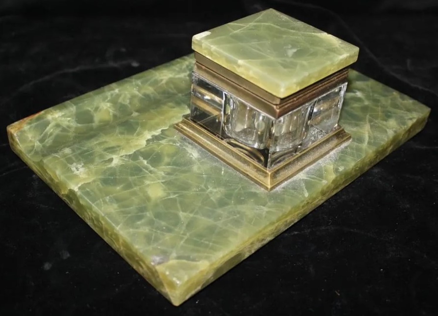 This inkstand has a rectangular base made of marbled green onyx. It holds a square, clear glass inkwell with a matching green onyx lid. In front is a large pen channel.