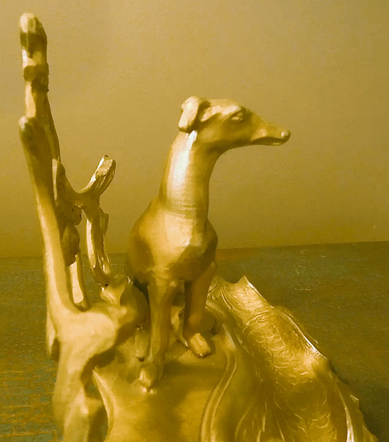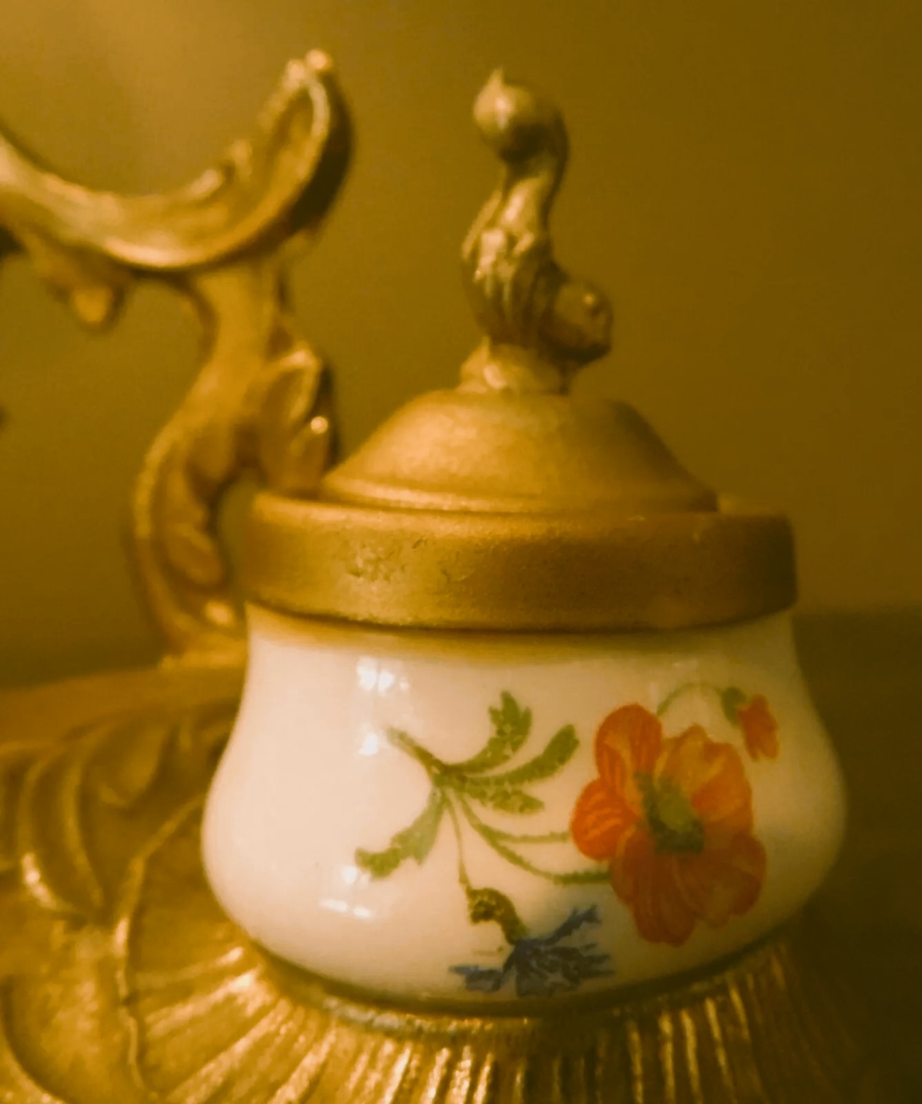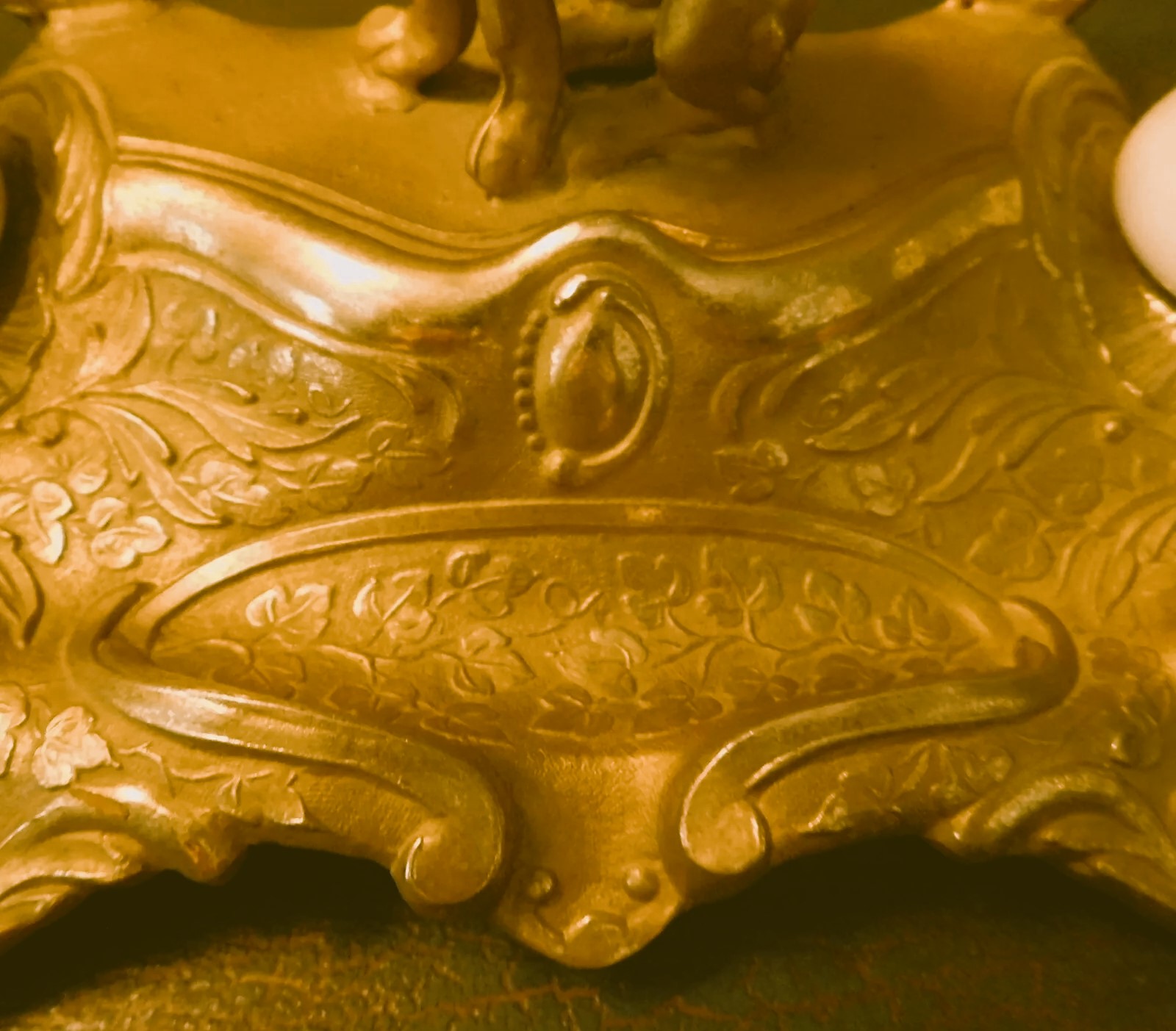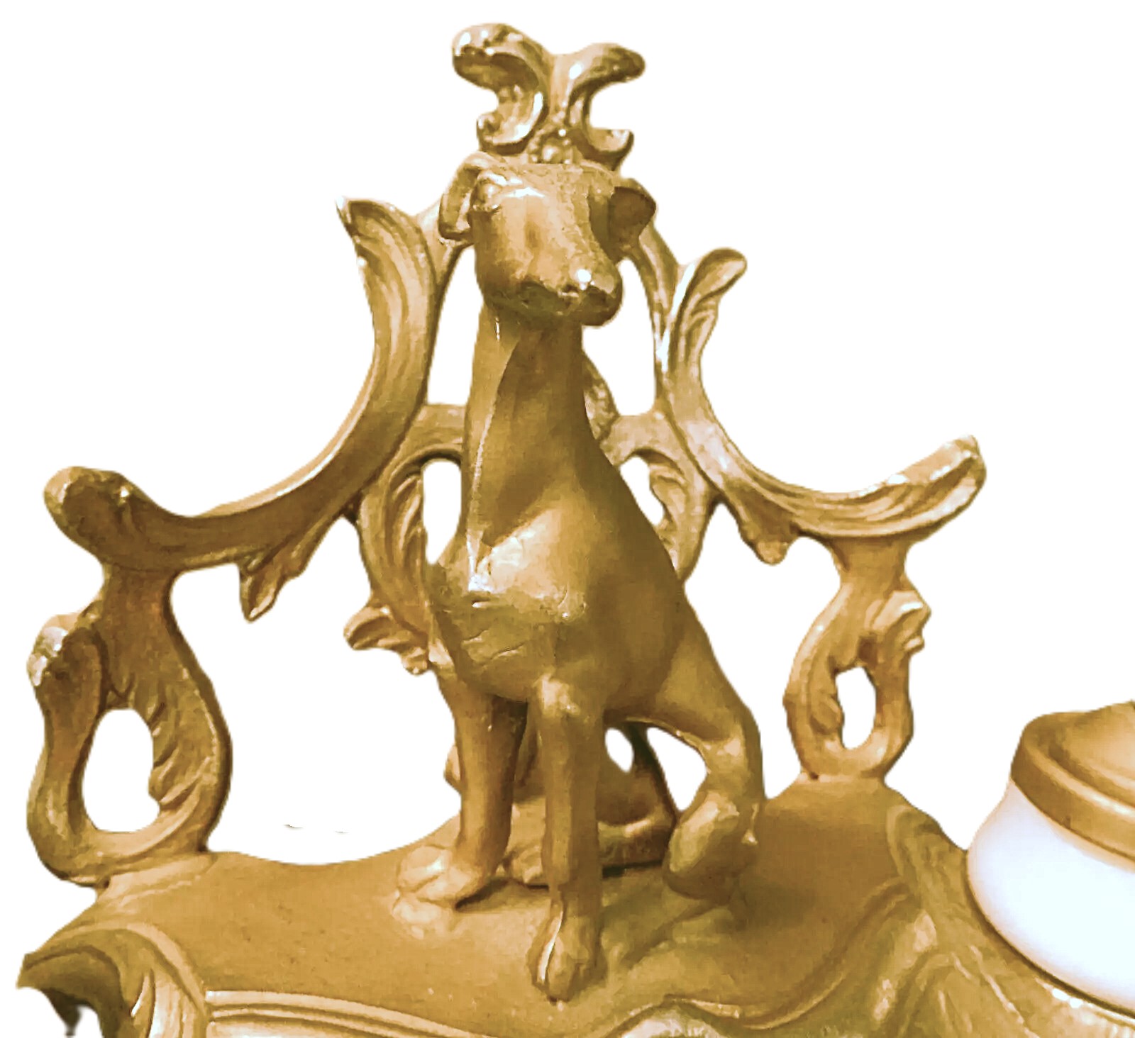 This Art Nouveau double inkstand features a sitting dog (Greyhound or Whippet). The dog is surrounded by ornate, gilded metalwork with intricate designs and scrolls. On either side of the dog are glazed pottery inkwells, each with a lid topped by a fish-shaped finial. The inkwells are decorated with floral patterns. The underside of the inkstand is impressed with the markings “Made in Italy” and “MM”.