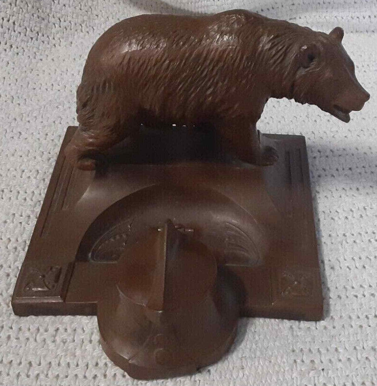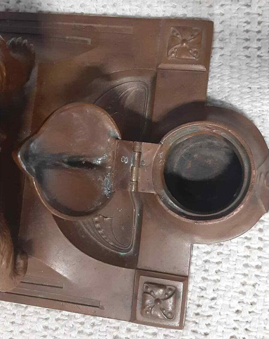 Metal bear standing behind a hinge-covered inkwell (missing the insert).