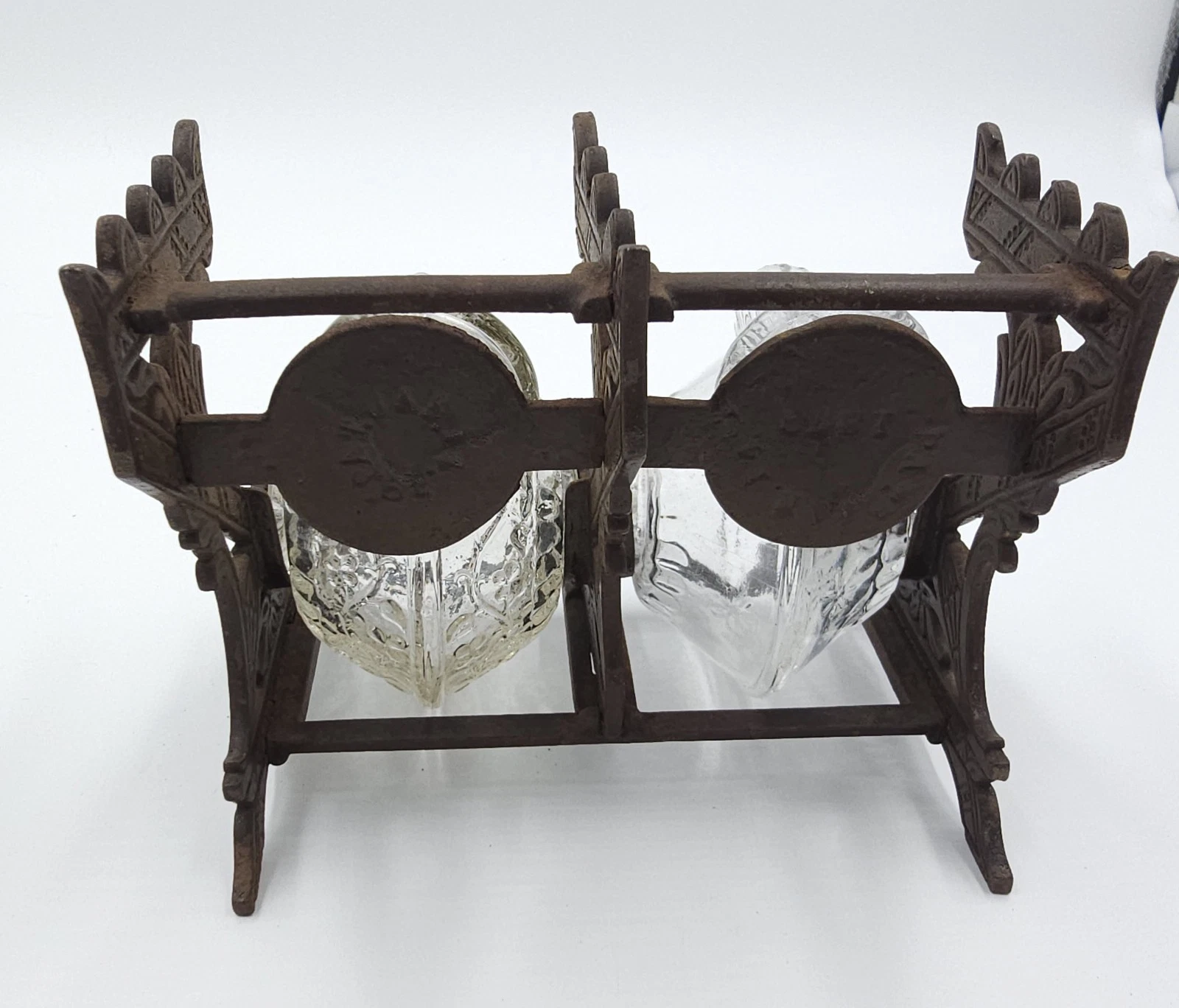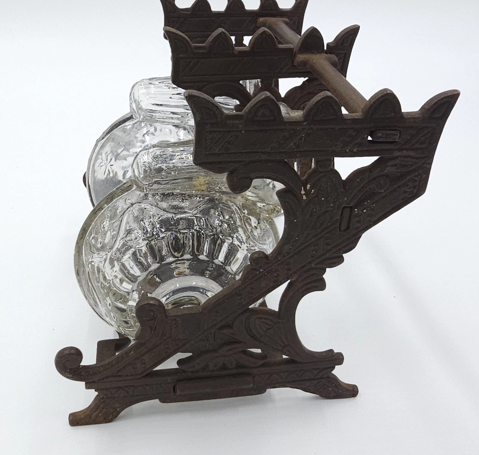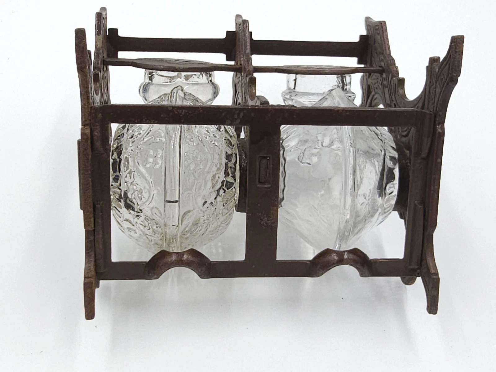 This cast-iron double revolving inkstand was manufactured by Judd Manufacturing Co. or H.L. Judd Co. of Wallingford, CT circa 1879 and later. The inkstand features two blown-mold glass reservoirs. There is a patent date embossed on the back of the reservoir bottle’s stopple plate, and corresponds to the W. F. Redding’s patent US000211307.