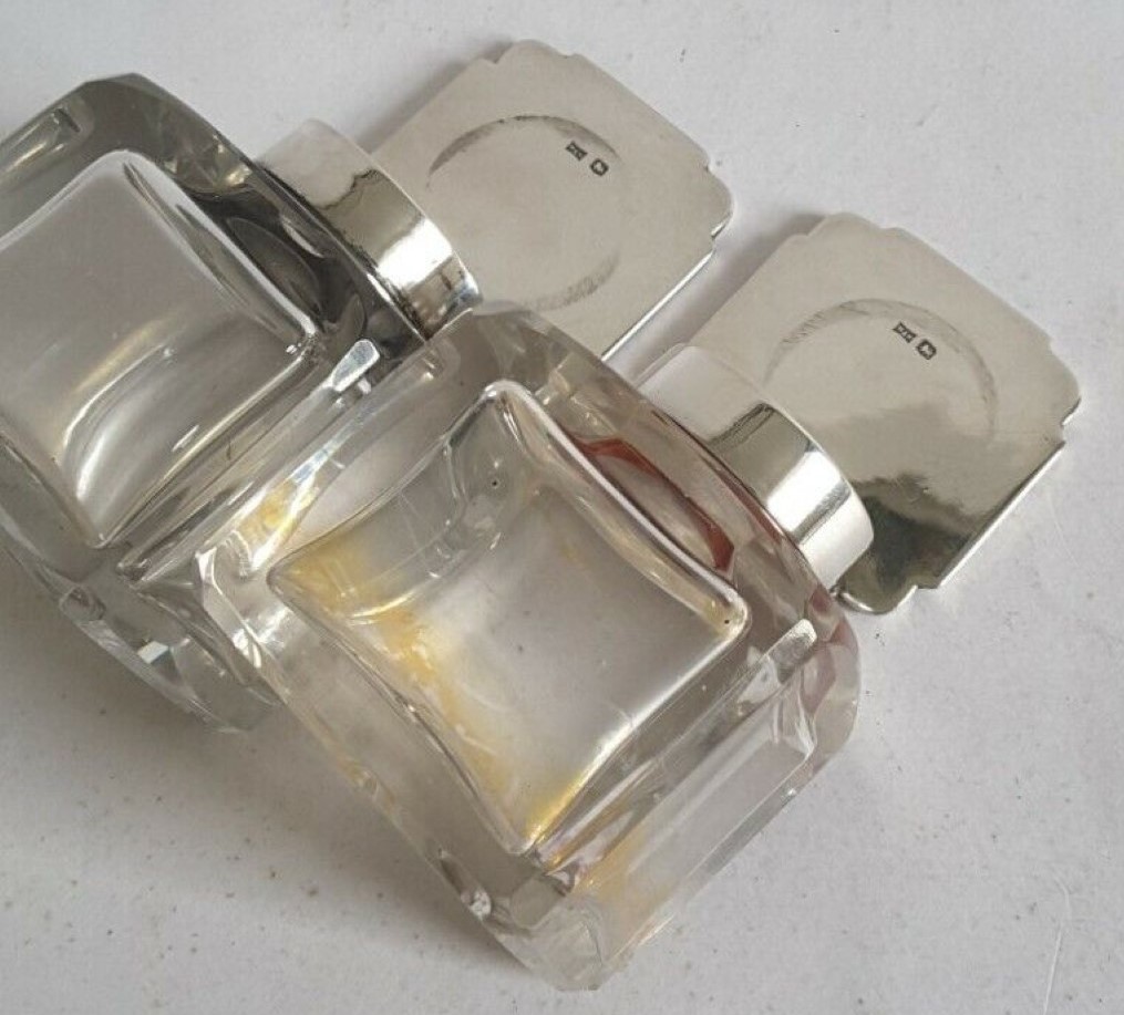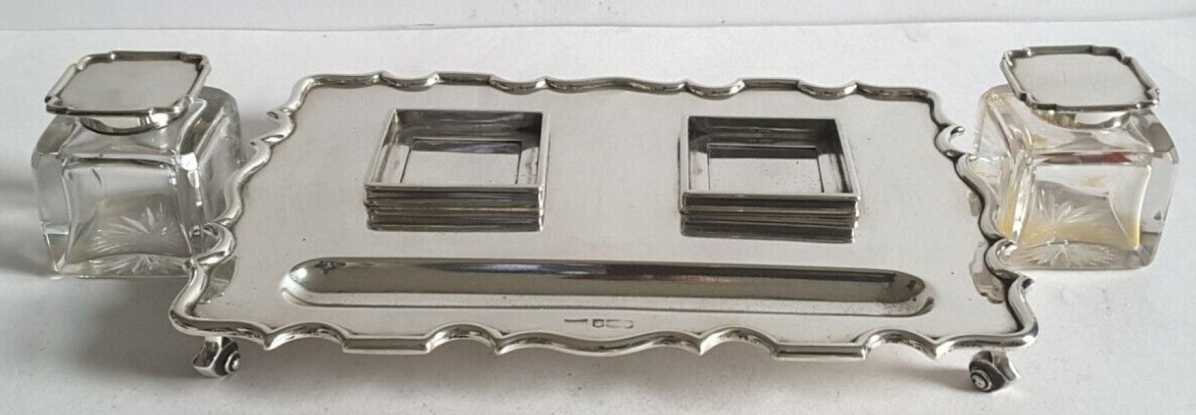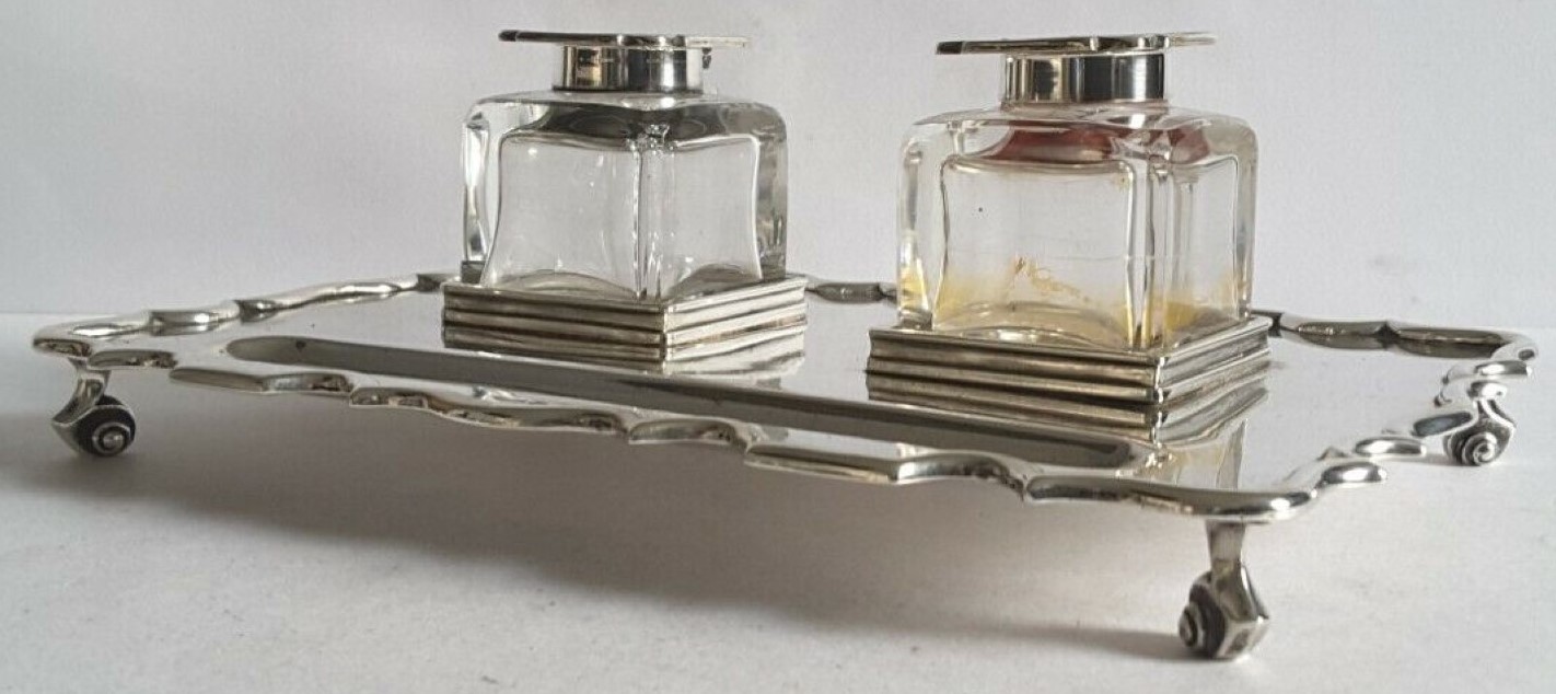Solid silver inkstand – two ink bottles with silver lids rest on a silver tray with four knurl design legs, shaped edging, and a pen channel. Hallmarked for Sheffield, 1926, with the Walker & Hall flag insignia and hallmark.